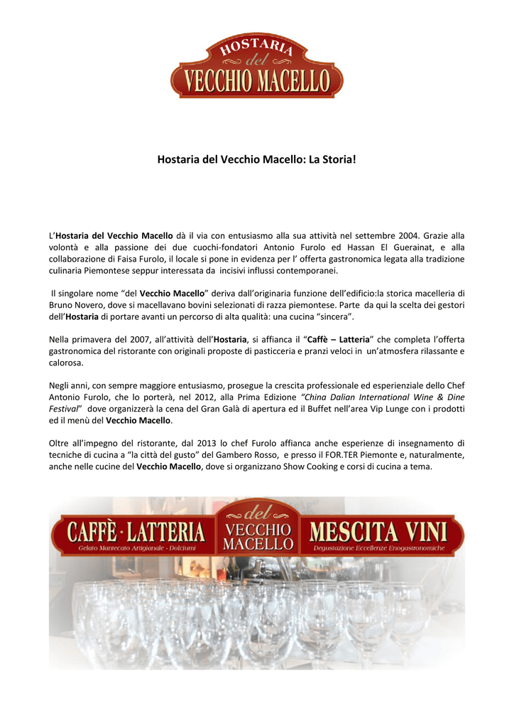 Hostaria del Vecchio Macello: La Storia! L’Hostaria del Vecchio Macello dà il via con entusiasmo alla sua attività nel settembre 2004. Grazie alla volontà e alla passione dei due cuochi-fondatori Antonio Furolo ed Hassan El Guerainat, e alla collaborazione di Faisa Furolo, il locale si pone in evidenza per l’ offerta gastronomica legata alla tradizione culinaria Piemontese seppur interessata da incisivi influssi contemporanei. Il singolare nome “del Vecchio Macello” deriva dall’originaria funzione dell’edificio:la storica macelleria di Bruno Novero, dove si macellavano bovini selezionati di razza piemontese. Parte da qui la scelta dei gestori dell’Hostaria di portare avanti un percorso di alta qualità: una cucina “sincera”. Nella primavera del 2007, all’attività dell’Hostaria, si affianca il “Caffè – Latteria” che completa l’offerta gastronomica del ristorante con originali proposte di pasticceria e pranzi veloci in un’atmosfera rilassante e calorosa. Negli anni, con sempre maggiore entusiasmo, prosegue la crescita professionale ed esperienziale dello Chef Antonio Furolo, che lo porterà, nel 2012, alla Prima Edizione “China Dalian International Wine & Dine Festival” dove organizzerà la cena del Gran Galà di apertura ed il Buffet nell’area Vip Lunge con i prodotti ed il menù del Vecchio Macello. Oltre all’impegno del ristorante, dal 2013 lo chef Furolo affianca anche esperienze di insegnamento di tecniche di cucina a “la città del gusto” del Gambero Rosso, e presso il FOR.TER Piemonte e, naturalmente, anche nelle cucine del Vecchio Macello, dove si organizzano Show Cooking e corsi di cucina a tema. Agnolotti del plin al ripieno di faraona con nocciola tonda gentile dell’azienda agricola Negro Ingredienti per 4 persone LA PASTA ALL’UOVO: - 200gr di farina tipo 00 2 uova impastare fino a rendere l’impasto elastico ed omogeneo, lasciare riposare per 1 ora in frigorifero nella pellicola trasparente IL RIPIENO: - 300gr di petto di faraona - 1 albume - 2 cucchiai di parmigiano grattugiato - 100 gr di besciamella - 2 foglie di salvia - olio di nocciole - profumo di aglio - sale e pepe bianco q.b. passare tutti gli ingredienti nel mixer e rendere il composto omogeneo GLI AGNOLOTTI Sul piano di lavoro, stendere con matterello o sfogliatrice la pasta all’uovo e con la rotella fare delle strisce lunghe alte circa 7 cm, mettere il ripieno in un sac à poche e formare sopra la striscia di pasta una sorta di grissino. A questo punto con il pollice e l’indice chiudere pizzicando la sfoglia e tagliare con la rotella rigata dandogli la tipica forma del plin. LA GUARNIZIONE: - 100gr di burro - 50gr di nocciole tostare le nocciole in forno per 5 minuti a 180°, una volta tostate frantumarle leggermente così da ottenere un effetto “granella” COMPOSIZIONE DEL PIATTO: in una padella scaldare il burro fino a renderlo spumeggiante. Cuocere gli agnolotti in acqua salata per 2 minuti, scolarli nel burro emulsionando il tutto aggiungendo dell’acqua di cottura. Impiattare in un piatto fondo e guarnire con le nocciole tostate, scaglie di parmigiano e qualche goccia di olio di nocciola. Cappone arrosto ripieno alle castagne Ingredienti per 4 persone - 4 cosce di cappone disossate con pelle 200 gr di castagne 1 uovo 2 fette di lardo parmigiano grattugiato (q.b) aglio, rosmarino e salvia (q.b) IL RIPIENO: sgusciare ed eliminare la prima pelle delle castagne e cuocerle in acqua salata per 40 minuti circa. Scolarle, privarle della seconda pelle e lasciarle freddare. Preparare un battuto con il resto degli ingredienti. IL CAPPONE: salare e pepare le cosce, farcirle con il battuto e le castagne sbriciolate. Chiudere le cosce in carta di alluminio e cuocere arrosto in forno a 120° per circa 3 ore A cottura ultimata lasciare riposare per 10 minuti fuori dal forno, scartare le cosce ed eliminare il grasso in eccesso e annaffiarle con il fondo di cottura Cuore di carciofo con uovo pochè e fonduta di parmigiano reggiano Ingredienti per 4 persone - 4 carciofi con spine 4 uova 200ml latte 50ml panna da cucina 100gr parmigiano reggiano 1 cucchiaio di amido di mais 2 limoni aceto bianco sale e pepe I CARCIOFI: Mondare i carciofi delle foglie esterne e con l’aiuto di un cucchiaino togliere la barbetta interna, eliminare il gambo ed immergerli in acqua fredda e 1 limone spremuto per evitarne l’ossidazione . In una pentola bollire l’acqua e far cuocere i carciofi per 5 minuti poi, una volta cotti, scolarli e riporli a testa in giù su un panno asciutto. LA FONDUTA: Unire il latte e la panna in un tegame e portare ad ebollizione, inserire e sciogliere il parmigiano, a parte in un ciotolino sciogliere l’amido di mais con acqua fredda ed aggiungerlo alla fonduta per dargli una consistenza cremosa LE UOVA: In un pentolino mettere 2/3 di acqua ed 1/3 di aceto bianco e portare ad ebollizione. Rompere l’uovo in un mestolo mantenendolo intatto. Spegnere l’acqua, con l’aiuto di un cucchiaio creare un vortice nell’acqua e con il mestolo, calare l’uovo nel liquido e cuocerlo per circa 3 minuti. Raccogliere l’uovo con una schiumarola e tamponarlo con della carta da cucina. Ripetere il procedimento per le restanti uova COMPOSIZIONE DEL PIATTO: in un piatto fondo, versare a specchio la fonduta calda, adagiare il carciofo in piedi creando un fiore, mettere al centro l’uovo in camicia e guarnire con del pepe Cremino alla nocciola Ingredienti per 4 persone - 120ml di latte 40ml di panna 90 gr di zucchero 60 gr. di pasta di nocciole 5 tuorli d’uovo 2 fogli di colla di pesce ½ stecca di vaniglia 400ml di panna 2 fogli di colla di pesce PROCEDIMENTO: Ammorbidire la colla di pesce immergendola in acqua fredda per alcuni minuti. In un pentolino scaldare 40ml di panna con il latte e la vaniglia A parte, montare i tuorli con lo zucchero e la pasta di nocciole quindi unire sul fuoco il composto con latte e panna, mescolando con una frusta per circa 3 minuti. Togl