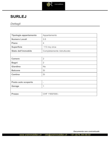 SURLEJ Dettagli Tipologia appartamento Appartamento Numero Locali 3.5 Piano 4 Superficie 113 mq circa Stato dell’immobile Completamente ristrutturato Camere 2 Bagni 2 Giardino No Balcone Sì Cantina Sì Posto auto scoperto - Garage 1 Prezzo CHF 1'650'000.- Documentononcontrattuale www.sreimmobilien.ch - [email protected] - +41 (0)76.344.68.50 Descrizione proprietà Appartamento di charme situato a Surlej, in posizione tranquilla, soleggiata e dominante. La proprietà è composta da ingresso con guardaroba, soggiorno doppio con camino e terrazzo, zona pranzo, cucina separata, due camere doppie e due bagni. La proprietà si sviluppa su due piani. L’ottima esposizione, che rendono l’appartamento molto soleggiato, la vista mozzafiato e le finiture tipiche montane (frutto di una recente completa rinnovazione) ne fanno un oggetto di indubbio pregio. La proprietà permette inoltre di raggiungere comodamente le piste da sci (a circa 200 m), i boschi circostanti e i laghi nelle vicinanze. Completano la proprietà una cantina e un posteggio in autorimessa. Documentononcontrattuale www.sreimmobilien.ch - [email protected] - +41 (0)76.344.68.50 Documentononcontrattuale www.sreimmobilien.ch - [email protected] - +41 (0)76.344.68.50 Documentononcontrattuale www.sreimmobilien.ch - [email protected] - +41 (0)76.344.68.50 Documentononcontrattuale www.sreimmobilien.ch - [email protected] - +41 (0)76.344.68.50 Documentononcontrattuale www.sreimmobilien.ch - [email protected] - +41 (0)76.344.68.50 Documentononcontrattuale www.sreimmobilien.ch - [email protected] - +41 (0)76.344.68.50 Documentononcontrattuale www.sreimmobilien.ch - [email protected] - +41 (0)76.344.68.50 Documentononcontrattuale www.sreimmobilien.ch - [email protected] - +41 (0)76.344.68.50