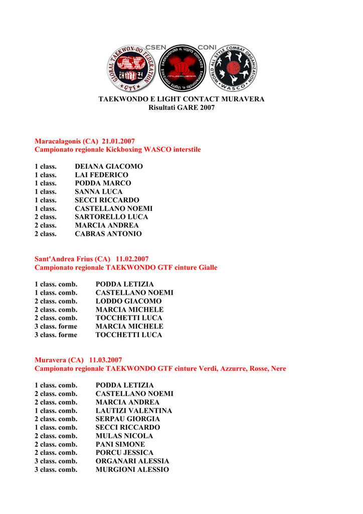 TAEKWONDO E LIGHT CONTACT MURAVERA Risultati GARE 2007 Maracalagonis (CA) 21.01.2007 Campionato regionale Kickboxing WASCO interstile 1 class. 1 class. 1 class. 1 class. 1 class. 1 class. 2 class. 2 class. 2 class. DEIANA GIACOMO LAI FEDERICO PODDA MARCO SANNA LUCA SECCI RICCARDO CASTELLANO NOEMI SARTORELLO LUCA MARCIA ANDREA CABRAS ANTONIO Sant'Andrea Frius (CA) 11.02.2007 Campionato regionale TAEKWONDO GTF cinture Gialle 1 class. comb. 1 class. comb. 2 class. comb. 2 class. comb. 2 class. comb. 3 class. forme 3 class. forme PODDA LETIZIA CASTELLANO NOEMI LODDO GIACOMO MARCIA MICHELE TOCCHETTI LUCA MARCIA MICHELE TOCCHETTI LUCA Muravera (CA) 11.03.2007 Campionato regionale TAEKWONDO GTF cinture Verdi, Azzurre, Rosse, Nere 1 class. comb. 2 class. comb. 2 class. comb. 1 class. comb. 2 class. comb. 1 class. comb. 2 class. comb. 2 class. comb. 2 class. comb. 3 class. comb. 3 class. comb. PODDA LETIZIA CASTELLANO NOEMI MARCIA ANDREA LAUTIZI VALENTINA SERPAU GIORGIA SECCI RICCARDO MULAS NICOLA PANI SIMONE PORCU JESSICA ORGANARI ALESSIA MURGIONI ALESSIO 3 class. comb. 3 class. comb. 1 class. comb. 3 class. comb. 3 class. comb. 1 class. forme 3 class. forme 2 class. forme 3 class. forme LARA FABIO TRONCI MICHELE LAI FEDERICO SANNA LUCA DEIANA GIACOMO MULAS NICOLA SERPAU GIORGIA LAI FEDERICO DEIANA GIACOMO Porto Carras (GRECIA) 26.03.2007 Campionato Europeo TAEKWONDO GTF cinture Verdi, Azzurre, Rosse, Nere 1 class. comb. NERE SANNA LUCA 2 class. comb. VERDE CASTELLANO NOEMI 2 class. comb. VERDE LAI FEDERICO 3 class. comb. NERA II DAN OLLA FABIANO Olia Speciosa (CA) 22.04.2007 Campionato regionale WASCO Light contact 1 class. comb. 3 class. comb. 3 class. comb. 1 class. comb. 2 class. comb. 2 class. comb. 2 class. comb. 1 class. comb. 1 class. comb. 2 class. comb. 3 class. comb. 1 class. comb. 1 class. comb. 1 class. comb. 2 class. comb. 1 class. comb. 3 class. comb. 3 class. comb. 2 class. comb. 1 class. comb. 3 class. comb. 1 class. comb. MULAS NICOLA PELLEGRINO NICOLE MARCIA ANDREA CONGIU MATTIA CONGIU ALESSANDRO SECCI RICCARDO MARCIA MICHELE PANI SIMONE PORCU JESSICA ORGANARI ALESSIA DEIANA GIACOMO LARA FABIO ORRU' MICHELE LAI FEDERICO SANNA LUCA LODDO GIACOMO PODDA LETIZIA PILLONI ALBERTO CIREDDU ANDREA SERPAU GIORGIA LAUTIZI VALENTINA PODDA MARCO Ballao (CA) 06.05.2007 Campionato regionale TAEKWONDO GTF cinture Gialle,Verdi, Azzurre, Rosse 3 class. comb. 2 class. comb. 2 class. comb. 1 class. comb. 2 class. comb. 1 class. comb. 1 class. comb. 3 class. comb. 3 class. comb. 1 class. comb. 2 class. forme 3 class. comb. 2 class. comb. 1 class. comb. 2 class. comb. 1 class. comb. 2 class. forme 1 class. comb. PODDA LETIZIA CONGIU ALESSANDRO ZUCCA EFISIO PORCU JESSICA CABRAS ANTONIO SECCI RICCARDO MULAS NICOLA ORRU' MICHELE CERINA LUCA ORGANARI ALESSIA ORGANARI ALESSIA SARTORELLO LUCA CIREDDU ANDREA LARA FABIO LODDO GIACOMO LAI FEDERICO LAI FEDERICO CONGIU MATTIA Cagliari 01.07.2007 Campionato Mondiale WASCO Kickboxing 1 class. Mini-Pewee 0-20 Light SECCI RICCARDO 1 class. Mini-Pewee 21-27A Light MULAS NICOLA 2 class. Mini-Pewee 21-27A Light ORRU' MICHELE 2 class. Mini-Pewee 21-27B Light LARA FABIO 2 class. Mini-Pewee 21-27C Light PODDA MARCO 1 class. Mini-Pewee 21-27D Light CERINA LUCA 2 class. Mini-Pewee 21-27D Light CIREDDU ANDREA 1 class. Pewee 0-45 Light SERPAU GIORGIA 1 class. Mini-Pewee 21-27A Semi MULAS NICOLA 1 class. Mini-Pewee 21-27A Semi SECCI RICCARDO 1 class. Mini-Pewee 0-27A Semi CIREDDU ANDREA 1 class. Pewee 0-35A Semi CONGIU ALESSANDRO 3 class. Pewee 36-46A Semi LODDO GIACOMO 1 class. Pewee OVER 45 Semi DEIANA GIACOMO 1 class. Pewee 0-45 Semi SERPAU GIORGIA 2 class. TKD SENIOR OLLA FABIANO 1 class. TKD CADETS PORCU JESSICA 2 class. TKD JUNIOR SANNA LUCA 2 class. TKD SENIOR C OLLA FABIANO 1 class. TKD CADETS Semi PORCU JESSICA 2 class. TKD CADETS Semi SANNA LUCA
