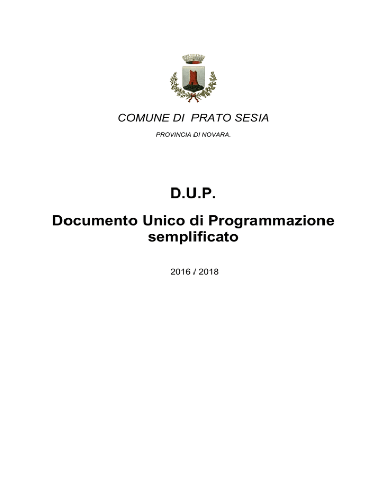 COMUNE DI PRATO SESIA PROVINCIA DI NOVARA. D.U.P. Documento Unico di Programmazione semplificato 2016 / 2018 Quadro normativo di riferimento Il Documento unico di programmazione nella forma semplificata, è previsto per gli enti locali con popolazione fino a 5.000 abitanti, dal Decreto Legislativo 23.06.2011 n. 118, come aggiornato dal Decreto Ministeriale 20.05.2015. Il Documento individua, in coerenza con il quadro normativo di riferimento e con gli obiettivi generali di finanza pubblica, tenendo conto della situazione socio economica del proprio territorio, le principali scelte che caratterizzano il programma dell’amministrazione da realizzare nel corso del mandato amministrativo e gli indirizzi generali di programmazione riferiti al periodo di mandato. Ogni anno saranno verificati gli indirizzi generali e i contenuti della programmazione, con particolare riferimento al reperimento e impiego delle risorse finanziarie e alla sostenibilità economico – finanziaria. A seguito della verifica è possibile operare motivatamente un aggiornamento degli indirizzi generali approvati. In considerazione degli indirizzi generali di programmazione al termine del mandato, l’amministrazione rende conto del proprio operato attraverso la relazione di fine mandato, di cui all’art. 4 del Decreto Legislativo 6 settembre 2011, n. 149, quale dichiarazione certificata delle iniziative intraprese, dell’attività amministrativa e normativa e dei risultati riferibili alla programmazione dell’Ente e di bilancio durante il mandato. Il DUP semplificato, quale guida e vincolo ai processi di redazione dei documenti contabili di previsione dell’Ente, indica, per ogni singola missione/programma del bilancio, gli obiettivi che l’Ente intende realizzare negli esercizi considerati nel bilancio di previsione (anche se non compresi nel periodo di mandato). Gli obiettivi individuati per ogni missione / programma rappresentano la declinazione annuale e pluriennale degli indirizzi generali e costituiscono vincolo per i successivi atti di programmazione, in applicazione del principio della coerenza. L’individuazione delle finalità e la fissazione degli obiettivi per ogni missione/ programma deve “guidare”, negli altri strumenti di programmazione, l’individuazione degli atti e dei mezzi strumentali alla loro realizzazione e l’affidamento di obiettivi e risorse ai responsabili dei servizi. Gli obiettivi devono essere controllati annualmente a fine di verificarne il grado di raggiungimento e, laddove necessario, modificati, dandone adeguata giustificazione, per dare una rappresentazione veritiera e corretta dei futuri andamenti dell’Ente e del processo di formulazione dei programmi all’interno delle missioni. Il DUP semplificato comprende inoltre, relativamente all'arco temporale di riferimento del bilancio di previsione: a) gli obiettivi degli organismi facenti parte del gruppo amministrazione pubblica; b) l’analisi della coerenza delle previsioni di bilancio con gli strumenti urbanistici vigenti; c) la programmazione dei lavori pubblici, d) la programmazione del fabbisogno di personale; e) la programmazione delle alienazioni e della valorizzazione dei beni patrimoniali. La realizzazione dei lavori pubblici degli Enti locali deve essere svolta in conformità ad un programma triennale e ai suoi aggiornamenti annuali che sono ricompresi nel DUP. I lavori da realizzare nel primo anno del triennio sono compresi nell’elenco annuale che costituisce il documento di previsione per gli investimenti in lavori pubblici e il loro finanziamento. La programmazione del fabbisogno di personale deve assicurare le esigenze di funzionalità e di ottimizzazione delle risorse per il miglior funzionamento dei servizi compatibilmente con le disponibilità finanziarie e i vincoli di finanza pubblica. Al fine di procedere al riordino, gestione e valorizzazione del proprio patrimonio immobiliare, l’Ente, individua, redigendo apposito elenco, i singoli immobili di proprietà dell'Ente. Tra questi devono essere individuati quelli non strumentali all’esercizio delle proprie funzioni istituzionali e quelli suscettibili di valorizzazione ovvero di dismissione. Sulla base delle informazioni contenute nell’elenco deve essere predisposto il “Piano delle alienazioni e valorizzazioni patrimoniali” quale parte integrante del DUP. La ricognizione degli immobili è operata sulla base, e nei limiti, della documentazione esistente presso i propri archivi e uffici. L’iscrizione degli immobili nel piano determina una serie di effetti di natura giuridico – amministrativa previsti e disciplinati dalla legge. LE SCELTE DELL’AMMINISTRAZIONE Le linee programmatiche di mandato sono state presentate ed approvate dal Consiglio Comunale con delibera n. 6 del 05.06.2014 e abbraccia un arco temporale quinquennale. Si allega il programma amministrativo. Elenco degli organismi ed enti strumentali e società controllate e partecipate Piano di razionalizzazione delle società partecipate (articolo 1 commi 611 e seguenti della legge 190/2014) 1. Premessa Il comma 611 dell’art.1 della Legge 190/2014 dispone che, allo scopo di assicurare il “coordinamento della finanza pubblica, il contenimento della spesa, il buon andamento dell'azione amministrativa e la tutela della concorrenza e del mercato”, gli enti locali devono avviare un “processo di razionalizzazione” delle società e delle partecipazioni, dirette e indirette, che permetta di conseguirne una riduzione entro il 31 dicembre 2015. Lo stesso comma 611 indica i criteri generali cui si deve ispirare il “processo di razionalizzazione”: a) eliminare le società e le partecipazioni non indispensabili al perseguimento delle finalità istituzionali, anche mediante liquidazioni o cessioni; b) sopprimere le società che risultino composte da soli amministratori o da un numero di amministratori superiore a quello dei dipendenti; c) eliminare le partecipazioni in società che svo