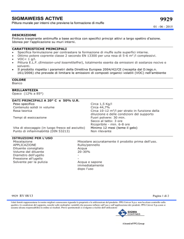 SIGMAWEISS ACTIVE 9929 Pittura murale per interni che previene la formazione di muffe 01 - 06 - 2015 DESCRIZIONE Finitura traspirante antimuffa a base acrilica con specifici principi attivi a largo spettro d’azione. Idonea per l’applicazione su muri interni. CARATTERISTICHE PRINCIPALI Specifica formulazione per contrastare la formazione di muffe sulle superfici interne. Ottimo potere coprente classe 2 secondo EN 13300 per una resa di 5-6 m2 /l complessivi. VOC< 1 g/l. Pittura E.L.F. (Emission-und losemittelfrei), totalmente esente da emissioni di sostanze nocive e solventi. Il prodotto rispetta i parametri della Direttiva Europea 2004/42/CE (recepita dal D.legs.n. 161/2006) che prevede di limitare le emissioni di composti organici volatili (VOC) nell’ambiente COLORE Bianco BRILLANTEZZA Opaco (12% a 85°) DATI PRINCIPALI A 20° C e 50% U.R. Peso specifico Contenuto solidi in volume Resa teorica Tempi di essiccazione Vita di stoccaggio (in luogo fresco ed asciutto) Punto di infiammabilità (DIN 53213) ISTRUZIONI PER L'USO Miscelazione APPLICAZIONE Diluente consigliato Volume del diluente Diametro dell'ugello Pressione all'ugello Solvente per la pulizia 9929 RV 08/13 Circa 1,5 Kg/l Circa 44,7% Circa 10-12 m2/l per strato in funzione della diluizione e delle condizioni del supporto Fuori polvere: 30 min. Secco al tatto: 3 ore Ricopribile - min. 6-8 ore Minimo 12 mesi (teme il gelo) Non rilevante Miscelare accuratamente il prodotto prima dell'uso. Rullo/pennello Acqua 20-30% Acqua e sapone immediatamente dopo l’uso Pagina 1 di 2 I dati forniti rappresentano le nostre migliori conoscenze riguardo le proprietà e le utilizzazioni del prodotto. PPG Univer S.p.a. non ha alcun controllo sulla qualità e le condizioni del supporto, nonchè sulle molteplici variabili che possono influire sull’uso e sull’applicazione dei prodotti. PPG Univer S.p.a.non si assume alcuna responsabilità in ordine ai risultati. Prove sperimentali si svolgono a rischio dell’utilizzatore SIGMAWEISS ACTIVE 9929 Pittura murale per interni che previene la formazione di muffe 01 - 06 - 2015 CICLI D’INTERVENTO Preparazione del supporto Agire su intonaco maturo, pulito ed asciutto, esente da polvere e parti scarsamente aderenti. In caso di contaminazioni di muffe o alghe trattare le superfici con Sigma Fungisol. Su superfici vecchie ove necessario, rasare con apposita malta. Intonaci e rappezzi non maturi possono causare scolorimento, aloni e comparsa di sale. N.B. In caso di superfici già pitturate verificare la compatibilità e l’adesione con il sistema proposto. Applicazione del fissativo, 1 x Sigmacryl Prim 1 x Sigmafix Universal 1 x Sigmalys Prim Fissativo in funzione del tipo di supporto: Acqua Pigmentato Acqua Incolore Acqua Pigmentato Per supporti in buone condizioni Per supporti in buone condizioni Per supporti in cartongesso Finitura 2 x Sigmaweiss Active NB: non eseguire applicazioni quando la temperatura dell’ambiente e del supporto è inferiore a 5 °C o superiore a 30 °C ed U.R. superiore a 85%. VOCE DA INSERIRE NEI CAPITOLATI D’APPALTO E PREVENTIVI SIGMAWEISS ACTIVE– Specifica Prodotto Finitura traspirante antimuffa per interni a base acrilica con specifici principi attivi a largo spettro d’azione. Idonea per l’applicazione su muri interni. Resa teorica circa 10-12 m2/l per strato. Con contenuto solidi in volume pari a circa 44,7% e peso specifico di circa 1,5 Kg/l. 9929 RV 08/13 Pagina 2 di 2 I dati forniti rappresentano le nostre migliori conoscenze riguardo le proprietà e le utilizzazioni del prodotto. PPG Univer S.p.a. non ha alcun controllo sulla qualità e le condizioni del supporto, nonchè sulle molteplici variabili che possono influire sull’uso e sull’applicazione dei prodotti. PPG Univer S.p.a.non si assume alcuna responsabilità in ordine ai risultati. Prove sperimentali si svolgono a rischio dell’utilizzatore