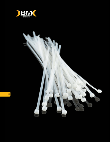 118 CABLES-TIES FASCETTE FASCETTE GAMME PER OGNI USO Ogni installazione costituisce un caso a sé, pure nei minimi particolari, a partire dalle fascette. Nel catalogo BM c’è la risposta, sia che si operi nel settore civile sia in quello industriale, per interni e per esterni. La scelta, in funzione di ogni esigenza, può cadere su differenti tipologie, quelle riapribili godono sempre più di un ampio apprezzamento sul mercato grazie alla loro praticità. Sempre in funzione dell’uso, in modo particolare in riferimento ad ambienti critici, sono proposte fascette in acciaio inox ad alta resistenza alla corrosione - autobloccanti a bassa forza di inserzione. Per semplificare il lavoro dell’installatore, non mancano fascette con occhiello e con targhetta di identificazione e una vasta gamma di accessori. Infine per impianti di distribuzione dati e reti vengono raccomandate le fascette in velcro riapribili a strappo. CONSERVAZIONE DEL PRODOTTO PER LE FASCETTE IN NYLON Evitare l’esposizione continua ai raggi solari e a fonti di calore. Mantenere le fascette, se non usate, nella loro confezione. INFORMAZIONI UTILI Come si ottiene il valore della resistenza minima a trazione? Le norme prevedono di stringere la fascetta su un mandrino, che verrà aperto ad una velocità predeterminata fino a ottenere la rottura della fascetta stessa. Un apposito strumento, più recentemente gestito da un software consente di misurare il carico di rottura. Il dato della resistenza minima a trazione indicato a catalogo consente di determinare il carico massimo applicabile. CABLE-TIES RANGES FOR EACH USE Each installation constitutes a freestanding case, even in the smallest details, starting from cable-ties. In BM catalogue, there is the answer, either you operate in civil or industrial sector, for indoor and outdoor uses. The choice, depending on each need, can fall into different types, those reusable always enjoy an increasingly wide appreciation on the market thanks to their convenience. Still according to the use, especially in reference to harsh environments, stainless steel cable-ties are offered with high resistance to corrosion – self-locking with low insertion force. To simplify end-user’s job, there are cable-ties with eye-bolt and with marking plate and a wide range of accessories. Finally, for data and networks distribution systems, reusable pulling cable-ties in Velcro are recommended. PRODUCT STORAGE FOR CABLE TIES IN NYLON Avoid continuous exposure to sunlight and heat sources. Keep cable-ties, if unused, in their box. USEFUL INFORMATION How do you get the value of the minimum tensile strength? Norms state to tighten cable-tie on a spindle, which will be opened at a predetermined speed till obtaining the breaking of cable-tie itself. A special instrument, recently managed by a software helps to measure the breaking load. The minimum tensile strength as shown in the catalogue allows to determine the maximum applicable load. 119 Fascette in nylon Nylon cable ties FASCETTE IN NYLON 6.6 - NYLON 6.6 CABLE TIES Articolo/Colore Type/Color 120 Dimensioni mm Dimension mm Naturale Natural Nero Black BM B0824 BM B1025 BM B1225 BM B1625 BM B2025 BM B1436 BM B2036 BM B2936 BM B3736 BM B1248 BM B1648 BM B1948 BM B2048 BM B2548 BM B3048 BM B3748 BM B3948 BM B4348 BM B5348 BM B1576 BM B2076 BM B2976 BM B3776 BM B4576 BM B5476 BM B7576 BM B4390 BM B5390 BM B7190 BM B7890 BM B8190 BM B1090 BM B1290 BM B1590 BM N0824 BM N1025 BM N1225 BM N1625 BM N2025 BM N1436 BM N2036 BM N2936 BM N3736 BM N1248 BM N1648 BM N1948 BM N2048 BM N2548 BM N3048 BM N3748 BM N3948 BM N4348 BM N5348 BM N1576 BM N2076 BM N2976 BM N3776 BM N4576 BM N5476 BM N7576 BM N4390 BM N5390 BM N7190 BM N7890 BM N8190 BM N1090 BM N1290 BM N1590 Lunghezza Length 80 100 120 160 200 140 200 300 370 120 160 188 200 250 300 370 390 430 530 150 200 300 368 450 533 750 430 526 710 776 815 1020 1220 1530 Larghezza Width 2,4 2,5 2,5 2,5 2,5 3,6 3,6 3,6 3,6 4,8 4,8 4,8 4,8 4,8 4,8 4,8 4,8 4,8 4,8 7,6 7,6 7,6 7,6 7,6 7,6 7,6 9 9 9 9 9 9 9 9 Ø Max mm di serraggio Resistenza min. alla trazione N Max bundle Dia. mm 15 22 30 40 53 33 53 76 102 24 38 43 50 60 76 102 105 110 140 33 50 76 102 132 140 218 110 140 190 228 239 295 365 460 Min. tensile strength N 78 80 80 80 80 180 180 180 180 220 220 220 220 220 220 220 220 220 220 540 540 540 540 540 540 540 790 790 790 790 790 790 790 790 Conf. pezzi Packing pcs. 100/8000 100/5000 100/5000 100/4000 100/3000 100/2500 100/2000 100/1500 100 100/2000 100/1500 100/1500 100/1500 100/1300 100/1000 100 100 100 100 100/1000 100/800 100/600 100 100 100 100 100 100 100 100 100 100 100 100 Materiale: Nylon 6.6 MIL-M-20693 Material: Nylon 6.6 according to MIL-M-20693 Classe di autoestinguenza: UL 94 - V 2 Temperatura d'esercizio: –40°C +85°C Ottima resistenza agli olii, solventi, grassi e prodotti petroliferi in genere Self extinguish UL 94 - V 2 Operating Temperature: –40° to +85°C Resistance to the oils, greasy, solvent and petroliferous products * Le fascette possono essere fornite anche in buste da 1000 pezzi. Per questa configurazione aggiungere la lettera M al codice prodotto. Es. B0824 100 pz - B0824M 1000 pz. * On request cable-ties are available with 1000 pcs bags. Please add the letter M to article number. Ex. B0824 100 pcs - B0824M 1000 pcs. Questo logo indica che i prodotti sono realizzati con materie plastiche esenti da alogeni, evitando, in caso di combustione, la formazione di gas tossici, in accordo con la norma internazionale EN 14582. This logo indicates that the products are made with halogens free plastics, avoiding, in case of combustion, the formation of toxic gases, according to the International Standard EN 14582. FASCETTE CABLES-TIES Fascette in nylon Nylon cable ties FASCETTE IN NYLON 11/12 DI COLORE NERO PER USI ESTERNI NYLON 11/12 CABLE TIES BLACK COLOR FOR EXTERNAL INSTALLATION Articolo/Colore Type/Color Nero Black BM N1890 BM N2690 BM N3690 Dimensioni mm Dimension mm Lunghezza Length 1