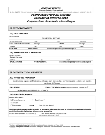 REGIONE VENETO Direzione Relazioni Internazionali L. R. n. 55/1999 “Interventi regionali per la promozione dei diritti umani, la cultura di pace, la cooperazione allo sviluppo e la solidarietà” Capo III. PIANO ESECUTIVO del progetto INIZIATIVA DIRETTA 2013 Cooperazione decentrata allo sviluppo 1) ENTE PROPONENTE 1.a) DATI GENERALI Denominazione COMUNE DI ROVIGO Via e numero civico Città P.zza Vittorio Emanuele II Rovigo Telefono fax 0425/2061 CAP 0425/206330 Provincia 45100 Rovigo pec e-mail [email protected] 1.b) REFERENTE PER IL PROGETTO Nome e cognome Daniela Scarparo Telefono fax 0425/206495 e-mail 0425/206581 [email protected] 2) DATI RELATIVI AL PROGETTO 2.a) TITOLO DEL PROGETTO1 Costruzione reparto di Maternità, alloggio per personale e servizi igienici esterni nel Centro sanitario di Tonon. LOCALITA’ d’intervento (Regione, Provincia, Distretto ecc.)2 2.b) STATO BURKINA FASO,SISSILLI,SILLY,TONON 2.c) DURATA del progetto Durata del progetto: Meno di un anno Quanti mesi ? X Annuale Pluriennale Qual è la sua durata? Nell’ipotesi di progetto pluriennale, la presente relazione, inclusa la scheda contabile relativa alla analisi dei costi, si riferisce alla corrente annualità: di Data avvio prevista: (01/09/2013) 1 2 Data di fine prevista: (31/08/2014) (di norma non superiore ad 1 anno) Indicare obbligatoriamente il titolo di progetto così come elencato nel Piano 2013 Allegare obbligatoriamente una cartina dettagliata dello Stato con individuazione della località dell’intervento. -1- 3) SETTORI DI INTERVENTO (barrare la casella, o le caselle che interessano, massimo tre settori di intervento prioritari) X X X Progettazione, fornitura, costruzione di impianti, attrezzature e infrastrutture Fornitura di servizi Assistenza tecnica, amministrativa e gestionale alle attività di cooperazione Programmi di formazione Interventi in ambito sanitario o comunque volti al miglioramento delle condizioni di salute Interventi per il miglioramento della condizione femminile e dell’infanzia Educazione ai temi dello sviluppo e scambi culturali Sostegno ad iniziative di consulenza e predisposizione di progetti di fattibilità (anche con partecipazione di immigrati extra-comunitari) Promozione del commercio equo e solidale Sostegno al microcredito Tutela dell’ambiente e delle risorse idriche Accesso all’istruzione primaria Iniziative volte a favorire la sicurezza alimentare Progetti di sviluppo integrato Sostegno all’imprenditoria locale 4) PARTERNARIATO Nome Competenze affidate Risorse impiegate (finanziarie – importo in euro3, umane, organizzative ecc.) PARTNER IN ITALIA4 Presentazione e promozione del progetto COMUNE DI ROVIGO ASS.NE PER LA COOPERAZIONE ALLO predisposizione e controllo in loco del progetto in tutte le fasi SVILUPPO DELL’AFRICA-ONLUS contatti con il Comitato di Gemellaggio di Satonevri e con il Sindaco di Silly Umane Finanziarie € 22.360,00 umane organizzative realizzazione del progetto ASS.NE CROCE VERDE ADRIA ASS.NE CULTURALE L’ISOLA DEI TESORI di CODEVIGO, PD Controllo e promozione del progetto promozione del progetto Finanziarie € 6.250,00 umane Finanziarie € 2.750,00 umane PARTNER NEL PAESE DESTINATARIO DELL’INTERVENTO SINDACO DEL COMUNE DI SILLY COMITATO DI GEMELLAGGIO DI SATONEVRI 3 4 rapporti con le comunita’ locali, con le istituzioni locali e nazionali rapporti con le comunita’ locali Umane , organizzative Umane , organizzative rapporti con l’impresa costruttrice Gli importi ivi indicati dovranno corrispondere a quanto indicato nel Piano Economico Tra i partner in Italia deve essere indicato anche il soggetto capofila -2- 5) DESCRIZIONE DEL CONTESTO Nota: descrivere contesto nazionale/regionale/distrettuale; indicare problemi dell’area di intervento, identificare i bisogni della popolazione target, anche indicando dati statistici, demografici ecc. Lo spazio da compilare è limitato (MAX 50 RIGHE). Il BURKINA FASO è uno Stato dell’Africa Occidentale, a sud del Sahara, Confina con Mali, Niger, Benin, Togo, Ghana e Costa d'Avorio ed è quindi senza sbocchi sul mare. E’ un paese pianeggiante con isolate colline sparse sul territorio, a prevalente economia rurale, all’interno della fascia del Sahel nell’Africa più povera e desolata. Il territorio di 274.200 km² conta una popolazione di circa 17.275.120 abitanti con una densità di: 63 ab./km² La lingua ufficiale è il francese CAPITALE: Ouagadougou (1.273.355 abitanti) VALUTA: franco CFA (1 Euro = circa 656 Franco CFA) Il Burkina Faso è suddiviso in 13 regioni, 45 province, e 351 dipartimenti. CLIMA principalmente tropicale, con due stagioni distinte: -stagione delle piogge, da maggio-giugno a settembre-ottobre (più breve nel nord) -stagione secca, in cui soffia l'harmattan, un vento secco e caldo proveniente dal Sahara, che causa problemi respiratori e alla vista. Da aprile a giugno le temperature salgono sempre più spesso oltre i 40°. L’83% della popolazione del Burkina Faso vive in zone rurali, in villaggi di argilla, mentre la popolazione urbana comprende solo l’8% del totale ed è concentrata nelle due città più grandi: Ouagadougou e BoboDioulasso. Il Burkina Faso è’ uno dei più poveri del mondo, con una speranza di vita che si aggira intorno ai 50 anni ed è tra i 15 Paesi con il più alto tasso di mortalità infantile.Il reddito medio pro-capite è di circa 210 dollari annui. La situazione di estrema povertà in cui vive la maggior parte degli abitanti del Burkina Faso si riflette nell’educazione, con grande disparità tra uomini e donne, tra zone urbane e rurali, le più povere. Il tasso di alfabetizzazione è molto basso ed anche la situazione sanitaria è tra le più preoccupanti del continente: nonostante si intraveda un certo miglioramento. il 4,2% della popolazione è affetta dall’AIDS e nonostante le campagne di sensibilizzazione intraprese dalle associazioni per i diritti umani ed una legislazione severa sul tema, è molto diffuso il fenomen