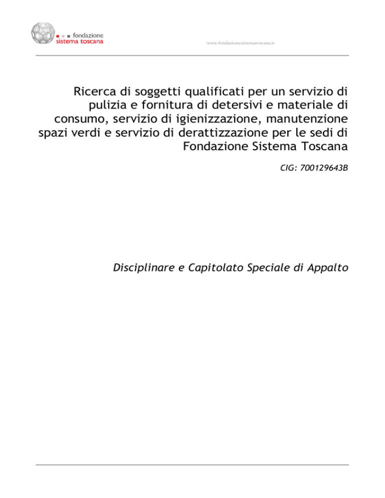 www.fondazionesistematoscana.it Ricerca di soggetti qualificati per un servizio di pulizia e fornitura di detersivi e materiale di consumo, servizio di igienizzazione, manutenzione spazi verdi e servizio di derattizzazione per le sedi di Fondazione Sistema Toscana CIG: 700129643B Disciplinare e Capitolato Speciale di Appalto SOMMARIO Art. 1 - Premesse ........................................................................................... 3 Art. 2 - Oggetto dell’appalto .............................................................................. 3 2.1 Modalità di esecuzione .............................................................................. 3 2.2 Specifiche del servizio richiesto ................................................................... 3 Art.3 - Materiali e smaltimento ........................................................................... 6 Art.4 - Sopralluogo .......................................................................................... 7 Art. 5 –Requisiti di partecipazione ........................................................................ 7 Art. 6 - Decorrenza, durata e proroga .................................................................... 7 Art. 7 - Importo stimato .................................................................................... 8 Art. 8 - Responsabilità ...................................................................................... 8 Art. 9 - Sicurezza ............................................................................................ 9 ART. 10 - Comportamento del personale in servizio ................................................... 9 Art. 11 – Contenuto delle offerte ......................................................................... 9 BUSTA A: Documenti Amministrativi ................................................................... 9 BUSTA B: Offerta Economica (OE). .................................................................... 10 Art. 12 - Criterio di valutazione delle offerte e di aggiudicazione ..................................11 Art. 13 - Esclusioni ......................................................................................... 11 Art. 14 - Efficacia del contratto, anticipo, fatturazione e pagamenti.............................. 12 Art. 15 - Obblighi di informazione e di formazione.................................................... 12 Art. 16 - Obblighi dell'impresa ............................................................................ 13 Art. 17 - Verifica di regolare esecuzione................................................................ 13 Art. 18 - Modalità di presentazione delle offerte...................................................... 13 Art. 19 - Svolgimento della valutazione e della gara .................................................. 13 Art. 20 - Cauzione definitiva .............................................................................. 14 Art. 21 - Subappalto e cessione del contratto.......................................................... 14 Art. 22 - Penali e risoluzione del contratto............................................................. 15 Art. 23 - Assicurazioni obbligatorie antinfortunistiche e assistenziali - responsabilità del contraente ...................................................................................................15 Art. 24 - Trattamento dei dati personali ................................................................ 16 Art. 25 - Stipula............................................................................................. 16 Art. 26 - Oneri tributari e spese contrattuali........................................................... 16 Art. 27 - Recesso............................................................................................ 16 Art. 28 - Foro competente ................................................................................ 17 Art. 29 - Norme di rinvio .................................................................................. 17 2 Art. 1 - Premesse Fondazione Sistema Toscana (di seguito anche FST) per l’affidamento degli incarichi per importi pari o superiori a euro 40.000,00 oltre iva agisce in conformità alla normativa sui contratti pubblici (D.Lgs. 50/2016 - Codice degli Appalti). FST ritiene di esperire una procedura aperta sotto soglia europea ai sensi dell’art. 60 comma 1 del sopracitato Codice, in un singolo lotto funzionale finalizzata, mediante l’acquisizione di offerte economiche e tecnico operative-metodologiche, all’individuazione di un soggetto qualificato in possesso dei requisiti economici e tecnico-operativi necessari all’espletamento della prestazione del servizio in argomento. Art. 2 - Oggetto dell’appalto La commessa ha per oggetto, nel rispetto delle leggi e normative vigenti: § § § § § § § § il servizio di pulizia di tutti i locali e gli spazi comuni degli uffici di Fondazione Sistema Toscana siti a Firenze in via San Gallo, 25 e in via Duca d’Aosta, 9; il servizio di pulizia di tutti i locali dell’immobile sito in Firenze, via Cavour, 50 rosso denominato Cinema delLa Compagnia in concessione a FST da parte di Regione Toscana; il servizio di pulizia tutti i locali e gli spazi afferenti alle aree sopra indicate relativi a: portinerie, scale, androni, corridoi, cortili, mobili, arredi, serramenti, finestre e vetrate, corpi illuminanti, e tutte le superfici calpestabili; il servizio di igienizzazione dei servizi igienici sanitari nei locali siti nelle due sedi di Fondazione Sistema Toscana siti a Firenze in via San Gallo, 25 e in via Duca d’Aosta, 9 e in quelli del Cinema delLa Compagnia (via Cavour, 50 rosso); la fornitura del materiale e delle attrezzature tecniche per l'esecuzione dei lavori di pulizia nella quantità e tipologia all'uopo richieste; la fornitura del materiali di consumo (carta Igienica, sapone liquido, salviette per le mani monouso, sacchi neri) e la loro distribuzione nell