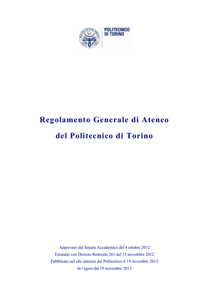 Regolamento Generale di Ateneo del Politecnico di Torino Approvato dal Senato Accademico del 4 ottobre 2012 Emanato con Decreto Rettorale 261 del 15 novembre 2012 Pubblicato nel sito internet del Politecnico il 19 novembre 2012 In vigore dal 19 novembre 2012 Titolo I –Rettore ..............................................................................................................................4 Art. 1 – Elezione ..........................................................................................................................4 Art. 2 – Deleghe attribuite dal Rettore......................................................................................4 Titolo II - Modalità elettive dei membri del Senato Accademico ...............................................5 Art. 3 – Elezioni...........................................................................................................................5 Art. 4 - Direttori di Dipartimento..............................................................................................5 Art. 5 - Rappresentanze dei professori e ricercatori a tempo indeterminato........................6 Art. 6 - Rappresentanze del personale tecnico-amministrativo..............................................7 Art. 7 - Rappresentanza dei ricercatori a tempo determinato................................................7 Art. 8 – Rappresentanza dei titolari di assegno di ricerca ......................................................8 Titolo III - Modalità di designazione del Consiglio di Amministrazione...................................8 Art. 9 – Elezioni...........................................................................................................................8 Art. 10 – Componenti .................................................................................................................9 Titolo IV Articolazione interna per la ricerca e la didattica.....................................................10 Art. 11 - Dipartimenti ...............................................................................................................10 Art. 12 - Coordinamento ed organizzazione dell’attività didattica e formativa .................12 Art. 13 - Comitato Paritetico per la Didattica........................................................................13 Art. 14 - Scuola di Dottorato....................................................................................................14 Art. 15 - Scuola di Master e Formazione Permanente ..........................................................14 Art. 16 - Comitato di Ateneo per la Ricerca, Trasferimento tecnologico e Servizi al territorio.....................................................................................................................................14 Titolo V - Amministrazione e gestione del personale ................................................................15 Art. 17 - Gestione e organizzazione .........................................................................................15 Art. 18 - Delegazione trattante di parte pubblica per la Contrattazione Collettiva Integrativa di Ateneo ................................................................................................................15 Art. 19 - Programmazione finanziaria ....................................................................................15 Art. 20 – Attivazione di rapporti di lavoro autonomo...........................................................15 Titolo VI - Norme generali sul funzionamento degli Organi Collegiali ...................................16 Art. 21 –Ambito di applicazione ..............................................................................................16 Art. 22 - Convocazione .............................................................................................................16 Art. 23 - Ordine del giorno.......................................................................................................16 Art. 24 - Documentazione a supporto della seduta ................................................................17 Art. 25 - Validità della costituzione dell’assemblea ...............................................................17 Art. 26 - Discussione degli argomenti all’ordine del giorno..................................................17 Art. 27 - Deliberazioni ..............................................................................................................18 Art. 28 - Verbalizzazione..........................................................................................................18 Art. 29 - Commissioni istruttorie.............................................................................................18 Art. 30 - Partecipazione in telepresenza .................................................................................18 2 Art. 31 - Consultazioni scritte ..................................................................................................19 Art. 32 - Decadenza di membri eletti o designati ...................................................................19 Art. 33 - Vacanza delle cariche elettive...................................................................................19 Art. 34 – Elettorato attivo e passivo per personale in aspettativa ........................................19 Art. 35 – Rappresentanze degli studenti .................................................................................20 Titolo VII - Diritto allo studio......................................................................................................20 Art. 36 - Attività formative autogestite ...................................................................................20 Art. 37 - Impianti ed attività Sportive.....................................................................................20 Titolo VIII - Trasparenza dell’attività amministrativa.