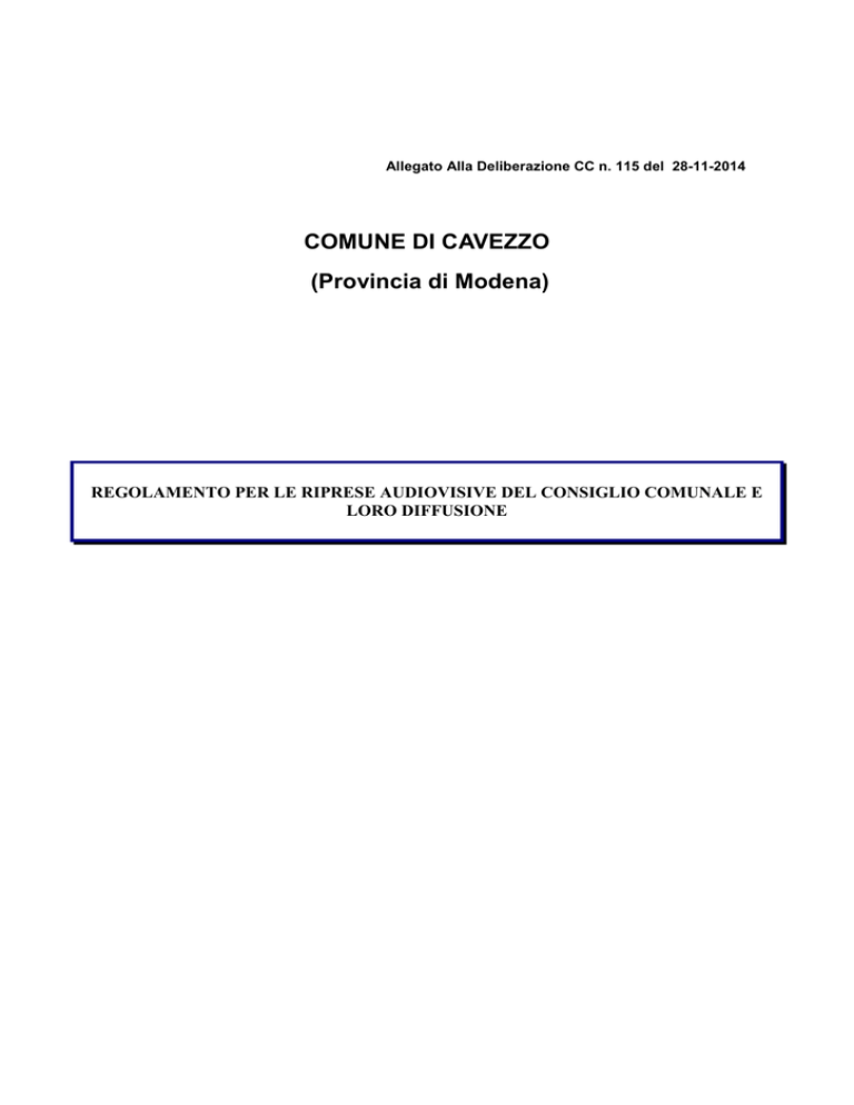 Allegato Alla Deliberazione CC n. 115 del 28-11-2014 COMUNE DI CAVEZZO (Provincia di Modena) REGOLAMENTO PER LE RIPRESE AUDIOVISIVE DEL CONSIGLIO COMUNALE E LORO DIFFUSIONE Titolo I - Disposizioni generali – Articolo 1. OGGETTO Il presente Regolamento disciplina il servizio di ripresa audio-video e trasmissione, su internet tramite pagina web o su rete televisiva, effettuato direttamente dall'Ente o da soggetti previamente autorizzati, delle riunioni pubbliche ordinarie e straordinarie, del Consiglio Comunale di Cavezzo. 1. Articolo 2. PRINCIPI REGOLAMENTARI Il servizio di comunicazione pubblica delle attività istituzionali tramite uno dei canali richiamati dall'articolo precedente, dovrà essere effettuato con rigoroso rispetto dei principi di imparzialità, obiettività e completezza e potrà essere effettuato solo previa autorizzazione del Sindaco. 1. Le norme del presente regolamento integrano le altre disposizioni di legge aventi attinenza 2. con la tutela del diritto alla riservatezza e con il diritto di accesso alla documentazione amministrativa, conformemente a quanto stabilito dalle leggi in materia, con lo Statuto e con i relativi Regolamenti comunali vigenti. Articolo 3. FINALITA’ 1. Il Comune di Cavezzo attribuisce alla diffusione audio e video delle sedute del Consiglio comunale la funzione utile di favorire la partecipazione dei cittadini all’attività politico/amministrativa dell’Ente. 2. Il presente Regolamento ha pertanto lo scopo di favorire e normare l’accoglimento delle domande di riprese audiovisive delle sedute pubbliche di Consiglio comunale e di facilitare lo svolgimento di tali riprese, in modo che venga assicurato il diritto della cittadinanza alla informazione e nel contempo il regolare svolgimento dell’attività consiliare. Titolo II - Modalità di ripresa ed informativa Articolo 4. RIPRESA Il Comune procede direttamente, con mezzi ed impianti propri, alle riprese audio video delle sedute pubbliche del Consiglio comunale. 1. 2. Fermo restando il divieto di ripresa e/o diffusione di dati sensibili e giudiziari, al fine di consentire la diffusione di immagini e di informazioni pertinenti e non eccedenti rispetto alle finalità di informazione perseguite ai fini della tutela della privacy, le riprese audio-video in corso di seduta dovranno riguardare esclusivamente i componenti del Consiglio Comunale, gli Assessori e gli altri soggetti che partecipano alle sedute del Consiglio Comunale ed in particolare coloro che propongono o intervengono sugli argomenti iscritti all’ordine del giorno nel corso della seduta. Al fine di limitare la ripresa ai soli soggetti indicati al comma precedente, le telecamere per la ripresa delle sedute consiliari saranno sempre orientate in modo tale da non inquadrare frontalmente il pubblico presente in sala né altri soggetti, salvo il personale dipendente in servizio, limitandosi ad inquadrare esclusivamente lo spazio riservato ai componenti del Consiglio comunale. 3. 4. I Consiglieri, durante i lavori del Consiglio, non possono in alcun modo impedire le riprese audio-video, salvo diversa richiesta del consigliere limitatamente alla diffusione della propria immagine. 5. I lavori del Consiglio devono procedere, e non possono essere in nessun caso interrotti, qualora si verificasse un mal funzionamento o rottura dell’apparecchiatura di ripresa video. 6. Il Sindaco, in tali situazioni, dovrà attivarsi a consentire il ripristino dell’operatività nel più breve tempo possibile. 7. Le riprese non possono essere eseguite con altri strumenti esterni. Articolo 5. INFORMAZIONE 1. Il Sindaco ha l’obbligo di fornire preventiva informazione a tutti i partecipanti alla seduta, circa l’esistenza di videocamere e della successiva trasmissione delle immagini. Ai fini della conoscenza da parte del pubblico che nella sala consiliare esiste la possibilità di riprese audiovisive e della contemporanea o successiva diffusione delle medesime, è fatto obbligo all’Amministrazione di affiggere specifici avvisi, cartelli o contrassegni all’ingresso della sala. 2. Il Sindaco prima dell'avvio delle riprese e della successiva pubblicazione della seduta, è 3. tenuto ad invitare i Consiglieri, gli Assessori e gli altri soggetti che partecipano alle sedute del Consiglio Comunale, di adottare, nel corso dei loro interventi, le opportune cautele con riferimento all'obbligo del rispetto della tutela dei dati sensibili e giudiziari per i quali vige il rigoroso rispetto del principio di stretta necessità. Titolo III - Riprese e diffusione delle sedute del Consiglio comunale in video e audio eseguite dal Comune Articolo 6. RIPRESE AUDIO E VIDEO NONCHE’ DIFFUSIONE 1. Il Comune di Cavezzo effettua direttamente le riprese con la sua contemporanea e successiva pubblicazione sul sito web istituzionale dell'Ente o su altro sito raggiungibile tramite un link dallo stesso, delle sole sedute pubbliche del Consiglio comunale. Le riprese e trasmissioni video, effettuate a cura dell’Amministrazione Comunale, potranno avvenire per il tramite di personale interno all'Ente o individuato all’uopo. 2. Non sono ammesse riprese audio e video da parte di terzi, salvo quanto disciplinato dal Titolo IV del presente Regolamento. 3. Articolo 7. MODALITÀ DELLE RIPRESE AUDIO-VIDEO DEI LAVORI DEL CONSIGLIO COMUNALE - RESPONSABILITÀ Salvo diversa disposizione motivata del Sindaco, la ripresa e la trasmissione audio-video dei lavori di ciascun Consiglio Comunale dovrà essere integrale ed obiettiva, senza tagli e salti. 1. Nel corso della seduta, gli interventi di ciascun componente del Consiglio Comunale, degli Assessori e degli altri soggetti che partecipano alle sedute del Consiglio Comunale dovranno essere ripresi integralmente, chiaramente, senza commenti fuori campo né interruzioni. 2. Non potranno essere fatte oggetto di ripresa audio-video, le pause e le interruzioni espressamente autorizzate dal Sindaco. 3. Articolo 8. PUBBLICAZIONE DELLE RIPRESE Le rip