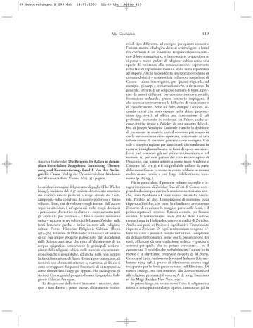 09_Besprechungen_S_293 drh 14.01.2009 11:49 Uhr Seite 419 Alte Geschichte Andreas Hofeneder, Die Religion der Kelten in den antiken literarischen Zeugnissen. Sammlung, Übersetzung und Kommentierung. Band I. Von den Anfängen bis Caesar. Verlag der Österreichischen Akademie der Wissenschaften, Vienna 2005. 352 pagine. La celebre immagine del pupazzo di paglia (The Wicker Image), incisione del 1657 ispirata al resoconto cesariano dei sacrifici umani praticati a scopo rituale dai Galli, campeggia sulla copertina di questo poderoso e denso volume. Esso, cui dovrebbero negli intenti dell’autore seguirne altri due, è un’opera dai molti pregi, destinata a porsi come alternativa moderna e a superare sotto tutti gli aspetti la pur preziosa – e fino a questo momento unica – raccolta in tre volumi di Johannes Zwicker sulle fonti letterarie greche e latine inerenti alla religione celtica: Fontes Historiae Religionis Celticae (Bonn 1934–36). Il lavoro di Hofeneder si inserisce all’interno di un più ampio progetto patrocinato dall’Accademia delle Scienze austriaca, che mira all’allestimento di un corpus epigrafico concernente le principali testimonianze della religione celtica, nelle sue varie sfaccettature, cronologiche e geografiche, ed anche nella non sempre facile delimitazione di figure divine poco conosciute, di teonimi non altrimenti attestati o, viceversa, di dèi cui si sono sovrapposti frequenti fenomeni di interpretatio, come dimostrano i saggi già apparsi, che raccolgono gli Atti dei Convegni del progetto Fontes Epigraphici Religionis Celticae Antiquae. La discussione delle fonti letterarie – mediate, dunque, e non dirette – pone, invece, chiaramente proble- 419 mi di tipo differente, ad esempio per quanto concerne l’orientamento ideologico dei vari scrittori greci e latini nei confronti di un fenomeno religioso alquanto estraneo al loro immaginario, o fanno sorgere la questione se si possa o meno parlare di religione celtica come una specie di resistenza alla romanizzazione, soprattutto nella fase di espansione romana, dalla tarda repubblica all’impero. Anche la cosiddetta interpretatio romana di certune divinità – testimoniata nella nota narrazione di Cesare – desta interrogativi, per quanto riguarda, ad esempio, gli scopi e le motivazioni che la dettarono. In generale, si tratta di un cospicuo numero di fonti, riportate da autori differenti per contesto storico e sociale, formazione culturale, genere letterario impiegato, il che accresce ulteriormente le difficoltà di valutazione o di classificazione. Bene ha fatto dunque l’editore, secondo criteri che sono espressi nella chiara presentazione (pp. 10–15), ad offrire una ricostruzione di tali problemi, mettendo in evidenza, tra l’altro, anche alcune critiche mosse a Zwicker da una autorità del calibro di Joseph Vendryes. Lodevole è anche la decisione di presentare in qualche caso il contesto più ampio in cui la testimonianza viene riportata, unitamente ad una informazione di carattere generale come sostegno. Ciò vale a maggior ragione per autori tardi che sembrano in tutta verisimiglianza basarsi su fonti di epoca anteriore. Lo si può osservare già nel primo testimonium, o nel numero 15, per non parlare del caso macroscopico di Posidonio, cui hanno attinto a piene mani Strabone e Diodoro (cfr. p. 113), e il cui probabile utilizzo da parte dello stesso Cesare va messo in conto, sebbene in misura molto meno servile e con larga rielaborazione autonoma (p. 189 sgg.). Più in particolare, il presente volume raccoglie e integra i testimoni di Zwicker fino all’età di Cesare, comprendendo dunque due tra le massime auctoritates antiche, ossia Posidonio e Cesare stesso; ma anche Aristotele, Polibio, ed altri. L’integrazione di numerosi passi rispetto a Zwicker, che pure, lo ribadiamo, aveva avuto il merito di enucleare la maggior parte delle fonti, è il primo aspetto di interesse. Basterà scorrere, per farsene un’idea, le testimonianze tratte dal de Bello Gallico: trentacinque in Hofeneder, contro le undici di Zwicker. Anche nei passi di Polibio è significativo l’incremento rispetto a Zwicker. Di ogni testimonium vengono offerte succinte e puntuali notizie sull’autore, completate da dettagli bibliografici; segue poi la presentazione dei testi, affiancati da una traduzione tedesca – precisa e corretta per quello che ho potuto constatare –, ed il commento. Il modello che probabilmente l’autore ha in mente è la altrettanto pregevole raccolta di M. Stern, Greek and Latin Authors on Jews and Judaism (Gerusalemme 1974–1984), punto di riferimento ancora oggi insuperato per le fonti greco-romane sull’Ebraismo. Di natura analoga, ma con attinenza allo Zoroastrismo ed alla religione persiana, è il volume A. de Jong, Traditions of the Magi (Leida e New York 1997). In primo luogo, va notato come l’idea di religione sia intesa in senso piuttosto largo (questo, comunque, già in 09_Besprechungen_S_293 drh 420 14.01.2009 11:49 Uhr Seite 420 Besprechungen Zwicker): la scelta delle testimonianze abbraccia, quindi, anche aspetti più propriamente geografici, zoologici, etnografici o anche antropologici, senza tralasciare il nesso, non sempre distinguibile con precisione, tra religione e magia. Al primo gruppo si possono far risalire motivi largamente diffusi, come quello dell’isola in mezzo all’Oceano, ovvero quello del viaggio oltremondano, ma anche le differenziazioni tra le varie tribù celtiche. Un compendio dei due motivi è offerto ad esempio da 6 T1, un frammento di Ecateo, che presenta inoltre la assimilazione tra Celti ed Iperborei. Quanto al secondo gruppo, vi sono delle testimonianze che fanno riferimento agli animali sacri, primo fra tutti il corvo (pp. 110. 170), o il cavallo (p. 96), il serpente (p. 20), o a tabu alimentari, quali l’interdizione dal cibarsi di lepre o anatre (p. 179). Allo stesso tempo, rientra tra gli interessi degli storici antichi il porre in evidenza 