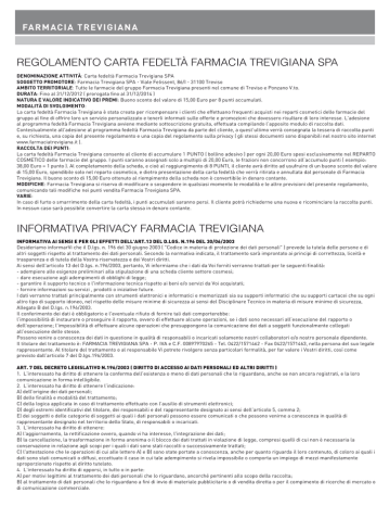FARMACIA TREVIGIANA REGOLAMENTO CARTA FEDELTÀ FARMACIA TREVIGIANA SPA DENOMINAZIONE ATTIVITÀ: Carta fedeltà Farmacia Trevigiana SPA SOGGETTO PROMOTORE: Farmacia Trevigiana SPA - Viale Felissent, 86/I - 31100 Treviso AMBITO TERRITORIALE: Tutte le farmacie del gruppo Farmacia Trevigiana presenti nel comune di Treviso e Ponzano V.to. DURATA: Fino al 31/12/2012 ( prorogata fino al 31/12/2014 ) NATURA E VALORE INDICATIVO DEI PREMI: Buono sconto del valore di 15,00 Euro per 8 punti accumulati. MODALITÀ DI SVOLGIMENTO: La carta fedeltà Farmacia Trevigiana è stata creata per ricompensare i clienti che effettuano frequenti acquisti nei reparti cosmetici delle farmacie del gruppo al fine di offrire loro un servizio personalizzato e tenerli informati sulle offerte e promozioni che dovessero risultare di loro interesse. L’adesione al programma fedeltà Farmacia Trevigiana avviene mediante sottoscrizione gratuita, effettuata compilando l’apposito modulo di raccolta dati. Contestualmente all’adesione al programma fedeltà Farmacia Trevigiana da parte del cliente, a quest’ultimo verrà consegnata la tessera di raccolta punti e, su richiesta, una copia del presente regolamento e una copia del regolamento sulla privacy ( gli stessi documenti sono disponibili nel nostro sito internet www.farmaciatrevigiana.it ). RACCOLTA DEI PUNTI: La carta fedeltà Farmacia Trevigiana consente al cliente di accumulare 1 PUNTO ( bollino adesivo ) per ogni 20,00 Euro spesi esclusivamente nel REPARTO COSMETICO delle farmacie del gruppo. I punti saranno assegnati solo a multipli di 20,00 Euro, le frazioni non concorrono all’accumulo punti ( esempio: 38,00 Euro = 1 punto ). Al completamento della scheda, e cioè al raggiungimento di 8 PUNTI, il cliente avrà diritto ad usufruire di un buono sconto del valore di 15,00 Euro, spendibile solo nel reparto cosmetico, e dietro presentazione della carta fedeltà che verrà ritirata e annullata dal personale di Farmacia Trevigiana. Il buono sconto di 15,00 Euro ottenuto al riempimento della scheda non è convertibile in denaro contante. MODIFICHE: Farmacia Trevigiana si riserva di modificare o sospendere in qualsiasi momento le modalità e le altre previsioni del presente regolamento, comunicando tali modifiche nei punti vendita Farmacia Trevigiana SPA. VARIE: In caso di furto o smarrimento della carta fedeltà, i punti accumulati saranno persi. Il cliente potrà richiederne una nuova e ricominciare la raccolta punti. In nessun caso sarà possibile convertire la carta stessa in denaro contante. INFORMATIVA PRIVACY FARMACIA TREVIGIANA INFORMATIVA AI SENSI E PER GLI EFFETTI DELL'ART.13 DEL D.LGS. N.196 DEL 30/06/2003 Desideriamo informarVi che il D.lgs. n. 196 del 30 giugno 2003 ( "Codice in materia di protezione dei dati personali" ) prevede la tutela delle persone e di altri soggetti rispetto al trattamento dei dati personali. Secondo la normativa indicata, il trattamento sarà improntato ai principi di correttezza, liceità e trasparenza e di tutela della Vostra riservatezza e dei Vostri diritti. Ai sensi dell'articolo 13 del D.lgs. n.196/2003, pertanto, Vi informiamo che i dati da Voi forniti verranno trattati per le seguenti finalità: - adempiere alle esigenze preliminari alla stipulazione di una scheda cliente settore cosmesi; - dare esecuzione agli adempimenti di obblighi di legge; - garantire il supporto tecnico o l'informazione tecnica rispetto ai beni e/o servizi da Voi acquistati; - fornire informazioni su servizi , prodotti o iniziative future. I dati verranno trattati principalmente con strumenti elettronici e informatici e memorizzati sia su supporti informatici che su supporti cartacei che su ogni altro tipo di supporto idoneo, nel rispetto delle misure minime di sicurezza ai sensi del Disciplinare Tecnico in materia di misure minime di sicurezza, Allegato B del D.lgs. n.196/2003. Il conferimento dei dati è obbligatorio e l'eventuale rifiuto di fornire tali dati comporterebbe: l’impossibilità di instaurare o proseguire il rapporto, ovvero di effettuare alcune operazioni, se i dati sono necessari all’esecuzione del rapporto o dell’operazione; l’impossibilità di effettuare alcune operazioni che presuppongono la comunicazione dei dati a soggetti funzionalmente collegati all’esecuzione delle stesse. Possono venire a conoscenza dei dati in questione in qualità di responsabili o incaricati solamente nostri collaboratori e/o nostro personale dipendente. Il titolare del trattamento è: FARMACIA TREVIGIANA SPA - P. IVA e C.F. 00897970265 - Tel. 0422/1571462 - Fax 0422/1571463, nella persona del suo legale rappresentante. Al titolare del trattamento o al responsabile Vi potrete rivolgere senza particolari formalità, per far valere i Vostri diritti, così come previsto dall’articolo 7 del D.lgs.196/2003. ART. 7 DEL DECRETO LEGISLATIVO N.196/2003 ( DIRITTO DI ACCESSO AI DATI PERSONALI ED ALTRI DIRITTI ) 1. L'interessato ha diritto di ottenere la conferma dell'esistenza o meno di dati personali che lo riguardano, anche se non ancora registrati, e la loro comunicazione in forma intelligibile. 2. L’interessato ha diritto di ottenere l’indicazione: A) dell’origine dei dati personali; B) delle finalità e modalità del trattamento; C) della logica applicata in caso di trattamento effettuato con l’ausilio di strumenti elettronici; D) degli estremi identificativi del titolare, dei responsabili e del rappresentante designato ai sensi dell’articolo 5, comma 2; E) dei soggetti o delle categorie di soggetti ai quali i dati personali possono essere comunicati o che possono venirne a conoscenza in qualità di rappresentante designato nel territorio dello Stato, di responsabili o incaricati. 3. L’interessato ha diritto di ottenere: A) l'aggiornamento, la rettificazione ovvero, quando vi ha interesse, l'integrazione dei dati; B) la cancellazione, la trasformazione in forma anonima o il blocco dei dati trattati in violazione di legge, compresi quelli di 
