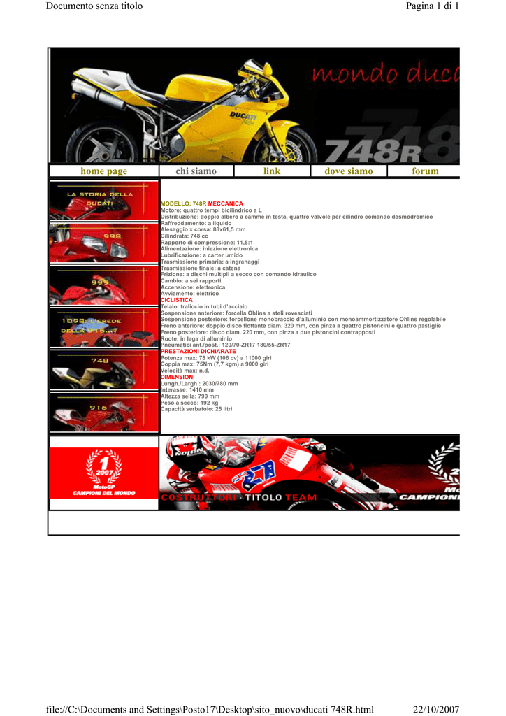 Documento senza titolo home page Pagina 1 di 1 chi siamo link dove siamo forum MODELLO: 748R MECCANICA Motore: quattro tempi bicilindrico a L Distribuzione: doppio albero a camme in testa, quattro valvole per cilindro comando desmodromico Raffreddamento: a liquido Alesaggio x corsa: 88x61,5 mm Cilindrata: 748 cc Rapporto di compressione: 11,5:1 Alimentazione: iniezione elettronica Lubrificazione: a carter umido Trasmissione primaria: a ingranaggi Trasmissione finale: a catena Frizione: a dischi multipli a secco con comando idraulico Cambio: a sei rapporti Accensione: elettronica Avviamento: elettrico CICLISTICA Telaio: traliccio in tubi d’acciaio Sospensione anteriore: forcella Ohlins a steli rovesciati Sospensione posteriore: forcellone monobraccio d’alluminio con monoammortizzatore Ohlins regolabile Freno anteriore: doppio disco flottante diam. 320 mm, con pinza a quattro pistoncini e quattro pastiglie Freno posteriore: disco diam. 220 mm, con pinza a due pistoncini contrapposti Ruote: in lega di alluminio Pneumatici ant./post.: 120/70-ZR17 180/55-ZR17 PRESTAZIONI DICHIARATE Potenza max: 78 kW (106 cv) a 11000 giri Coppia max: 75Nm (7,7 kgm) a 9000 giri Velocità max: n.d. DIMENSIONI Lungh./Largh.: 2030/780 mm Interasse: 1410 mm Altezza sella: 790 mm Peso a secco: 192 kg Capacità serbatoio: 25 litri file://C:\Documents and Settings\Posto17\Desktop\sito_nuovo\ducati 748R.html 22/10/2007