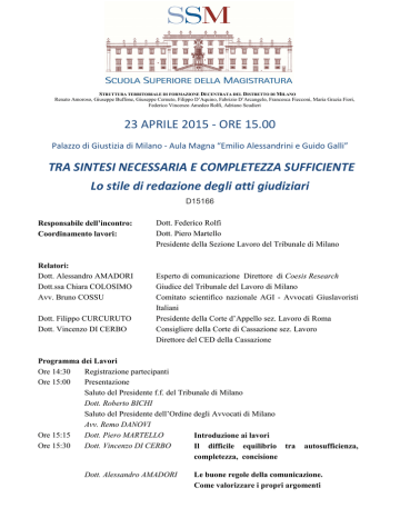 STRUTTURA TERRITORIALE DI FORMAZIONE DECENTRATA DEL DISTRETTO DI MILANO Renato Amoroso, Giuseppe Buffone, Giuseppe Cernuto, Filippo D’Aquino, Fabrizio D’Arcangelo, Francesca Fiecconi, Maria Grazia Fiori, Federico Vincenzo Amedeo Rolfi, Adriano Scudieri 23 APRILE 2015 - ORE 15.00 Palazzo di Giustizia di Milano - Aula Magna “Emilio Alessandrini e Guido Galli” TRA SINTESI NECESSARIA E COMPLETEZZA SUFFICIENTE Lo stile di redazione degli atti giudiziari D15166 Responsabile dell’incontro: Coordinamento lavori: Relatori: Dott. Alessandro AMADORI Dott.ssa Chiara COLOSIMO Avv. Bruno COSSU Dott. Filippo CURCURUTO Dott. Vincenzo DI CERBO Dott. Federico Rolfi Dott. Piero Martello Presidente della Sezione Lavoro del Tribunale di Milano Esperto di comunicazione Direttore di Coesis Research Giudice del Tribunale del Lavoro di Milano Comitato scientifico nazionale AGI - Avvocati Giuslavoristi Italiani Presidente della Corte d’Appello sez. Lavoro di Roma Consigliere della Corte di Cassazione sez. Lavoro Direttore del CED della Cassazione Programma dei Lavori Ore 14:30 Registrazione partecipanti Ore 15:00 Presentazione Saluto del Presidente f.f. del Tribunale di Milano Dott. Roberto BICHI Saluto del Presidente dell’Ordine degli Avvocati di Milano Avv. Remo DANOVI Ore 15:15 Dott. Piero MARTELLO Introduzione ai lavori Ore 15:30 Dott. Vincenzo DI CERBO Il difficile equilibrio tra completezza, concisione Dott. Alessandro AMADORI autosufficienza, Le buone regole della comunicazione. Come valorizzare i propri argomenti Ore 17:30 Ore 18:00 Avv. Bruno COSSU Gli strumenti informatici: ausilio virtuoso e tentazione dannosa Dott. Filippo CURCURUTO Quando il lettore è il Giudice: i vantaggi della sintesi, i rischi della prolissità Dott.ssa Chiara COLOSIMO Fare contento il cliente o convincere il Giudice? Il peso della carta e il peso degli argomenti Dibattito Chiusura lavori Presentazione dell’incontro I problemi legati a una adeguata redazione degli atti giudiziari hanno ricevuto frequente attenzione dalla giurisprudenza della Corte di Cassazione e hanno anche formato oggetto di raccomandazioni ufficiali del Primo Presidente al Consiglio Nazionale Forense. Nello stesso senso, si pongono le prescrizioni della Corte Europea dei Diritti dell'Uomo che fissa il limite di 20 pagine; così come quelle del Consiglio di Stato, che suggerisce, per i ricorsi e le memorie, il limite di 20-25 pagine. La novella del Codice del processo amministrativo, inoltre, prevede che il rispetto della sinteticità degli atti venga valutato ai fini delle spese del giudizio. Gli atti dei soggetti del processo, Avvocati e Magistrati, devono soddisfare i requisiti di completezza, sintesi e incisività; e di agevole comprensione da parte dei destinatari primi (avvocati magistrati) e, auspicabilmente, anche dei destinatari finali, le parti sostanziali. Frequentemente i profili di concisione e di chiarezza vengono sacrificati con la stesura di atti prolissi, ridondanti, inutilmente (talvolta: dannosamente) verbosi, nei quali si confonde il peso delle carte con il peso e la forza degli argomenti. A tali effetti conduce, spesso, una malintesa concezione dell'autosufficienza e della completezza, che porta ad appesantire gli atti con argomenti e riferimenti estranei e, comunque, non funzionali rispetto alle effettive esigenze espositive. Un incentivo, o istigazione, a tali prassi deteriori viene fornito dagli strumenti informatici che - con l'agevole e poco faticoso ricorso al "copia-incolla"- consentono di elaborare atti di estensione e di "peso" spesso sproporzionati rispetto alle questioni di causa, ma con l'effetto di distogliere l'attenzione dalle questioni rilevanti ai fini del decidere e di appesantire lo svolgimento del processo, allungandone la (ragionevole) durata. Tutto ciò si pone in contrasto con le norme processuali che prescrivono la concisione; ma, soprattutto, si pone in conflitto con l'interesse dell'estensore a essere compreso dal lettore, rendendo a questi difficile la percezione e la comprensione degli argomenti davvero significativi. Si pone, quindi, il problema del rispetto non solo delle norme processuali, ma anche delle generali regole della comunicazione, fondate sulla brevità e sulla incisività del messaggio. La brevità degli atti di causa specie di quelli difensivi, non solo è obbligatoria, ma è utile e conveniente, perché di essi facilita la comprensione e, quindi, ne agevola l'accoglimento. Non va dimenticata, poi, l'esigenza del Giudice di risultare convincente in sede di appello; così come la necessità dell'Avvocato di conciliare le richieste del cliente (spesso di natura emotiva) con la tecnica giuridica e con l'imperativo di risultare convincente per il giudice. Ma non si può trascurare che l’inutile sovrabbondanza di argomenti e di elementi rischia di favorire un "fallo di confusione" che può determinare il rigetto della domanda pur fondata. La nuova realtà del processo, specialmente di quello telematico, richiede ad avvocati e giudici un nuovo approccio nella redazione degli atti. Si rende, quindi, necessario un più rigoroso rispetto delle prescrizioni di legge ma, anche e soprattutto, l'individuazione di "prassi virtuose" che portino a un ragionevole equilibrio fra completezza e persuasività delle argomentazioni e concentrazione nella redazione degli atti. Il convegno si pone, quindi, come laboratorio per la elaborazione di linee direttive condivise fra tutti i soggetti del processo,nel comune intento di rendere gli scritti di causa efficaci, efficienti, e incisivi. Destinatari del corso Magistrati ordinari e magistrati in tirocinio ordinario, giudici onorari, giudici di pace e stagisti. L’incontro è aperto altresì alla partecipazione degli avvocati cultori della materia (fino al numero massimo di 150), nonché agli studenti delle scuole di specializzazione forense (questi ultimi in numero massimo di 40). Per ragioni organizzative i magistrati che intendono partecipare all’inc