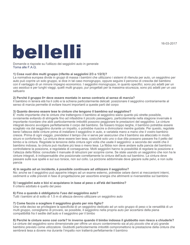 16-03-2017 Domande e risposte su l'utilizzo dei seggiolini auto in generale Torna alle F.A.Q. 1) Cosa vuol dire multi gruppo (riferito ai seggiolini 2/3 o 1/2/3)? La normativa europea divide in gruppi di massa i bambini che utilizzano i sistemi di ritenuta per auto, un seggiolino per auto può coprire un solo gruppo, si dice in tal caso monogruppo, oppure seguire il percorso di crescita del bambino con il vantaggio di un minore impegno economico. I seggiolini monogruppo, in quanto specifici, sono più adatti per un uso assiduo e per lunghi viaggi, quelli multi gruppo, pur progettati per la massima sicurezza, sono più adatti per un uso saltuario 2) Perché il gruppo 0+ deve essere montato in senso contrario al senso di marcia? Il bambino in tenera età ha il collo e la schiena particolarmente delicati: posizionare il seggiolino contrariamente al senso di marcia permette di evitare traumi importanti a queste parti del corpo 3) Quanto devono essere tese le cinture che tengono il bambino sul seggiolino? E’ molto importante che le cinture che trattengono il bambino al seggiolino siano quanto più strette possibile, ovviamente evitando di stringerle fino ad infastidire il piccolo passeggero, particolarmente nella stagione invernale è importante ricordare che abiti particolarmente imbottiti possono peggiorare le prestazioni del seggiolino. Le cinture integrali devono avvolgere perfettamente il corpo del bambino. Se fossero troppo larghe, il bambino potrebbe essere scagliato via dal seggiolino durante un impatto, o potrebbe riuscire a divincolarsi mentre guidate. Per questo, regolate bene l’altezza delle cinture prima di installare il seggiolino in auto, e variatela mano a mano che il vostro bambino cresce. Prima di ogni viaggio, prendetevi il tempo che vi serve per assicuravi che il bambino sia allacciato in modo sicuro e confortevole. La cintura deve essere ben tesa, cosicché solo uno o due dita possano passare fra il petto del bimbo e la cintura. Regolate la tensione della cintura ogni volta che usate il seggiolino: a seconda dei vestiti che il bambino indossa, la cintura può risultare più tesa o meno tesa. La fibbia non deve andare sulla pancia del bambino: controllatene la posizione, e regolatela di conseguenza. Molti seggiolini hanno la possibilità di regolare la posizione e l’altezza della fibbia: consultate il manuale di istruzioni per scoprire come. Se state usando un seggiolino che non ha le cinture integrali, è indispensabile che posizionate correttamente la cintura dell’auto sul bambino. La cintura deve passare sulle sue spalle e sul suo torace, non sul collo. La porzione addominale deve giacere sulle pelvi, e non sulla pancia 4) In seguito ad un incidente, è possibile continuare ad utilizzare il seggiolino? No: anche se il seggiolino può apparire integro ad un esame esterno, potrebbe celare danni ai meccanismi interni, cedimenti a volte previsti in fase di progettazione per assorbire energia che altrimenti si riverserebbe sul bambino 5) I seggiolini auto e bici si acquistano in base al peso o all'età del bambino? Il criterio adottato è quello del peso 6) Fino a quando è obbligatorio l'uso del seggiolino auto? Tutti i bambini al di sotto di 1.5 m di altezza devono utilizzare un seggiolino auto 7) Come faccio a scegliere il seggiolino giusto per mio figlio? Una volta deciso se privilegiare la specificità di un seggiolino dedicato ad un solo gruppo di peso o la versatilità di un multi gruppo, consigliamo di provare, se possibile, il seggiolino nella propria auto per accertarsi della piena compatibilità fra il sedile dell’auto e il seggiolino per il bimbo 8) Perché le cinture sono così corte? In inverno quando il bimbo indossa il giubbotto non riesco a chiuderle? Le cinture del seggiolino sono dimensionate per offrire un sicuro contenimento sia al più piccolo che al più grande bambino previsto come utilizzatore. Giubbotti particolarmente imbottiti compromettono la prestazione della cintura che sembrerà tesa a dovere ma durante l’impatto non tratterrà perfettamente il bambino 9) E' giusto che le gambe del bambino penzolino dal seggiolino? La lunghezza della seduta è tale da garantire adeguato comfort e sicurezza ad ogni bambino all’interno del gruppo di massa previsto 10) Quanti anni di garanzia ha il prodotto? Rivolgetevi al rivenditore per qualsiasi problema. Le clausole di garanzia sono reperibili sul sito 11) E' corretto utilizzare seggiolini di seconda mano? E’ sempre rischioso utilizzare un seggiolino usato perché potrebbe aver avuto un incidente pur non presentando danni evidenti, nel caso si sia certi che il seggiolino non abbia subito incidenti è bene ricordare che è consigliabile non utilizzare seggiolini troppo vecchi, negli anni le plastiche perdono parte della resistenza 12) Cosa vuol dire “seggiolino universale”? Per universali si intendono quei seggiolini fissati per mezzo delle normali cinture dell’auto o, nel caso dei seggiolini ISOFIX, quelli che usano un TOP Tether (gancio supplementare) oltre ai punti di aggancio isofix 13) I seggiolini possono essere usati per bambini con disabilità? I seggiolini possono essere usati per bambini che siano in grado di rimanere seduti da soli senza bisogno di aiuto per il tempo del viaggio. Per il seggiolino posteriore, si raccomanda di valutare l’autonomia del bambino, che sarà fuori dal continuo controllo visivo del genitore. Esistono in commercio seggiolini adatti ad esigenze specifiche e disabilità gravi 14) Posso installare 3 seggiolini auto sul sedile posteriore della mia auto? Sì. I seggiolini possono essere installati con il sistema isofix o con una cintura a tre punti con arrotolatore 15) Posso installare un seggiolino auto sul sedile anteriore dell'auto? È vietato ed è molto pericoloso posizionare dei seggiolini Gruppo 0 e 0+ su sedili anteriori dotati di airbag. In caso di incidente, l’airbag potrebbe schiacciare il seggiolino. Anche se non è così pericoloso installa