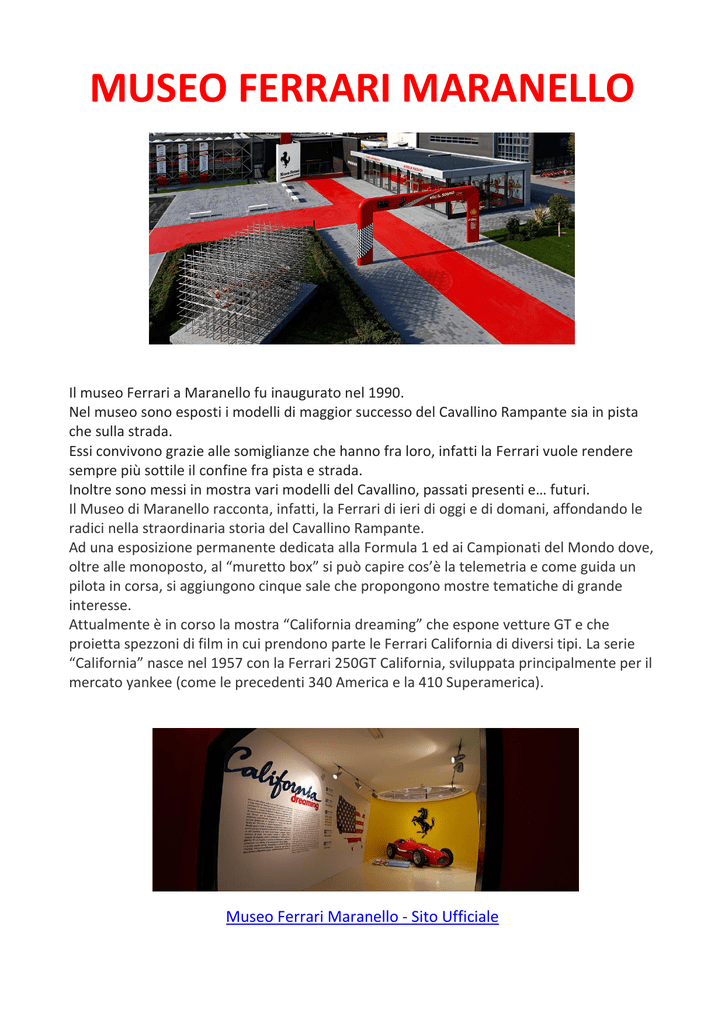 MUSEO FERRARI MARANELLO Il museo Ferrari a Maranello fu inaugurato nel 1990. Nel museo sono esposti i modelli di maggior successo del Cavallino Rampante sia in pista che sulla strada. Essi convivono grazie alle somiglianze che hanno fra loro, infatti la Ferrari vuole rendere sempre più sottile il confine fra pista e strada. Inoltre sono messi in mostra vari modelli del Cavallino, passati presenti e… futuri. Il Museo di Maranello racconta, infatti, la Ferrari di ieri di oggi e di domani, affondando le radici nella straordinaria storia del Cavallino Rampante. Ad una esposizione permanente dedicata alla Formula 1 ed ai Campionati del Mondo dove, oltre alle monoposto, al “muretto box” si può capire cos’è la telemetria e come guida un pilota in corsa, si aggiungono cinque sale che propongono mostre tematiche di grande interesse. Attualmente è in corso la mostra “California dreaming” che espone vetture GT e che proietta spezzoni di film in cui prendono parte le Ferrari California di diversi tipi. La serie “California” nasce nel 1957 con la Ferrari 250GT California, sviluppata principalmente per il mercato yankee (come le precedenti 340 America e la 410 Superamerica). Museo Ferrari Maranello - Sito Ufficiale