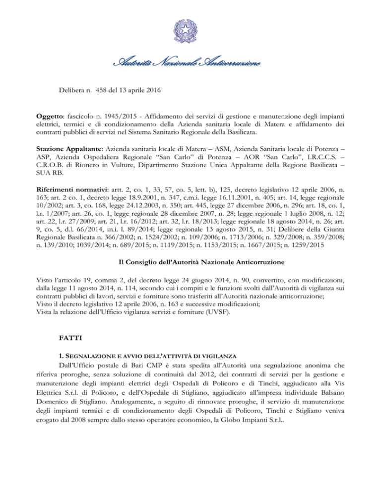 Autorità Nazionale Anticorruzione Delibera n. 458 del 13 aprile 2016 Oggetto: fascicolo n. 1945/2015 - Affidamento dei servizi di gestione e manutenzione degli impianti elettrici, termici e di condizionamento della Azienda sanitaria locale di Matera e affidamento dei contratti pubblici di servizi nel Sistema Sanitario Regionale della Basilicata. Stazione Appaltante: Azienda sanitaria locale di Matera – ASM, Azienda Sanitaria locale di Potenza – ASP, Azienda Ospedaliera Regionale “San Carlo” di Potenza – AOR “San Carlo”, I.R.C.C.S. – C.R.O.B. di Rionero in Vulture, Dipartimento Stazione Unica Appaltante della Regione Basilicata – SUA RB. Riferimenti normativi: artt. 2, co. 1, 33, 57, co. 5, lett. b), 125, decreto legislativo 12 aprile 2006, n. 163; art. 2 co. 1, decreto legge 18.9.2001, n. 347, c.m.i. legge 16.11.2001, n. 405; art. 14, legge regionale 10/2002; art. 3, co. 168, legge 24.12.2003, n. 350; art. 445, legge 27 dicembre 2006, n. 296; art. 18, co. 1, l.r. 1/2007; art. 26, co. 1, legge regionale 28 dicembre 2007, n. 28; legge regionale 1 luglio 2008, n. 12; art. 22, l.r. 27/2009; art. 21, l.r. 16/2012; art. 32, l.r. 18/2013; legge regionale 18 agosto 2014, n. 26; art. 9, co. 5, d.l. 66/2014, m.i. l. 89/2014; legge regionale 13 agosto 2015, n. 31; Delibere della Giunta Regionale Basilicata n. 366/2002; n. 1524/2002; n. 109/2006; n. 1713/2006; n. 329/2008; n. 359/2008; n. 139/2010; 1039/2014; n. 689/2015; n. 1119/2015; n. 1153/2015; n. 1667/2015; n. 1259/2015 Il Consiglio dell’Autorità Nazionale Anticorruzione Visto l’articolo 19, comma 2, del decreto legge 24 giugno 2014, n. 90, convertito, con modificazioni, dalla legge 11 agosto 2014, n. 114, secondo cui i compiti e le funzioni svolti dall’Autorità di vigilanza sui contratti pubblici di lavori, servizi e forniture sono trasferiti all’Autorità nazionale anticorruzione; Visto il decreto legislativo 12 aprile 2006, n. 163 e successive modificazioni; Vista la relazione dell’Ufficio vigilanza servizi e forniture (UVSF). FATTI 1. SEGNALAZIONE E AVVIO DELL’ATTIVITÀ DI VIGILANZA Dall’Ufficio postale di Bari CMP è stata spedita all’Autorità una segnalazione anonima che riferiva proroghe, senza soluzione di continuità dal 2012, dei contratti di servizi per la gestione e manutenzione degli impianti elettrici degli Ospedali di Policoro e di Tinchi, aggiudicato alla Vis Elettrica S.r.l. di Policoro, e dell’Ospedale di Stigliano, aggiudicato all’impresa individuale Balsano Domenico di Stigliano. Analogamente, a seguito di rinnovate proroghe, il servizio di manutenzione degli impianti termici e di condizionamento degli Ospedali di Policoro, Tinchi e Stigliano veniva erogato dal 2008 sempre dallo stesso operatore economico, la Globo Impianti S.r.l.. [ … omissis … ] Sui profili di stretta competenza, l’Autorità, dopo i primi riscontri emersi in fase di preistruttoria, ha avviato un procedimento di vigilanza nei confronti dei predetti Presidi ospedalieri, oggi Azienda Sanitaria Locale di Matera (di seguito, anche, ASM), e al fine di valutare la condotta contrattuale della stessa ASM ha richiesto una relazione dettagliata sui profili di criticità sopra evidenziati e la predisposizione di una tabella ricognitiva, dal 2008, di tutti gli affidamenti del servizio di gestione e manutenzione degli impianti elettrici, termici e di condizionamento1. L’ASM nella nota di riscontro, con allegata tabella ricognitiva, ha, preliminarmente, chiarito che nel 2008 è stato avviato il riassetto territoriale dei Presidi ospedalieri della Regione Basilicata e, poi, ricostruito le vicende inerenti ai singoli affidamenti contestati, motivando le proroghe con «ovvi motivi di sicurezza e necessità» per i quali ha «proceduto con determine dirigenziali ad impegnare, ogni quattro mesi, le somme economiche necessarie per remunerare le ditte che hanno continuato a svolgere le attività di manutenzione in conformità all’art. 125, co. 10, lett. d), del d.lgs. 163/2006». Alla luce delle criticità emerse nei fatti riportati dalla ASM e negli approfondimenti istruttori, nel proseguo puntualmente descritti, l’Autorità, mediante la propria Banca dati nazionale sui contratti pubblici (BDNCP), ha verificato i dati contenuti nella predetta tabella ricognitiva e accertato se le stazioni appaltanti competenti nel tempo a bandire le gare (Presidi ospedalieri, ASM, soggetto capofila della gara in U.R.A. e poi la SUA RB) avessero indetto procedure ad evidenza pubblica per affidare i servizi di gestione e manutenzione degli impianti elettrici, termici e di condizionamento. L’Autorità ha, inoltre, controllato le modalità di affidamento dei contratti di servizi nel Sistema Sanitario regionale della Basilicata (di seguito, anche, SSR), estendendo il focus dell’attività di vigilanza a tutti gli affidamenti di servizi extra-sanitari di tutte le aziende del SSR lucano nel periodo di riferimento (2008-2015). Gli esiti istruttori, approvati dal Consiglio nell’adunanza dell’11 novembre 2015, sono stati comunicati alle stazioni appaltanti, contestualmente alla loro convocazione in audizione presso il Consiglio dell’Autorità. Nell’audizione, svoltasi nella seduta del Consiglio del 10 dicembre 2015, i soggetti convocati2 hanno sostanzialmente confermato il quadro fattuale ricostruito dall’Autorità e depositato memorie, riservandosi l’invio di documentazione aggiuntiva3. Dall’esame della documentazione in atti e dei dati estratti dalla BDNCP, oltreché dai chiarimenti forniti in sede di Audizione, sono emerse diffuse anomalie sia sugli specifici appalti di servizi lamentati dal segnalante sia più in generale sulle condotte contrattuali di tutte le stazioni appaltanti in cui si articola il SSR, e una inappropriata cornice legislativa, regolamentare e organizzativa che, come si vedrà a breve (par. 2), non ha sufficientemente tutelato il sistema degli appalti di servizi da irregolarità, con significativi effetti dis
