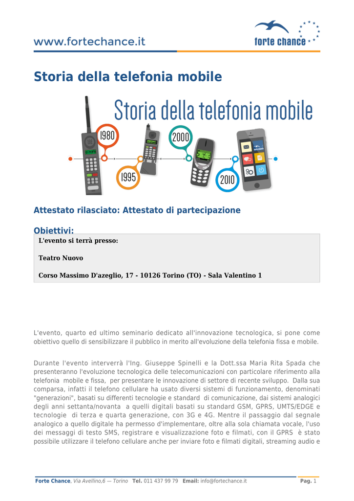 Storia della telefonia mobile Attestato rilasciato: Attestato di partecipazione Obiettivi: L'evento si terrà presso: Teatro Nuovo Corso Massimo D'azeglio, 17 - 10126 Torino (TO) - Sala Valentino 1 L'evento, quarto ed ultimo seminario dedicato all'innovazione tecnologica, si pone come obiettivo quello di sensibilizzare il pubblico in merito all'evoluzione della telefonia fissa e mobile. Durante l'evento interverrà l'Ing. Giuseppe Spinelli e la Dott.ssa Maria Rita Spada che presenteranno l'evoluzione tecnologica delle telecomunicazioni con particolare riferimento alla telefonia mobile e fissa, per presentare le innovazione di settore di recente sviluppo. Dalla sua comparsa, infatti il telefono cellulare ha usato diversi sistemi di funzionamento, denominati "generazioni", basati su differenti tecnologie e standard di comunicazione, dai sistemi analogici degli anni settanta/novanta a quelli digitali basati su standard GSM, GPRS, UMTS/EDGE e tecnologie di terza e quarta generazione, con 3G e 4G. Mentre il passaggio dal segnale analogico a quello digitale ha permesso d'implementare, oltre alla sola chiamata vocale, l'uso dei messaggi di testo SMS, registrare e visualizzazione foto e filmati, con il GPRS è stato possibile utilizzare il telefono cellulare anche per inviare foto e filmati digitali, streaming audio e Forte Chance, Via Avellino,6 — Torino Tel. 011 437 99 79 Email: [email protected] Pag. 1 video (generalmente solo con l'EDGE, l'ultima evoluzione del 2G), navigare in Internet e spedire e-mail, mentre con l'UMTS(terza generazione) si sono aperte le porte alle video telefonate (successivamente venne integrata la possibilità anche ai dispositivi 2G). Si tratta pertanto di un'occasione per comprendere le innovazioni, le nuove le strategie e le prospettive di settore per il futuro. L'evento è patrocinato da Circoscrizione 8, AEIT e UNAE. Programma didattico 15:00 - Registrazione partecipanti 15:15 - Saluti introduttivi: Ing. Elena Carolei (Forte Chance Piemonte), Dott. Carlo Formento (Presidente AEIT Sezione Piemonte e Valle d'Aosta) 15:30 - Dott. Ing. Giuseppe Spinelli (Libero professionista e consigliere della sezione AEIT del Piemonte e Valle D'Aosta) ● Storia ed evoluzione della telefonia 16:30 - Dott.ssa Maria Rita Spada (Technolgy Innovation Manager Wind / 3) ● L'evoluzione tecnologica della telefonia mobile dalle prime tramissioni alle reti 5G 17:00 - Domande dei partecipanti Requisiti, modalità di accesso, posti disponibili Destinatari: Titolo di studio richiesto: Licenza media inferiore Modalità di accesso: In ordine di arrivo Limite posti: 99 Forte Chance, Via Avellino,6 — Torino Tel. 011 437 99 79 Email: [email protected] Pag. 2 Date, orari, durata, sede di svolgimento: Orario: 15:00 - 17:30 Ore totali del corso: 2 Ore stage: 0 Inizio corso: 13/12/2016 Fine iscrizione: 12/12/2016 Sede: Teatro Nuovo Costo: Gratuito Stato: Approvato Forte Chance, Via Avellino,6 — Torino Tel. 011 437 99 79 Email: [email protected] Pag. 3