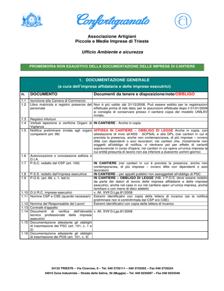 Associazione Artigiani Piccole e Medie Imprese di Trieste Ufficio Ambiente e sicurezza PROMEMORIA NON ESAUSTIVO DELLA DOCUMENTAZIONE DELLE IMPRESE DI CANTIERE 1. DOCUMENTAZIONE GENERALE (a cura dell’impresa affidataria e delle imprese esecutrici) n. DOCUMENTO 1.1 1.2 Iscrizione alla Camera di Commercio Libro matricola e registro presenze del Non è più valido dal 31/12/2008. Può essere esibito per le registrazioni personale effettuate prima di tale data; per le assunzioni effettuate dopo il 01/01/2009 si consiglia di conservare presso il cantiere copia del modello UNILAV inviato. Registro infortuni Verbali ispezione e verifiche Organi di IN CANTIERE - Anche in copia Vigilanza Notifica preliminare inviata agli organi AFFISSA IN CANTIERE – OBBLIGO DI LEGGE Anche in copia, con competenti (art. 99) attestazione di invio all’ASS - SCPSAL e alla DPL (nei cantieri in cui è prevista la presenza, anche non contemporanea, di più imprese – ovvero ditte con dipendenti o soci lavoratori; nei cantieri che, inizialmente non soggetti all'obbligo di notifica, vi rientrano poi per effetto di varianti sopravvenute in corso d'opera; nei cantieri in cui opera un'unica impresa la cui entità presunta di lavoro non sia inferiore a duecento uomini-giorno) Autorizzazione o concessione edilizia o D.I.A. IN CANTIERE (nei cantieri in cui è prevista la presenza, anche non P.S.C. redatto dal CSP (art. 100) contemporanea, di più imprese – ovvero ditte con dipendenti o soci lavoratori) IN CANTIERE – per appalti pubblici non assoggettati all’obbligo di PSC P.S.S. redatto dall’impresa esecutrice IN CANTIERE – OBBLIGO DI LEGGE (NB: il P.O.S. deve essere redatto P.O.S. (art. 89, c. 1, lett.h) da parte dei datori di lavoro delle imprese affidatarie e delle imprese esecutrici, anche nel caso in cui nel cantiere operi un’unica impresa, anche familiare o con meno di dieci addetti) D.U.R.C. imprese esecutrici v. All. XVII D.Lgs.81/2008 Nomine CSP e CSE (quando necessari) Estremi identificativi con copia della lettera di incarico (se la notifica preliminare non è controfirmata dal CSP e/o CSE) Nomina del Responsabile dei Lavori Estremi identificativi con copia della lettera di incarico Contratti d’appalto Documenti di verifica dell’idoneità v. All. XVII D.Lgs.81/2008 tecnico professionale delle imprese esecutrici Documentazione attestante gli obblighi di trasmissione del PSC (art. 101, c. 1 e 2) Documentazione attestante gli obblighi di trasmissione dei POS (art. 101, c. 3) 1.3 1.4 1.5 1.6 1.7 1.8 1.9 1.10 1.11 1.12 1.13 1.14 1.15 1.16 Documenti da tenere e disposizione/note/OBBLIGO 34133 TRIESTE – Via Cicerone, 9 – Tel. 040 3735111 – 040 3735202 – Fax 040 3735224 34015 Zona Industriale – Strada delle Saline, 30 (Muggia) – Tel. 040 9235097 – Fax 040 9234340 2. SISTEMA DI SICUREZZA AZIENDALE (a cura dell’impresa affidataria e delle imprese esecutrici) n. DOCUMENTO Documenti da tenere e disposizione/note/OBBLIGO 2.1 Nomina del RSPP e eventuali ASPP dell’impresa Nomina del MC dell’impresa Nomine dei lavoratori addetti alle emergenze: pronto soccorso ed antincendio per il cantiere Indicazione del Rappresentante dei lavoratori per la sicurezza Estremi identificativi con attestati di formazione 2.2 2.3 2.4 2.5 2.6 2.7 2.8 2.9 2.10 2.11 2.12 2.13 2.14 Estremi identificativi con copia della lettera di incarico Estremi identificativi con copia della lettera di incarico e attestati di formazione Estremi identificativi e attestati di formazione (ovvero documentazione comprovante l’avvenuta informazione ai lavoratori del loro diritto ad eleggere il RLS) Estremi identificativi Nomine di eventuali preposti Eventuali deleghe in materia di sicurezza sul lavoro conferite a terzi dal titolare della ditta Documento di valutazione dei rischi e Copia del documento programma di attuazione delle misure di sicurezza Piano per la gestione delle emergenze Copia del documento per le imprese che occupano più di 10 dipendenti e per i cantieri Programma informativo e formativo per i Copia dei documenti che attestano l’attività informativa e formativa erogata lavoratori ai dipendenti Procedure ed istruzioni aziendali di Dove presenti (anche estratte dal documento di cui al precedente punto sicurezza 2.7) Verbali riunioni periodiche Copia dei verbali (per imprese con più di 15 dipendenti) Piano di sorveglianza sanitaria e cartelle sanitarie e di rischio dei dipendenti (art. 25, c. 1, lett. b, c) Giudizi del MC di idoneità specifica alla Copia dei certificati di idoneità alla mansione dei dipendenti presenti mansione dei dipendenti (art. 41, c. 6) Vaccinazione antitetanica (L.292/63) Copia dei tesserini di vaccinazione dei dipendenti presenti in cantiere (ove obbligatorie e/o prescritte dal MC) 3. PRODOTTI E SOSTANZE n. DOCUMENTO Documenti da tenere e disposizione/note/OBBLIGO 3.1 3.2 Valutazione del rischio chimico Schede di sicurezza dei prodotti e delle sostanze chimiche pericolose Istruzioni e procedure di lavoro specifiche, uso dei dispositivi di protezione Piano di lavoro per interventi che prevedono la rimozione di materiali contenenti amianto IN CANTIERE (contenuto obbligatorio del POS) - Anche in copia IN CANTIERE (contenuto obbligatorio del POS) - Anche in copia 3.3 3.4 IN CANTIERE (contenuto obbligatorio del POS) documentazione distribuita ai lavoratori IN CANTIERE – OBBLIGO DI LEGGE bonifica da effettuarsi presso il cantiere) - Copia della (è il DVR relativo ai lavori di 34133 TRIESTE – Via Cicerone, 9 – Tel. 040 3735111 – 040 3735202 – Fax 040 3735224 34015 Zona Industriale – Strada delle Saline, 30 (Muggia) – Tel. 040 9235097 – Fax 040 9234340 4. DISPOSITIVI DI PROTENZIONE INDIVIDUALE n. DOCUMENTO 4.1 Elenco dei DPI con ricevuta della IN CANTIERE (contenuto obbligatorio del POS) consegna e istruzioni per uso e manutenzione Certificati di conformità dei DPI Attestati di formazione uso dei DPI di III IN CANTIERE (contenuto obbligatorio del POS) cat. (I DPI di III cat. Son