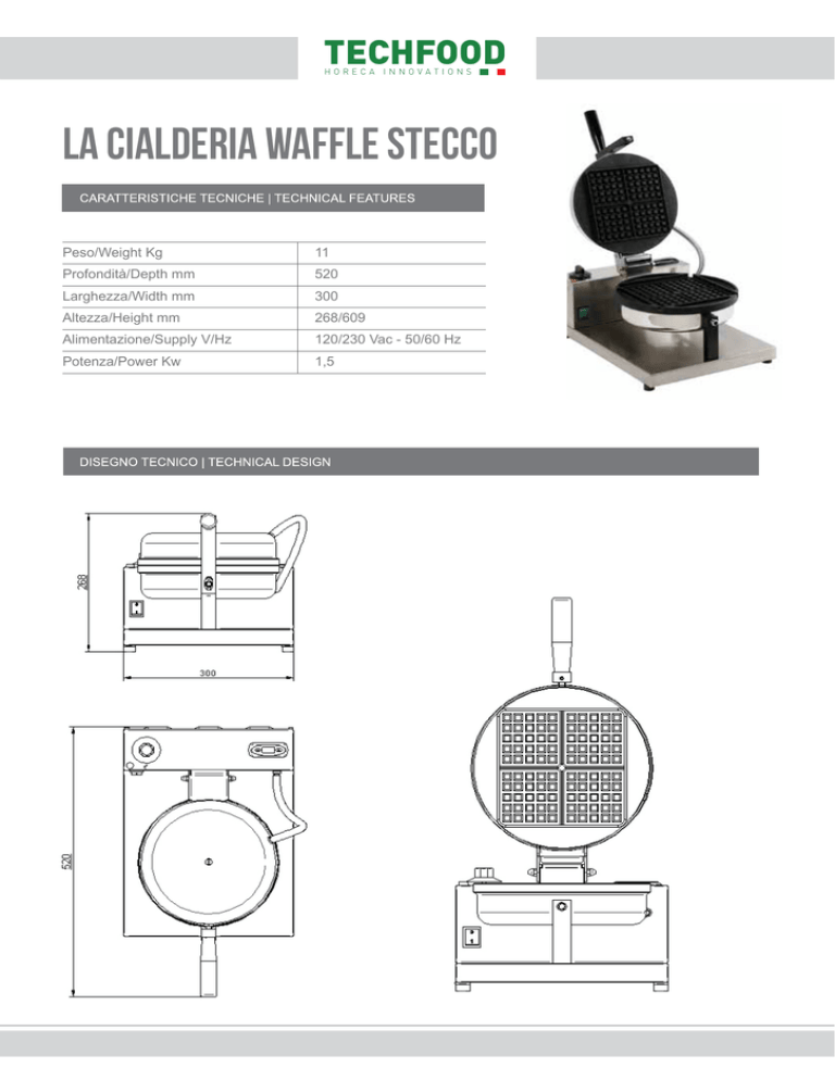 TECHFOOD HORECA INNOVATIONS la cialderia waffle stecco TECHFOOD HORECA INNOVATIONS Peso/Weight Kg11 Profondità/Depth mm520 Larghezza/Width mm300 Altezza/Height mm268/609 Alimentazione/Supply V/Hz 120/230 TECHFOOD Vac - 50/60 Hz Social media Potenza/Power Kw1,5 T Icona per cellulare e favicon