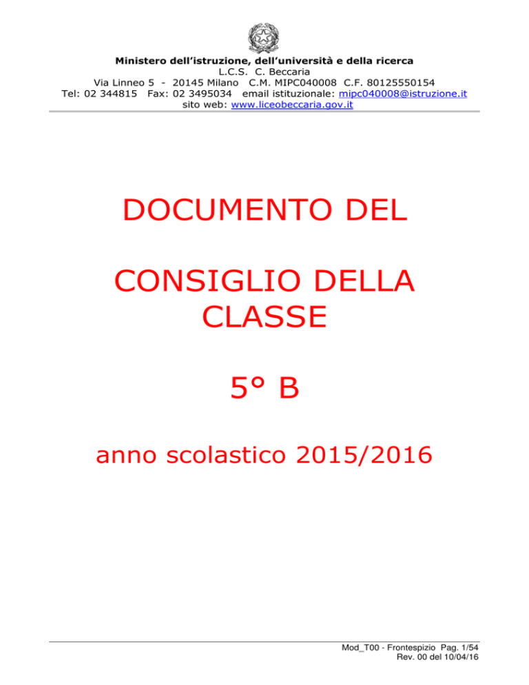 Ministero dell’istruzione, dell’università e della ricerca L.C.S. C. Beccaria Via Linneo 5 - 20145 Milano C.M. MIPC040008 C.F. 80125550154 Tel: 02 344815 Fax: 02 3495034 email istituzionale: [email protected] sito web: www.liceobeccaria.gov.it DOCUMENTO DEL CONSIGLIO DELLA CLASSE 5° B anno scolastico 2015/2016 Mod_T00 - Frontespizio Pag. 1/54 Rev. 00 del 10/04/16 Ministero dell’istruzione, dell’università e della ricerca L.C.S. C. Beccaria Via Linneo 5 - 20145 Milano C.M. MIPC040008 C.F. 80125550154 Tel: 02 344815 Fax: 02 3495034 email istituzionale: [email protected] sito web: www.liceobeccaria.gov.it INDICE Sintesi dell’offerta formativa Indicatori e griglia di valutazione per lo scritto di Italiano Criteri e griglia di valutazione per lo scritto di Latino e Greco Criteri e griglia di valutazione per la Terza prova Criteri e griglia di valutazione per il colloquio Presentazione della classe Programmazione didattica disciplinare: • • • • • • • • • • • • Italiano Latino Greco Lingua Straniera (Inglese) Storia Filosofia Matematica Fisica Scienze Storia dell’arte Educazione Fisica Religione Schede informative per la predisposizione della Terza prova e quesiti delle simulazioni Mod_T00 - Frontespizio Pag. 2/54 Rev. 00 del 10/04/16 Ministero dell’istruzione, dell’università e della ricerca L.C.S. C. Beccaria Via Linneo 5 - 20145 Milano C.M. MIPC040008 C.F. 80125550154 Tel: 02 344815 Fax: 02 3495034 email istituzionale: [email protected] sito web: www.liceobeccaria.gov.it Documento del Consiglio di Classe (parte comune) Anno scolastico 2015/2016 - Classe 5^ Sezione SINTESI DELL’OFFERTA FORMATIVA Indicazioni dal POF 2015/2016 Ragion d’essere del Liceo L’identità del Liceo Beccaria si caratterizza per la continua ricerca di coerenza tra i compiti istituzionali della scuola e i cambiamenti della società e della cultura attraverso la trasmissione e la dinamica interpretazione dei valori e dei saperi del mondo classico e del mondo contemporaneo. Il profilo dello studente In armonia con la “ragion d’essere” dell’Istituto il Collegio dei Docenti ha definito l’insieme delle competenze caratterizzanti il profilo delle studentesse e degli studenti che completano il proprio percorso di formazione quinquennale presso il Liceo Beccaria. L’acquisizione di tali competenze è la finalità comune dei piani di studio e dei progetti compresi nell’offerta formativa e costituisce lo specifico contributo del Liceo al processo di sviluppo della persona. Competenze per la formazione permanente • organizzare in modo autonomo lo studio, nella consapevolezza del continuo aggiornamento richiesto dalla società contemporanea • valorizzare le proprie attitudini individuali, orientandosi nell’elaborazione di un progetto personale per gli studi universitari e l’inserimento nel mondo del lavoro • comprendere criticamente il presente, formulando giudizi autonomi e razionalmente giustificati Competenze per la comunicazione e la produzione culturale • padroneggiare i linguaggi disciplinari per acquisire correttamente le informazioni, per esprimere con proprietà e argomentare con coerenza le proprie conoscenze, ipotesi, opinioni, … • disporre degli strumenti concettuali e metodologici necessari per analizzare e interpretare la produzione culturale dei diversi ambiti disciplinari (testi letterari, opere d’arte, …) e per ricercare la soluzione di problemi • ricostruire lo sviluppo della cultura occidentale in ambito letterario, artistico, filosofico e scientifico, richiamando in prospettiva storica e rielaborando criticamente le conoscenze acquisite nel corso degli studi • comprendere il valore culturale e formativo del confronto con l’eredità classica, individuando nelle civiltà greca e latina le radici di interrogativi, forme di sapere ed espressione che hanno contrassegnato lo sviluppo della civiltà europea • individuare i rapporti tra le lingue classiche, la lingua italiana, le lingue straniere, i linguaggi settoriali e cogliere le connessioni tra le discipline studiate nel quadro di una visione unitaria del sapere Mod_T00 - Frontespizio Pag. 3/54 Rev. 00 del 10/04/16 Competenze per la convivenza civile • maturare comportamenti coerenti con i principi della Costituzione e sviluppare la disponibilità al confronto necessaria in una società pluralistica • interagire con gli altri, collaborando responsabilmente alla soluzione dei problemi e allo svolgimento di attività comuni, nel rispetto delle potenzialità individuali e delle regole della convivenza civile • conoscere i diritti e i doveri della cittadinanza italiana ed europea e comprendere il valore della cooperazione internazionale e del confronto con culture diverse. (vd. www.liceobeccaria.gov.it / Istituto / POF - Piano dell’Offerta Formativa / L’identità del Liceo e il profilo dello studente) LA VALUTAZIONE a) La valutazione dell’apprendimento Il Liceo “Beccaria” considera la valutazione come il risultato di un processo dialettico fra l'autonomia e la specificità dei Consigli di Classe e il Collegio dei Docenti. Quest’ultimo, nel rispetto della normativa e delle sue prerogative, indica i criteri generali per la valutazione e per la promozione degli studenti. I Dipartimenti disciplinari elaborano annualmente il documento di Programmazione didattica relativo alle singole materie insegnate. Il documento delinea il profilo delle competenze degli allievi al termine dei primi due anni e dell’intero ciclo di studi e precisa le modalità di verifica, gli indicatori e i livelli di valutazione disciplinari (vd. vd. www.liceobeccaria.gov.it / Didattica / Programmazione didattica). Nel Documento di programmazione annuale, infine, i Consigli di Classe – tenendo conto del profilo dello studente e dei documenti dei Dipartimenti – specificano le competenze trasversali assunte come obiettivi del lavoro comune e gli indicatori per valutarne l’acquisizione da parte
