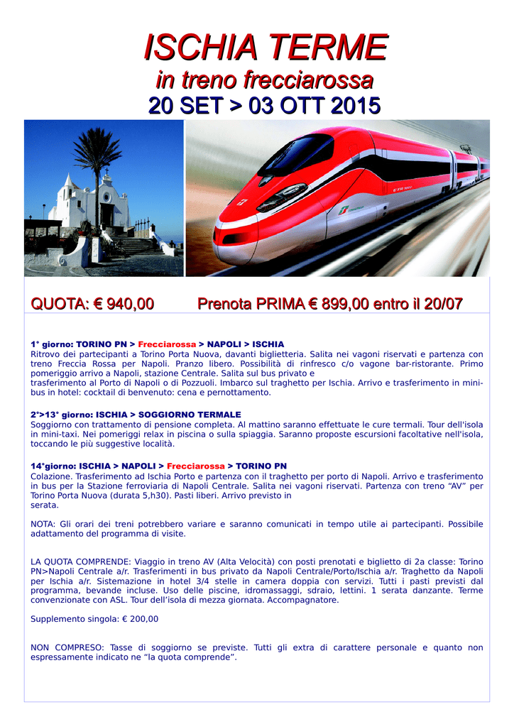 ISCHIA TERME in treno frecciarossa 20 SET > 03 OTT 2015 QUOTA: € 940,00 Prenota PRIMA € 899,00 entro il 20/07 1° giorno: TORINO PN > Frecciarossa > NAPOLI > ISCHIA Ritrovo dei partecipanti a Torino Porta Nuova, davanti biglietteria. Salita nei vagoni riservati e partenza con treno Freccia Rossa per Napoli. Pranzo libero. Possibilità di rinfresco c/o vagone bar-ristorante. Primo pomeriggio arrivo a Napoli, stazione Centrale. Salita sul bus privato e trasferimento al Porto di Napoli o di Pozzuoli. Imbarco sul traghetto per Ischia. Arrivo e trasferimento in minibus in hotel: cocktail di benvenuto: cena e pernottamento. 2°>13° giorno: ISCHIA > SOGGIORNO TERMALE Soggiorno con trattamento di pensione completa. Al mattino saranno effettuate le cure termali. Tour dell'isola in mini-taxi. Nei pomeriggi relax in piscina o sulla spiaggia. Saranno proposte escursioni facoltative nell'isola, toccando le più suggestive località. 14°giorno: ISCHIA > NAPOLI > Frecciarossa > TORINO PN Colazione. Trasferimento ad Ischia Porto e partenza con il traghetto per porto di Napoli. Arrivo e trasferimento in bus per la Stazione ferroviaria di Napoli Centrale. Salita nei vagoni riservati. Partenza con treno “AV” per Torino Porta Nuova (durata 5,h30). Pasti liberi. Arrivo previsto in serata. NOTA: Gli orari dei treni potrebbero variare e saranno comunicati in tempo utile ai partecipanti. Possibile adattamento del programma di visite. LA QUOTA COMPRENDE: Viaggio in treno AV (Alta Velocità) con posti prenotati e biglietto di 2a classe: Torino PN>Napoli Centrale a/r. Trasferimenti in bus privato da Napoli Centrale/Porto/Ischia a/r. Traghetto da Napoli per Ischia a/r. Sistemazione in hotel 3/4 stelle in camera doppia con servizi. Tutti i pasti previsti dal programma, bevande incluse. Uso delle piscine, idromassaggi, sdraio, lettini. 1 serata danzante. Terme convenzionate con ASL. Tour dell’isola di mezza giornata. Accompagnatore. Supplemento singola: € 200,00 NON COMPRESO: Tasse di soggiorno se previste. Tutti gli extra di carattere personale e quanto non espressamente indicato ne “la quota comprende”.