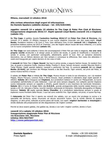 Milano, mercoledì 12 ottobre 2016 Alla cortese attenzione degli organi di informazione Da Daniele Spadaro (addetto stampa – tel. 335/6262260) oggetto: venerdì 14 e sabato 15 ottobre In The Cage @ Peter Pan Club di Riccione, inaugurazione stagionale 2016/17. Ospiti speciali Lloyd Banks (venerdì 14) e Claptone (sabato 15). In The Cage, in gabbia. Questo l’autentico hashtag 2016/17 del Peter Pan Club di Riccione, che venerdì 14 e sabato 15 ottobre inaugura la sua nuova stagione invernale con due super-ospiti: Lloyd Banks, fondatore insieme a 50 Cent e Tony Yayo dell’epica crew G-Unit (venerdì 14) e Claptone, dj e produttore tedesco autore nel 2015 di ‘Charmer’, uno dei migliori album house del terzo millennio, e in uscita con la nuova compilation Defected (sabato 15). In The Cage non sarà soltanto il tema che accompagnerà il Peter Pan per tutta la stagione, ma una vera propria novità strutturale e di design posta al centro del locale, in grado di modificarlo e innovarlo di serata in serata, con particolari scenografie, allestimenti, giochi di luce. Non un semplice elemento decorativo, ma un fattore decisivo per fare sempre e comunque la differenza. Non resta che attendere il week-end inaugurale per capire davvero di che cosa si tratti. Il venerdì del Peter Pan è Open Sound: hip hop in prima serata, a seguire fashion house. Dj resident Don Joe, dj guest a rotazione Ciuffo, Gianluca Motta, Frankie P, Rivaz, Sylvain Armand; vocalist Maurizio Monti e Tanja Monies. Ospiti speciali ballerini, cantanti e performer hip hop. Si comincia venerdì 14 con Lloyd Banks (G-Unit), già vincitore dei Mixtape Awards e dei Bet Awards. Ogni venerdì, nel privè del Peter, si suona musica techno e house. Il sabato del Peter Pan si intitola In The Cage. Musica House in tutte le sue sfumature, con i dj resident Mappa, Mauro Ferrucci, Lorenzo Rumi e Brina Knauss. Assai prelibato il calendario degli ospiti speciali di ottobre. Sabato 15 si inaugura con Claptone, dj e produttore tedesco in uscita con ‘Masquerade’, la nuova compilation dell’etichetta di culto Defected: i suoi set sono sempre eleganti, non soltanto perché Claptone suona indossando sempre un cappello a cilindro, guanti bianchi e una maschera da Carnevale Veneziano. Sabato 22 è il turno di Holger Behn aka H.O.S.H., grande protagonista della recente estate ibizenca con serate a DC-10, Ushuaïa e Pacha, nonché membro autorevole di Diynamic, l’etichetta discografica di Mladen Solomun. Sabato 29 ospite speciale Kerry Chandler, dj e produttore statunitense sempre in grado di esplorare nuove frontiere della House. I suoi set sono autentici live. Ogni sabato, nel privè, si suona hip-hop. Il ristorante del Peter Pan è aperto sia venerdì che sabato, con un menù che privilegia la cucina e le specialità del territorio, senza rinunciare ad alcune escursioni fusion. Tra le novità ulteriori di questa stagione, un altro privè, collocato al primo piano del locale, con ospiti i migliori bartender e mixologist e serate dedicate alla preparazione ed alla degustazione dei migliori cocktail. Perché se deve essere gabbia, che gabbia sia, dorata e con tutti i migliori comfort, dentro e fuori. venerdì 14 e sabato 15 ottobre 2016 Inaugurazione stagionale Peter Pan di Riccione via Scacciano 161, Riccione infoline 393/5027597 http://www.peterpanclub.net/ Daniele Spadaro Press Agent Mobile: +39 335 6262260 E-mail: [email protected] www.spadaronews.co.uk Daniele Spadaro Press Agent Mobile: +39 335 6262260 E-mail: [email protected] www.spadaronews.co.uk