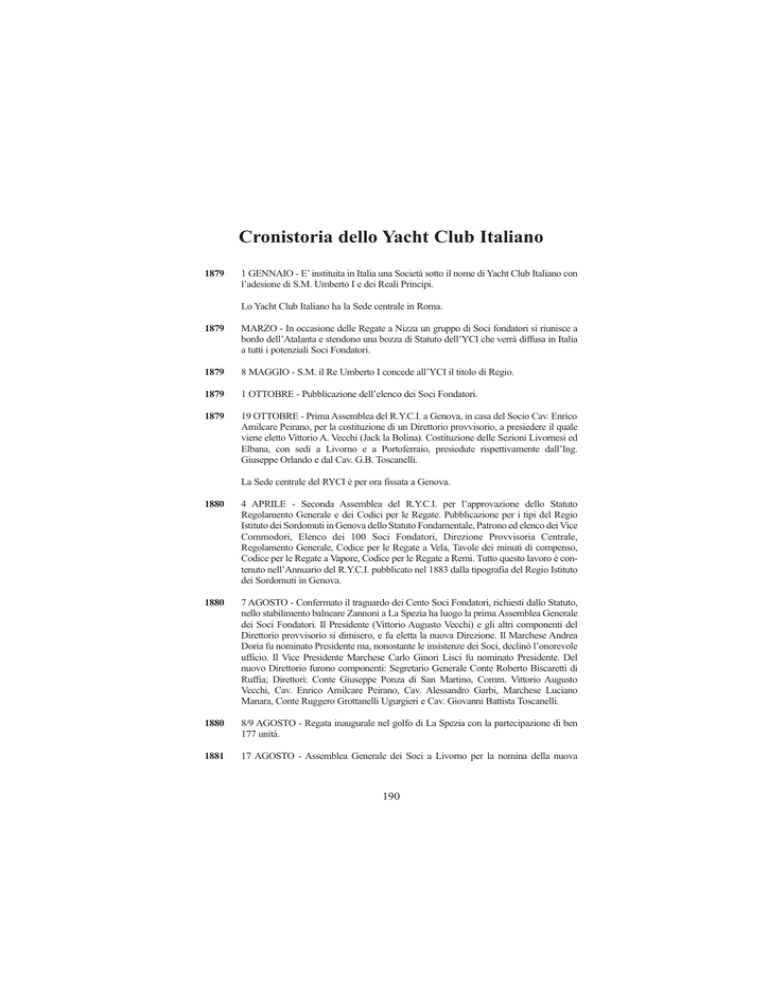 quarta parte.qxd:Layout 1 26-02-2007 14:02 Pagina 190 Cronistoria dello Yacht Club Italiano 1879 1 GENNAIO - E’ instituita in Italia una Società sotto il nome di Yacht Club Italiano con l’adesione di S.M. Umberto I e dei Reali Principi. Lo Yacht Club Italiano ha la Sede centrale in Roma. 1879 MARZO - In occasione delle Regate a Nizza un gruppo di Soci fondatori si riunisce a bordo dell’Atalanta e stendono una bozza di Statuto dell’YCI che verrà diffusa in Italia a tutti i potenziali Soci Fondatori. 1879 8 MAGGIO - S.M. il Re Umberto I concede all’YCI il titolo di Regio. 1879 1 OTTOBRE - Pubblicazione dell’elenco dei Soci Fondatori. 1879 19 OTTOBRE - Prima Assemblea del R.Y.C.I. a Genova, in casa del Socio Cav. Enrico Amilcare Peirano, per la costituzione di un Direttorio provvisorio, a presiedere il quale viene eletto Vittorio A. Vecchi (Jack la Bolina). Costituzione delle Sezioni Livornesi ed Elbana, con sedi a Livorno e a Portoferraio, presiedute rispettivamente dall’Ing. Giuseppe Orlando e dal Cav. G.B. Toscanelli. La Sede centrale del RYCI è per ora fissata a Genova. 1880 4 APRILE - Seconda Assemblea del R.Y.C.I. per l’approvazione dello Statuto Regolamento Generale e dei Codici per le Regate. Pubblicazione per i tipi del Regio Istituto dei Sordomuti in Genova dello Statuto Fondamentale, Patrono ed elenco dei Vice Commodori, Elenco dei 100 Soci Fondatori, Direzione Provvisoria Centrale, Regolamento Generale, Codice per le Regate a Vela, Tavole dei minuti di compenso, Codice per le Regate a Vapore, Codice per le Regate a Remi. Tutto questo lavoro è contenuto nell’Annuario del R.Y.C.I. pubblicato nel 1883 dalla tipografia del Regio Istituto dei Sordomuti in Genova. 1880 7 AGOSTO - Confermato il traguardo dei Cento Soci Fondatori, richiesti dallo Statuto, nello stabilimento balneare Zannoni a La Spezia ha luogo la prima Assemblea Generale dei Soci Fondatori. Il Presidente (Vittorio Augusto Vecchi) e gli altri componenti del Direttorio provvisorio si dimisero, e fu eletta la nuova Direzione. Il Marchese Andrea Doria fu nominato Presidente ma, nonostante le insistenze dei Soci, declinò l’onorevole ufficio. Il Vice Presidente Marchese Carlo Ginori Lisci fu nominato Presidente. Del nuovo Direttorio furono componenti: Segretario Generale Conte Roberto Biscaretti di Ruffia; Direttori: Conte Giuseppe Ponza di San Martino, Comm. Vittorio Augusto Vecchi, Cav. Enrico Amilcare Peirano, Cav. Alessandro Garbi, Marchese Luciano Manara, Conte Ruggero Grottanelli Ugurgieri e Cav. Giovanni Battista Toscanelli. 1880 8/9 AGOSTO - Regata inaugurale nel golfo di La Spezia con la partecipazione di ben 177 unità. 1881 17 AGOSTO - Assemblea Generale dei Soci a Livorno per la nomina della nuova 190 quarta parte.qxd:Layout 1 26-02-2007 14:02 Pagina 191 CRONISTORIA Direzione a Presidente della quale viene rieletto per acclamazione il Marchese Carlo Ginori Lisci, Deputato al Parlamento. A Segretario Generale viene riconfermato il Conte Roberto Biscaretti di Ruffia. Sulla proposta della Direzione vengono votati all’unanimità tre diplomi d’onore ai Soci Comm. Raffaele Rubattino e F.lli Ingg. Giuseppe e Salvatore Orlando, per speciali benemerenze verso il R.Y.C.I. 1882 13 APRILE - Sotto la Presidenza del Marchese Carlo Ginori Lisci vengono nominati Vice Presidente il Marchese Luciano Manara, Segretario Generale il Conte Roberto Biscaretti di Ruffia, Vice Segretario il Cav. Garibaldi Coltelletti, Cassiere il Cav. Enrico Amilcare Peirano. Il R.Y.C.I. apre la sua Sede Sociale nella Torretta o Villetta Serra all’Acquasola. 1882 22 LUGLIO - La Presidenza del R.Y.C.I. inizia presso il Ministero della Marina le pratiche per ottenere alla navigazione nazionale da diporto, da essa promossa, quei privilegi indispensabili al suo maggiore sviluppo. 1883 21 GENNAIO - Pubblicazione del primo Annuario Sociale del R.Y.C.I. In quattro anni di vita la consistenza sociale è salita a 321 Soci di cui 100 Fondatori 94 Promotori e 127 Effettivi ed il naviglio sociale a 58 unità per un tonnellaggio globale di 1326 tonnellate. 1883 4 GIUGNO - Nomina della nuova Direzione a presiedere la quale viene rieletto all’unanimità il Marchese Carlo Ginori Lisci, Deputato al Parlamento. A Vice Presidente viene nominato il Cav. Garibaldi Coltelletti, già Vice Segretario dal 13 Aprile 1882, ed a Segretario Generale riconfermato il Conte Roberto Biscaretti di Ruffia. 1883 14 AGOSTO - Costituzione delle Sezioni di Civitavecchia e Partenopea con sedi rispettivamente a Civitavecchia ed a Napoli, presiedute la prima dal Principe Don Giuseppe Rospigliosi e la seconda dal Principe di Marsiconovo. 1886 1 LUGLIO - Il Ministro della Marina, con Decreto Ministeriale in pari data, accorda alle navi da diporto iscritte al R.Y.C.I., il diritto di battere la Bandiera Nazionale con Corona Reale secondo il modello usato per le Regie Navi da guerra. 1888 Si dimettono da Socio Roberto Biscaretti di Ruffia e A.V. Vecchi. 1889 21 SETTEMBRE - Il Ministero della Marina, comunica a tutte le Autorità, con il Foglio d’ordini ministeriale n. 23, un estratto delle facilitazioni e privilegi accordati al naviglio da diporto regolarmente iscritto al R.Y.C.I. 1890 19 LUGLIO - Regate Internazionali a vela indette dal R.Y.C.I. nel Golfo di Rapallo con la partecipazione di ben 35 unità da regata di cui quattro superiori alle 20 tonn., e precisamente «Costanza», «Fieramosca», «Cigno» e «Rina». 1892 Regate colombiane. 191 quarta parte.qxd:Layout 1 26-02-2007 14:02 Pagina 192 CRONISTORIA 1896 11 APRILE - I Soci proprietari di navi da diporto iscritte al R.Y.C.I. sono autorizzati dal Ministero della Marina a comandare le proprie unità senza l’obbligo di imbarcare alcuno degli ufficiali prescritti dall’articolo 66 del Codice per la Marina Mercantile. 1898 19 MAGGIO - Approvazione del Regolamento della «Coppa Italia» (vedi annuario R.Y.C.I. 1912) che S.A.R. Luigi Amedeo di Savoia-Aosta Duca degli Abruzzi ha ottenuto in dono da S.M. il Re