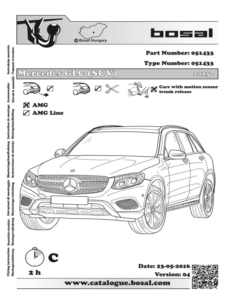 Fitting instruction Szerelési utasítás Istruzioni di montaggio Monteringshandledning Instruction de montage Asennusohje Instrukcja montazu Instrucciones de montaje Montagehandleiding Montageanleitung Montagevejledning Monteringsveiledning Návod k montázi op oK ycTaHoBK Bosal Hungary Part Number: 051433 Type Number: 051433 Mercedes GLC (SUV) C 2h 2015 - Cars with motion sensor trunk release AMG AMG Line Date: 23-05-2016 Version: 04 www.catalogue.bosal.com E7 55R-011616 ECE R55 homologation S = 100 kg D= MAX KG X MAX KG MAX KG + MAX KG X 0,00981 < 12,74 kN 2705 kg 2500 kg D = 12,74 kN GB The clearance specified in appendix VII, diagram 25 of guideline ECE-R 55 must be guaranteed. GB at laden weight of the vehicle D Der Freiraum nach Anhang VII, Abbildung 25 der Richtlinie ECE-R 55 ist zu gewährleisten. D bei zulässigem Gesamtgewicht des Fahrzeuges H H rakománnyal terhelt járműsúly esetén. F Az ECE-R 55 irányelv VII. mellékletében, a 25. ábrán a vonógömb elhelyezése számára előírt szabad tér-adatokat biztosítani kell. La zone de dégagement doit être garantie conformément à l’annexe VII, illustration 25 de la directive ECE-R 55. I Deve essere garantito lo spazio libero secondo l’allegato VII, figura 25 della direttiva ECE-R 55. NL De tussenruimte conform supplement VII, afbeelding 25 van de richtlijn ECE-R 55 moet in acht worden genomen. E N pour poids total en charge autorisé du véhicule I per un peso complessivo ammesso del veicolo NL bij toelaatbaar totaal gewicht van het voertuig E Debe garantizarse el espacio libre, conforme al anexo VII, figura 25 de la directiva comunitaria ECE-R 55. con peso total autorizado del vehiculo FIN ajoneuvon suurimmalla sallitulla kokonaispainolla FIN Vapaa tila on taattava direktiivin ECE-R 55 liitteen VII, kuvan 25 mukaisesti. S F Spelrummet enligt bilaga VII, figur 25 i riktlinje ECE-R 55 skall garanteras. Frirommet etter tillegg VII, figur 25 i direktiv ECE-R 55 skal overholdes. S vid fordonets tillĺtna totalvikt N ved kjøretøyets tillatte totalvekt CZ při celkové přípustné hmotnosti vozidla CZ Volný prostor ve smyslu Přílohy VII, obr. 25 Směrnice č. ECE-R 55 musí být zaručen. PL Należy zagwarantować wolną wysokość określoną na rysunku nr 25 dyrektywy ECE-R 55 zawartej w załączniku nr VII. RU Необходимо обеспечить данные свободного пространства, предписанные для размещения тягового шарика в приложении VII. директивы ECE-R 55. DK Frirummet skal overholdes iht. bilag VII, fig. 25 i direktiv ECE-R 55. PL w przypadku największej dozwolonej masy całkowitej RU В случае нагруженного автомобиля. DK ved tilladt samlet vægt for køretøjet 15 Clearance space 100 Clearance space Vertical plane at limits of vehicle overal dimensions 65 max. 250 mm Vertical plane at limits of vehicle overal dimensions Ground 2 www.catalogue.bosal.com Przed holowaniem w każdym przypadku należy zapewnić dodatkowe połączenie, łańcuch bezpieczeństwa, który umożliwiają automatyczne zatrzymanie się przyczepy w przypadku oderwania się haka. English Polski W przypadku korzystania z zaczepu kulistego należy obowiązkowo przestrzegać przepisów producenta dotyczących maksymalnej masy przyczepy oraz maksymalnego pionowego obciążenia zaczepu, jak instrukcja użycia i dokumentacja WVTA. Proszę zapytać dystrybutora/miejscowego sprzedawcy, jaka jest maksymalna masa ciągniona Waszego samochodu. Specyfikacje dla zaczepu kulowego nie mogą być przekroczone. W skrajnych przypadkach, przeciążenie zaczepu kulistego może spowodować uwolnienie się sprzętu ciągnionego, a więc przyczepy, przyczepy kempingowej lub uchwytu na rower. Może to spowodować poważne lub śmiertelne obrażenia ciała osób znajdujących się w pojeździe ciągnącym i/lub przebywających w pobliżu przypadkowych przechodniów. The fixing points specified as standard must be observed. National guidelines concerning official approval of accessories must also be observed. All our products are adjusted upon dispatch with a weight control system. In the case of missing parts we can only accept a request of replacement with the weight control sticker. Guarantee is valid only for new towbars and accessories. The use of second-hand towbars is prohibited and could be life-threatening, where Bosal cannot be held responsible. Szélsőséges esetben a vonóhorog túlterhelése a vontatott berendezés, tehát az utánfutó, lakókocsi vagy kerékpártartó elszabadulását eredményezheti. Ez pedig súlyos vagy halálos kimenetelű sérülést okozhat a vontató járműben tartózkodó személyeknek és/vagy a területen tartózkodó vétlen nézelődőknek. A Bosal nem vonható felelősségre a termék olyan esetleges hibáiért, amelyeket helytelen vagy nem rendeltetésszerű használat okozott (többek között túlterhelés), akár a felhasználó, akár olyan személy részéről, akiért a felhasználó felelősséggel tartozik. Die Überbelastung der Anhängevorrichtung (bzw. das Missachten der Vorschriften) kann zu schweren Schäden am Fahrzeug und/oder der Anhängevorrichtung führen. A szabványosként meghatározott rögzítési pontoktól eltérni nem lehet. A tartozékok hatósági jóváhagyására vonatkozó nemzeti irányelveket is be kell tartani. Es dürfen keine Änderungen oder Umbauten an der Anhängevorrichtung vorgenommen werden ! Sie führen zum Erlöschen der Betriebserlaubnis. Die Anhängevorrichtung dient zum Ziehen von Anhängern, welche mit Zugkugelkupplungen ausgerüstet sind und zum Betrieb von Lastenträgern welche für die Montage auf der Kupplungskugel zugelassen sind, artfremde Benutzung ist verboten. Kiszállítás előtt valamennyi termékünket súlyellenőrző rendszerrel állítjuk be. Hiányzó alkatrész esetén, csak a súlyellenőrzés megtörténtét igazoló matrica ellen