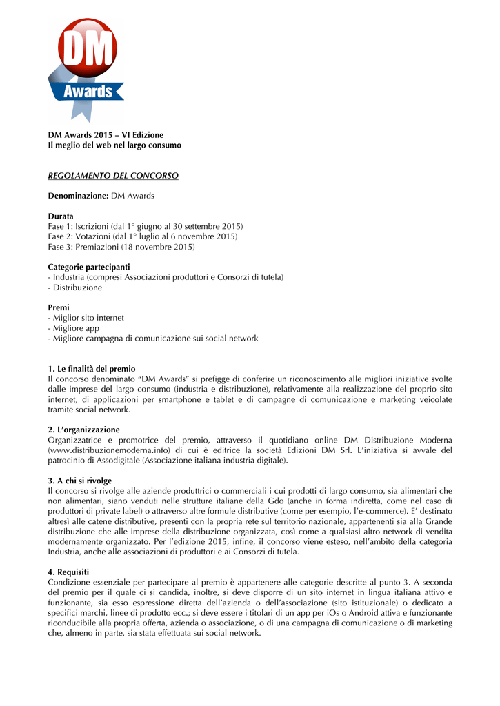 DM Awards 2015 – VI Edizione Il meglio del web nel largo consumo REGOLAMENTO DEL CONCORSO Denominazione: DM Awards Durata Fase 1: Iscrizioni (dal 1° giugno al 30 settembre 2015) Fase 2: Votazioni (dal 1° luglio al 6 novembre 2015) Fase 3: Premiazioni (18 novembre 2015) Categorie partecipanti - Industria (compresi Associazioni produttori e Consorzi di tutela) - Distribuzione Premi - Miglior sito internet - Migliore app - Migliore campagna di comunicazione sui social network 1. Le finalità del premio Il concorso denominato “DM Awards” si prefigge di conferire un riconoscimento alle migliori iniziative svolte dalle imprese del largo consumo (industria e distribuzione), relativamente alla realizzazione del proprio sito internet, di applicazioni per smartphone e tablet e di campagne di comunicazione e marketing veicolate tramite social network. 2. L’organizzazione Organizzatrice e promotrice del premio, attraverso il quotidiano online DM Distribuzione Moderna (www.distribuzionemoderna.info) di cui è editrice la società Edizioni DM Srl. L’iniziativa si avvale del patrocinio di Assodigitale (Associazione italiana industria digitale). 3. A chi si rivolge Il concorso si rivolge alle aziende produttrici o commerciali i cui prodotti di largo consumo, sia alimentari che non alimentari, siano venduti nelle strutture italiane della Gdo (anche in forma indiretta, come nel caso di produttori di private label) o attraverso altre formule distributive (come per esempio, l’e-commerce). E’ destinato altresì alle catene distributive, presenti con la propria rete sul territorio nazionale, appartenenti sia alla Grande distribuzione che alle imprese della distribuzione organizzata, così come a qualsiasi altro network di vendita modernamente organizzato. Per l’edizione 2015, infine, il concorso viene esteso, nell’ambito della categoria Industria, anche alle associazioni di produttori e ai Consorzi di tutela. 4. Requisiti Condizione essenziale per partecipare al premio è appartenere alle categorie descritte al punto 3. A seconda del premio per il quale ci si candida, inoltre, si deve disporre di un sito internet in lingua italiana attivo e funzionante, sia esso espressione diretta dell’azienda o dell’associazione (sito istituzionale) o dedicato a specifici marchi, linee di prodotto ecc.; si deve essere i titolari di un app per iOs o Android attiva e funzionante riconducibile alla propria offerta, azienda o associazione, o di una campagna di comunicazione o di marketing che, almeno in parte, sia stata effettuata sui social network. 5. Le modalità di partecipazione La partecipazione al concorso è libera e gratuita. E’ sufficiente compilare l’apposito modulo di iscrizione presente nell’apposita pagina dedicata ai DM Awards. Andranno indicati: nome dell’azienda o associazione, nominativo di un responsabile aziendale e relativo ruolo, indirizzo email, telefono e premio per il quale si intende partecipare (sito internet, app, campagna social network). Per la partecipazione al premio relativo al miglior sito internet si dovrà specificare il link di riferimento alla propria iniziativa. Nel caso del concorso al premio per la migliore app e la migliore campagna social network, laddove non sia disponibile il link alla relativa pagina web, si dovrà inviare all’indirizzo email indicato una scheda in pdf che riassuma, nell’ordine, le caratteristiche della campagna: nome, prodotto o azienda promossa, durata, social network utilizzati, eventuali risultati ottenuti, e che riporti fino a un massimo di 3 immagini rappresentative dell’app o della campagna. A iscrizione avvenuta, le aziende riceveranno una email di conferma. Successivamente, la società Edizioni DM Srl, promotrice del premio, verificherà le caratteristiche dei progetti partecipanti al concorso secondo le indicazioni fornite al punto 4. 6. Le fasi di svolgimento Il concorso si svolgerà in tre fasi. La prima, dal 1° giugno al 30 settembre 2015, riguarda le iscrizioni al premio da parte delle aziende partecipanti. La seconda, dal 1° luglio al 6 novembre 2015, prevede le votazioni online. La terza consisterà nella premiazione delle aziende vincitrici nell’ambito di un evento che si terrà a Milano, il 18 novembre. 7. Le tipologie dei premi I DM Awards conferiti saranno in tutto 9: - miglior sito, migliore app e migliore campagna su social network per la categoria industria - miglior sito, migliore app e migliore campagna su social network per la categoria distribuzione - miglior sito, migliore app e migliore campagna su social network assoluti Per le prime due categorie gli utenti potranno votare l’iniziativa preferita esprimendo con un click il proprio apprezzamento relativamente a caratteristiche che attengono al design, grafica e creatività, ai contenuti e/o al grado di interattività. I premi assoluti saranno attribuiti sulla base della insindacabile valutazione di una giuria di esperti. Non sarà possibile per un’azienda essere proclamata vincitrice contemporaneamente in più di un premio (con la sola esclusione dei premi assoluti). Qualora ciò dovesse verificarsi, sarà considerato solo il premio nel quale l’azienda ha totalizzato il maggior numero di preferenze (intese come sommatoria delle stesse nelle aree design, grafica e creatività; contenuti e grado di interattività). 8. Votazioni Le votazioni avverranno online e in modo anonimo (non sarà pertanto necessaria alcuna registrazione da parte dell’utente). Ogni utente potrà votare per uno o più progetti. 9. Giuria di esperti Al risultato delle votazioni dei lettori si aggiungerà il giudizio di una giuria di esperti, costituita da tre professionisti provenienti dal mondo della comunicazione, del web marketing e del largo consumo, oltre al direttore della testata Distribuzione Moderna. La valutazione della giuria stabilirà i tre premi assoluti: miglior sito, migliore app e migliore campagna social network, indipendentemente dalla categoria di ap