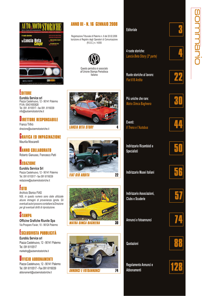 Editoriale 3 4 ruote storiche: Lancia Beta Story (2ª parte) 4 Registrazione Tribunale di Palermo n. 6 del 20.02.2006 Iscrizione al Registro degli Operatori di Comunicazione (R.O.C.) n. 14355 Questo periodico è associato all’Unione Stampa Periodioca Italiana Editore Euroblu Service srl Piazza Castelnuovo, 12 - 90141 Palermo P.IVA: 05431650828 Tel. 091. 6110517 - fax 091. 6116039 [email protected] Direttore Responsabile Franco Trifirò [email protected] lancia beta story 4 Ruote storiche al lavoro: Fiat 618 Ardita 22 Più uniche che rare: Matra Simca Bagheera 30 Eventi: Il Treno e l’Autobus 44 Indirizzario Ricambisti e Specialisti 50 Indirizzario Musei italiani 56 Indirizzario Associazioni, Clubs e Scuderie 57 Annunci e fotoannunci 74 Quotazioni 88 Grafica ed impaginazione Maurilia Moscarelli Hanno collaborato Roberto Gianusso, Francesco Patti Redazione Euroblu Service Srl Piazza Castelnuovo, 12 - 90141 Palermo Tel. 091 6110517 - fax 091 6116039 [email protected] fiat 618 Ardita 22 Foto Archivio Storico FIAS N.B.: in questo numero sono state utilizzate alcune immagini di provenienza ignota. Gli eventuali autori possono contattare la Direzione per gli eventuali diritti di riproduzione. Stampa Officine Grafiche Riunite Spa Via Prospero Favier, 10 - 90124 Palermo matra simca bagheera 30 Esclusivista Pubblicità Euroblu Service srl Piazza Castelnuovo, 12 - 90141 Palermo Tel. 091 6110517 [email protected] UFFICIO ABBONAMENTI Piazza Castelnuovo, 12 - 90141 Palermo Tel. 091 6110517 - Fax 091 6116039 [email protected] annunci e fotoannunci 74 Regolamento Annunci e Abbonamenti 128 sommario ANNO III - N. 16 gennaio 2008 editoriale il cuore e la ragione di Franco Trifirò Lei è sempre lì. E’ austera nella sua elegante mise demodé per la quale il tempo, i cui segni dell’inesorabile scorrere sono ben visibili sulla sua “pelle”, ha contribuito ad accentuare il fascino di anziana signora borghese. E proprio come tale lei si atteggia: è difatti assolutamente indifferente alle “giovani” iperplastificate che quotidianamente le si piazzano accanto o vanno e vengono freneticamente, su e giù lungo la strada dove lei dimora da anni. “Lei” è una Fiat 1500 C, dal colore grigio topo oramai sbiadito e reso opaco dal lungo tempo trascorso sotto il sole e la pioggia. L’ho “adocchiata” oramai da diversi anni, posteggiata lungo la strada che mi porta quotidianamente al posto di lavoro: mio padre ne aveva comprata una uguale nel 1965 ed a quella automobile, utilizzata per diversi anni dalla mia famiglia come “auto della domenica”, sono indelebilmente associati i più bei ricordi degli anni della mia fanciullezza. Ecco perché è diventata per me una inconscia abitudine, quando transito da quella via, ricercare con lo sguardo “la vecchia signora”, vedere se è ancora lì, se ha resistito ancora, se le manca qualcosa. Fino a qualche mese addietro era posteggiata sempre in posti diversi, lungo la “sua”strada: segno questo di una certa vitalità sua o del suo possessore. Da qualche tempo a questa parte non più così: lei è sempre lì, al solito posto. Ma non è affatto abbandonata: i vetri sono sempre ben puliti (la pezzuola gialla, vecchia almeno quanto lei, è sempre riposta in bella vista, ben ripiegata come si usava una volta, sopra il cruscotto) ed è munita di contrassegno assicurativo in corso di validità. Segni evidenti che il proprietario (o la proprietaria) continuano a prendersene cura amorevolmente, non cedendo alle facili lusinghe delle continue campagne di rottamazione. Non per quello che vale economicamente (certamente pochissimo) ma sicuramente per quello che ha rappresentato e rappresenta per loro (ed indirettamente anche per me). Con il cuore e non per la ragione della convenienza. 4 ruote storiche Lancia Beta Story 2ª parte: Beta Coupè, Spider, HPE di Francesco Patti 4 ruote storiche 4 ruote storiche Beta CoupÉ La «Beta Coupé» venne presentata al Salone di Francoforte del 1973. Il corpo vettura non aveva praticamente nulla in comune alla berlina da cui derivava. Più stretta di 4 centimetri, più corta di ben 29, più bassa di 12 e con il passo accorciato di 19, la «Coupé» possedeva un’impronta estetica del tutto individuale. Il frontale aveva una calandra verticale color argento a maglie alveolari che niente condivideva con la mascherina spiovente della berlina; i quattro fari tondi risultavano prospicienti anziché incassati. Vista di fianco, la «Beta Coupé» metteva in evidenza il prolungato volume anteriore che conteneva il propulsore. I deflettori alle porte erano un tocco caratteriale che sottolineava la sportività della «Coupé» rispetto alla «Beta» d’inizio genesi. Distintiva la forma trapezoidale dei finestrini anteriori. I vetri posteriori si aprivano con movimento a compasso in prossimità di una piccola griglia di estrazione aria. La fiancata era percorsa da due scalini che creavano una fascia in leggero rilievo estesa per l’intera lunghezza della vettura. La coda comprendeva due grandi fanali divisi orizzontalmente (arancione la metà superiore, rossa quella inferiore) affiancate da una sezione verticale chiara per le luci di retromarcia. Una cornice cromata era sul bordo del cofano bagagli. Sul paraurti anteriore in lamiera lucida erano applicate della fasce in gomma che s’interrompevano per l’alloggiamento della targa e per le aperture dei gruppi luce di posizione-indicatore di direzione. Al centro del paracolpi posteriore erano inserite le luci di targa. Anche all’interno non si riscontravano parentele con la berlina. I sedili, avvolgenti e ben profilati, avevano (sia davanti sia dietro) appoggiatesta sviluppati in altezza e di bizzarra sagoma. La loro esecuzione prevedeva tessuto per la zona centrale e delicato velluto sulle fasce di contenimento. La plancia era sontuosa ma gradevole oltre che razionalmente progettata. Veramente difficile poi trovare una dotazione di strumenti ricca come nella «Beta Coupé». Ol