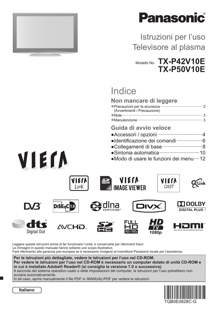 Istruzioni per l’uso Televisore al plasma Modello No. TX-P42V10E TX-P50V10E Indice Non mancare di leggere ●Precauzioni per la sicurezza ········································· 2 (Avvertimenti / Precauzione) ●Note ··············································································· 3 ●Manutenzione ································································ 3 Guida di avvio veloce ●Accessori / opzioni ·······························4 ●Identificazione dei comandi ··················6 ●Collegamenti di base ····························8 ●Sintonia automatica ····························10 ●Modo di usare le funzioni dei menu····12 Leggere queste istruzioni prima di far funzionare l’unità, e conservarle per riferimenti futuri. Le immagini in questo manuale hanno soltanto uno scopo illustrativo. Fare riferimento alla garanzia pan-europea se è necessario rivolgersi al rivenditore Panasonic locale per l’assistenza. Per le istruzioni più dettagliate, vedere le istruzioni per l’uso nel CD-ROM. Per vedere le istruzioni per l’uso nel CD-ROM è necessario un computer dotato di unità CD-ROM e in cui è installato Adobe® Reader® (si consiglia la versione 7.0 o successiva). A seconda del sistema operativo usato o delle impostazioni del computer, le istruzioni per l’uso potrebbero non avviarsi automaticamente. In tal caso, aprire manualmente il file PDF in \MANUAL\PDF per vedere le istruzioni. Italiano TQB0E0828C-G Precauzioni per la sicurezza Avvertimenti Maneggiamento della spina e del cavo di alimentazione ●Inserire completamente la spina nella presa di corrente. (Se la spina è allentata, potrebbe generare calore e causare un incendio.) ●Assicuratevi che ci sia un accesso facile alla spina del cavo di alimentazione. ●Assicurarsi che la punta di messa a terra della spina del cavo di alimentazione sia saldamente collegata, per evitare scosse elettriche. ●Un componente con costruzione di CLASS I deve essere collegato a una presa di corrente di rete con connessione di messa a terra di protezione. ●Non toccare la spina del cavo di alimentazione con le mani bagnate. (C’è pericolo di scosse elettriche.) ●Non si devono usare cavi di alimentazione diversi da quello in dotazione a questo televisore. (Potrebbero causare pericoli d’incendio o di scosse elettriche.) ●Non danneggiare il cavo di alimentazione. (Il cavo di alimentazione danneggiato potrebbe causare un incendio o scosse elettriche.) ●Non spostare il televisore con il cavo di alimentazione collegato alla presa di corrente. ●Non mettere oggetti pesanti sul cavo di alimentazione, o mettere il cavo vicino ad un oggetto molto caldo. ●Non torcere il cavo di alimentazione e non piegarlo o tenderlo eccessivamente. ●Non staccare il cavo di alimentazione tirandolo. Per staccare il cavo di alimentazione dalla presa di corrente, prenderlo per la spina. ●Non usare il cavo di alimentazione con la spina danneggiata, o una presa di corrente danneggiata. Se si nota una qualsiasi anormalità, staccare immediatamente la spina del cavo di alimentazione dalla presa di corrente! Alimentazione ●Questo televisore è progettato per funzionare con una tensione CA di 220-240 V, a 50 / 60 Hz. Non rimuovere i coperchi Non si deve MAI modifi care l’unità (Le componenti ad alta tensione potrebbero causare pericolose scosse elettriche.) ●Non rimuovere il coperchio posteriore del televisore per evitare l’eventuale contatto con i componenti sotto tensione. All’interno del televisore non si trovano i componenti riparabili dall’utente. ●Far controllare, regolare o riparare l’unità dal rivenditore Panasonic locale. Non esporre alla pioggia oppure all’umidità eccessiva ●Non esporre il televisore alla pioggia oppure all’umidità eccessiva per evitare il danneggiamento che potrebbe causare una folgorazione oppure un incendio. Non posare sull’apparecchio i recipienti con l’acqua, come per esempio i vasi e non esporre la TV all’acqua gocciolante né all’acqua corrente. Non esporre alla luce diretta del sole e altre fonti di calore ●Evitare di esporre il televisore alla luce solare diretta 2 o ad altre fonti di calore. Per prevenire ogni rischio di incendio, evitare di collocare candele o fiamme libere sopra o nei pressi dell’apparecchio TV. C.a. 220-240 V, 50 / 60 Hz Non introdurre oggetti estranei nell’unità ●Non permettere ad alcun oggetto di cadere nei fori di ventilazione del televisore (potrebbero causare incendi o scosse elettriche). Il televisore non deve essere posto su superfici inclinate o instabili ●Il televisore potrebbe cadere o rovesciarsi. Utilizzare soltanto i piedistalli o le attrezzature di montaggio dedicati ●L’utilizzo di un tavolino o di altri mezzi di fissaggio non omologati può rendere il televisore instabile col rischio di infortuni. Chiudere al rivenditore Panasonic locale di eseguire l’installazione. ●Utilizzare tavolini / porta-TV omologati (pag. 4). Non permettere ai bambini di maneggiare le schede SD ●Come con i piccoli oggetti, le schede SD potrebbero essere ingoiate dai bambini piccoli. Rimuoverle immediatamente dopo l’uso. Precauzioni ■Prima di pulire il televisore, staccare la spina del cavo di alimentazione dalla presa di corrente ●La pulizia dell’unità sotto tensione potrebbe causare scosse elettriche. ■Se il televisore non sarà utilizzato per un periodo prolungato, rimuovere il cavo di alimentazione ●Questo televisore continua a consumare della corrente anche giornali, tovaglie, tende, ecc. può provocare surriscaldamento, incendi o scosse elettriche. ■Il volume eccessivo delle cuffie ■Il televisore è pesante. Esso ●Il