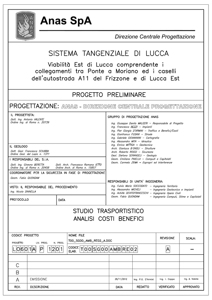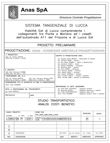 Sistema Tangenziale di Lucca Progetto Preliminare INDICE 1 PREMESSA ................................................................................................................. 2 2 COSTI DI REALIZZAZIONE E COSTI DI GESTIONE ....................................................... 4 3 BENEFICI TRASPORTISTICI ........................................................................................ 6 4 VARIAZIONE DELLA SICUREZZA .................................................................................. 8 5 BENEFICI AMBIENTALI -VARIAZIONE INQUINAMENTO ATMOSFERICO ....................... 11 6 ANALISI DI FATTIBILITÀ ECONOMICA....................................................................... 15 Analisi Costi Benefici ANAS S.p.A. Direzione Centrale Progettazione – Servizio Pianificazione Trasportistica 1 Sistema Tangenziale di Lucca Progetto Preliminare 1 PREMESSA L’analisi costi-benefici (ACB) è lo strumento più frequentemente utilizzato nella valutazione di progetti di interesse collettivo e si configura come uno strumento di supporto per il policy maker in un’ottica di ottimizzazione dell’allocazione delle risorse. Nella valutazione degli effetti economici dell’investimento, l’ACB considera solamente gli aspetti differenziali ed incrementali dello stesso. L’analisi è dunque sviluppata sulla differenza tra benefici e costi incrementali del progetto ("con intervento”) e benefici e costi incrementali che si potrebbero altrimenti manifestare in assenza di intervento ("senza intervento”). Essendo l’analisi costi-benefici uno strumento di valutazione della fattibilità di un investimento dal punto di vista della collettività, occorre considerare unicamente il costo effettivo per lo Stato. I valori utilizzati sono quindi “economici” (costo effettivo per lo Stato al netto delle tasse e dei trasferimenti allo stesso sotto altra forma) e non “finanziari” (spesa sostenuta per la realizzazione e gestione dell’intervento). La trasformazione dei costi da finanziari in economici avviene mediante l’applicazione di opportuni fattori di conversione. L’analisi attribuisce all’infrastruttura di progetto una vita utile di 30 anni e considera un valore residuo nullo delle opere al termine della vita utile. Inquadrata nei termini suddetti la Verifica di Fattibilità Economica dell’intervento progettuale del Sistema Tangenziale di Lucca è svolta secondo la procedura standard propria dell’Analisi Costi/Benefici, il cui sviluppo operativo è descritto nei capitoli seguenti che analizzano e riportano le singole voci che compongono l’analisi. Il Capitolo finale fornisce i risultati della Costi Benefici. La tabella seguente evidenzia, ai vari orizzonti temporali, la variazione giornaliera degli indicatori trasportistici di rete (tra scenario di progetto e di riferimento) alla base di tutte le analisi di sostenibilità economica. Si evidenzia che non sono state fatte, cautelativamente, ipotesi di crescita dopo il 2038, per cui la variazione degli indicatori resta costante. Analisi Costi Benefici ANAS S.p.A. Direzione Centrale Progettazione – Servizio Pianificazione Trasportistica 2 Sistema Tangenziale di Lucca Progetto Preliminare Confronto indicatori di rete Scenario di Progetto / Scenario di Riferimento – DATI GIORNALIERI Anno Anno Anno Anno 2018 2028 2038 2048 Domanda passeggeri (Veicoli Leggeri) Variazione Variazione Veicoli*Km Veicoli*h 23.892 -3.210 22.704 -4.632 25.580 -5.219 25.580 -5.219 Domanda merci (Veicoli Pesanti) Variazione Variazione Veicoli*Km Veicoli*h 3.564 -240 3.744 -294 4.345 -341 4.345 -341 Tabella 1.1- Variazione degli indicatori di rete – Dati giornalieri Analisi Costi Benefici ANAS S.p.A. Direzione Centrale Progettazione – Servizio Pianificazione Trasportistica 3 Sistema Tangenziale di Lucca Progetto Preliminare 2 COSTI DI REALIZZAZIONE E COSTI DI GESTIONE Per lo scenario progettuale, di estesa complessiva pari a circa 30+000 Km, sono stati ipotizzati due anni di ulteriore progettazione e tre anni di costruzione, con entrata in esercizio dell’asse di progetto al 2018. I costi di costruzione, derivanti dal quadro economico relativo, sono ripartiti nei quattro anni antecedenti il 2018; i valori totali annui ottenuti sono riportati nel prospetto seguente. La trasformazione dei costi da finanziari in economici ha utilizzato un fattore medio di conversione pari a 0,82. Il fattore medio è ottenuto considerando le usuali categorie di importo lavori: materiali, manodopera, trasporti e noli, ciascuno con il proprio tasso di conversione da valore finanziario ad economico. Il tasso di conversione medio e’ ottenuto come media pesata tra i singoli tassi di conversione delle voci di spesa e la percentuale di spesa a queste voci imputata. Ai fini dell’Analisi da tali costi è stata scomputata, in quanto trasferimento interno alla collettività, l’IVA, facendo riferimento ad un costo di investimento di € 269.559.487 come da Quadro Economico allegato e “spalmando” tale valore su tre anni nel periodo 2015 – 2017. COSTI DI INVESTIMENTO Finanziario € 2015 80.867.846 2016 107.823.795 2017 80.867.846 Coeff. Trasf. Economico € 66.311.634 0,74 269.559.487 88.415.512 66.311.634 221.038.78 0 Tabella 2.1– Costi Finanziari ed Economici Per quanto riguarda i costi di Gestione (esercizio e manutenzione) sono stati utilizzati i valori annui delle spese previste su base parametrica di derivazione ANAS e pari a 30.000,00 €/km all’anno (Strada Extraurbana Secondaria di tipo C1/C2). Considerando l’estesa complessiva dell’infrastruttura ne è derivato un costo di manutenzione annuo di 900.000,00 €/anno dei quali 738.000,00 €/anno di costi economici. Analisi Costi Benefici ANAS S.p.A. Direzione Centrale Progettazione – Servizio Pianificazione Trasportistica 4 Sistema Tangenziale di Lucca Progetto Preliminare Figura 2.1 Quadro Economico di Progetto Analisi Costi Benefici ANAS S.p.A. Direzione Centrale Progettazione – Servizi