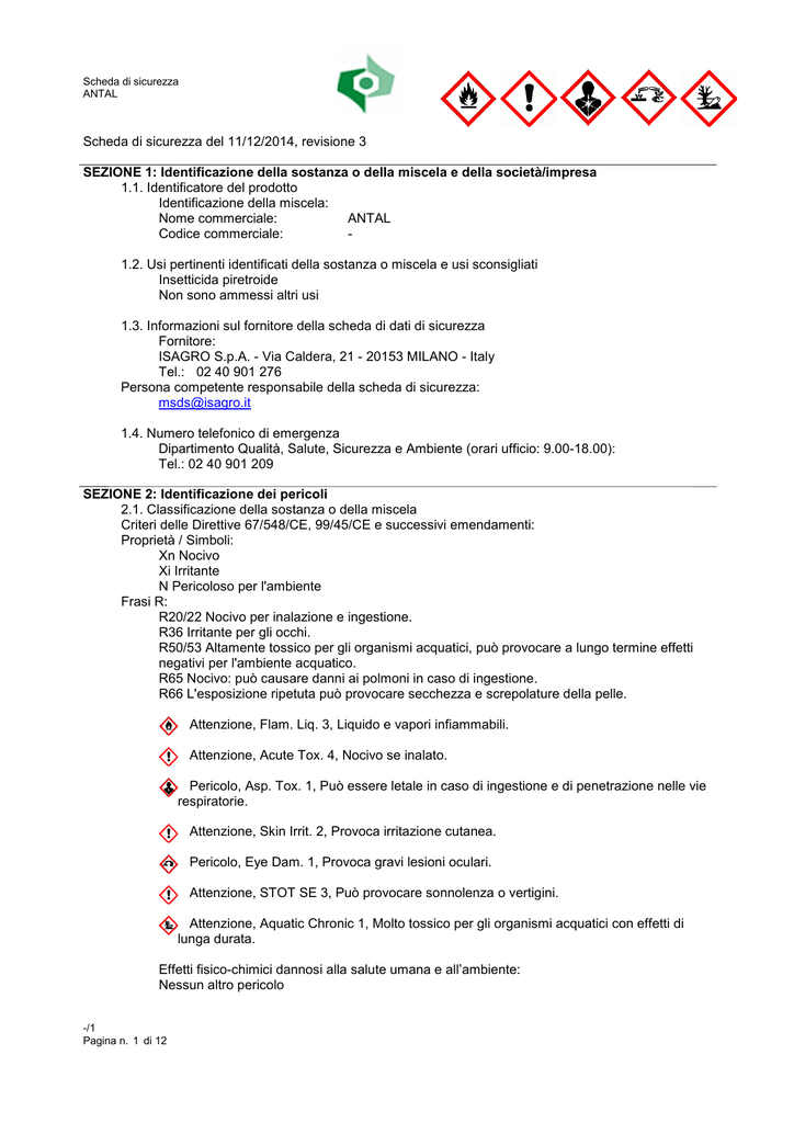 Scheda di sicurezza ANTAL Scheda di sicurezza del 11/12/2014, revisione 3 SEZIONE 1: Identificazione della sostanza o della miscela e della società/impresa 1.1. Identificatore del prodotto Identificazione della miscela: Nome commerciale: ANTAL Codice commerciale: 1.2. Usi pertinenti identificati della sostanza o miscela e usi sconsigliati Insetticida piretroide Non sono ammessi altri usi 1.3. Informazioni sul fornitore della scheda di dati di sicurezza Fornitore: ISAGRO S.p.A. - Via Caldera, 21 - 20153 MILANO - Italy Tel.: 02 40 901 276 Persona competente responsabile della scheda di sicurezza: [email protected] 1.4. Numero telefonico di emergenza Dipartimento Qualità, Salute, Sicurezza e Ambiente (orari ufficio: 9.00-18.00): Tel.: 02 40 901 209 SEZIONE 2: Identificazione dei pericoli 2.1. Classificazione della sostanza o della miscela Criteri delle Direttive 67/548/CE, 99/45/CE e successivi emendamenti: Proprietà / Simboli: Xn Nocivo Xi Irritante N Pericoloso per l'ambiente Frasi R: R20/22 Nocivo per inalazione e ingestione. R36 Irritante per gli occhi. R50/53 Altamente tossico per gli organismi acquatici, può provocare a lungo termine effetti negativi per l'ambiente acquatico. R65 Nocivo: può causare danni ai polmoni in caso di ingestione. R66 L'esposizione ripetuta può provocare secchezza e screpolature della pelle. Attenzione, Flam. Liq. 3, Liquido e vapori infiammabili. Attenzione, Acute Tox. 4, Nocivo se inalato. Pericolo, Asp. Tox. 1, Può essere letale in caso di ingestione e di penetrazione nelle vie respiratorie. Attenzione, Skin Irrit. 2, Provoca irritazione cutanea. Pericolo, Eye Dam. 1, Provoca gravi lesioni oculari. Attenzione, STOT SE 3, Può provocare sonnolenza o vertigini. Attenzione, Aquatic Chronic 1, Molto tossico per gli organismi acquatici con effetti di lunga durata. Effetti fisico-chimici dannosi alla salute umana e all’ambiente: Nessun altro pericolo -/1 Pagina n. 1 di 12 Scheda di sicurezza ANTAL 2.2. Elementi dell’etichetta Simboli: Pericolo Indicazioni di Pericolo: H226 Liquido e vapori infiammabili. H302 Nocivo se ingerito. H304 Può essere letale in caso di ingestione e di penetrazione nelle vie respiratorie. H315 Provoca irritazione cutanea. H318 Provoca gravi lesioni oculari. H336 Può provocare sonnolenza o vertigini. H410 Molto tossico per gli organismi acquatici con effetti di lunga durata. Consigli Di Prudenza: P102 Tenere fuori dalla portata dei bambini. P210 Tenere lontano da fonti di calore/scintille/fiamme libere/superfici riscaldate. — Non fumare. P261 Evitare di respirare la polvere/i fumi/i gas/la nebbia/i vapori/gli aerosol. P264 Lavare accuratamente le mani dopo l’uso. P270 Non mangiare, né bere, né fumare durante l’uso. P273 Non disperdere nell’ambiente. P280 Indossare guanti/indumenti protettivi/Proteggere gli occhi/il viso. P391 Raccogliere il materiale fuoriuscito. P405 Conservare sotto chiave. P501 Smaltire il prodotto/recipiente in conformità alla normativa vigente Disposizioni speciali: EUH401 Per evitare rischi per la salute umana e per l'ambiente, seguire le istruzioni per l'uso. Attenzione: Per evitare rischi per l’uomo e l’ambiente seguire le istruzioni per l’uso (etichetta e Scheda di Sicurezza) Operare in asenza di vento Il contenitore completamente svuotato non deve essere disperso nell’ambiente Il contenitore non può essere riutilizzato Prescrizioni supplementari: Non contaminare l’acqua con il prodotto o il suo contenitore Non pulire il materiale d’applicazione in prossimità delle acque di superficie evitare la contaminazione attraverso i sistemi di scolo delle acque delle aziende agricole e delle strade. Pericoloso per le api. Al fine di proteggere le api e altri insetti impollinatori, non utilizzare il prodotto durante la fioritura o durante la fioritura di piante infestanti. Tenere lontano e/o distruggere le erbacce prima del periodo di fioritura. Non utilizzare il prodotto durante il periodo di impollinazione delle api. Dopo l’applicazione, le api devono rimanere nel loro alveare per almeno 1 giorno, con sufficiente cibo e acqua o andare via, ma non meno di 3 km di distanza. Non rientrare nei campi trattati prima che il trattamento sia completamente asciutto Nel caso in cui un lavoratore entri nel campo poco dopo l’irrorazione devono essere indossati indumenti protettivi e guanti adatti. Protezione degli organismi acquatici -/1 Pagina n. 2 di 12 Scheda di sicurezza ANTAL Per proteggere gli organismi acquatici, rispettare una fascia di sicurezza non trattata delle acque superficiali come da indicazione in etichetta 2.3. Altri pericoli Sostanze vPvB e/o PBT nella miscela: nessuna. Altri pericoli: Nessun altro pericolo SEZIONE 3: Composizione/informazioni sugli ingredienti 3.1. Sostanze Non applicabile 3.2. Miscele Componenti pericolosi ai sensi della Direttiva CEE 67/548 e del Regolamento CLP e relativa classificazione: 80% - 90% Nafta solvente, aromatica pesante CAS: 64742-94-5 Xn,N; R51/53-65-66-67 3.10/1 Asp. Tox. 1 H304 3.8/3 STOT SE 3 H336 4.1/C2 Aquatic Chronic 2 H411 3% - 5% Dodecilbenzensolfonato di calcio CAS: 26264-06-2, EC: 247-557-8 Xi; R38-41 3.2/2 Skin Irrit. 2 H315 3.3/1 Eye Dam. 1 H318 3% - 5% alchilammina etossilata neutralizzata CAS: 66467-20-7 Xn,Xi,N; R22-38-41-51/53 3.1/4/Oral Acute Tox. 4 H302 3.2/2 Skin Irrit. 2 H315 3.3/1 Eye Dam. 1 H318 4.1/C2 Aquatic Chronic 2 H411 1% - 3% deltametrina (ISO) Numero Index: 607-319-00-X, CAS: 52918-63-5, EC: 258-256-6 T,N; R23/25-50/53 4.1/A1 Aquatic Acute 1 H400 4.1/C1 Aquatic Chronic 1 H410 3.1/3/Oral Acute Tox. 3 H301 3.1/3/Inhal Acute Tox. 3 H331 -/1 Pagina n. 3 di 12 Scheda di sicurezza ANTAL 1% - 3% 2-etilesan-1-olo Numero Index: 203-234-3, CAS: 104-76-7, EC: 203-234-3 Xi; R38-41 3.2/2 Skin Irrit. 2 H315 3.3/1 Eye Dam. 1 H318 0.5% - 1% 4-fenilbut-1-ene Numero Index: 601-051-00-7, CAS: 768-56-9, EC: 405-980-7 Xi,N; R38-51/53 3.2/2 Skin Irrit. 2 H315 4.1/C2 Aquatic Chronic 2 H411 0.5% - 1% 2-metilpropan-1-olo Numero Index: 60