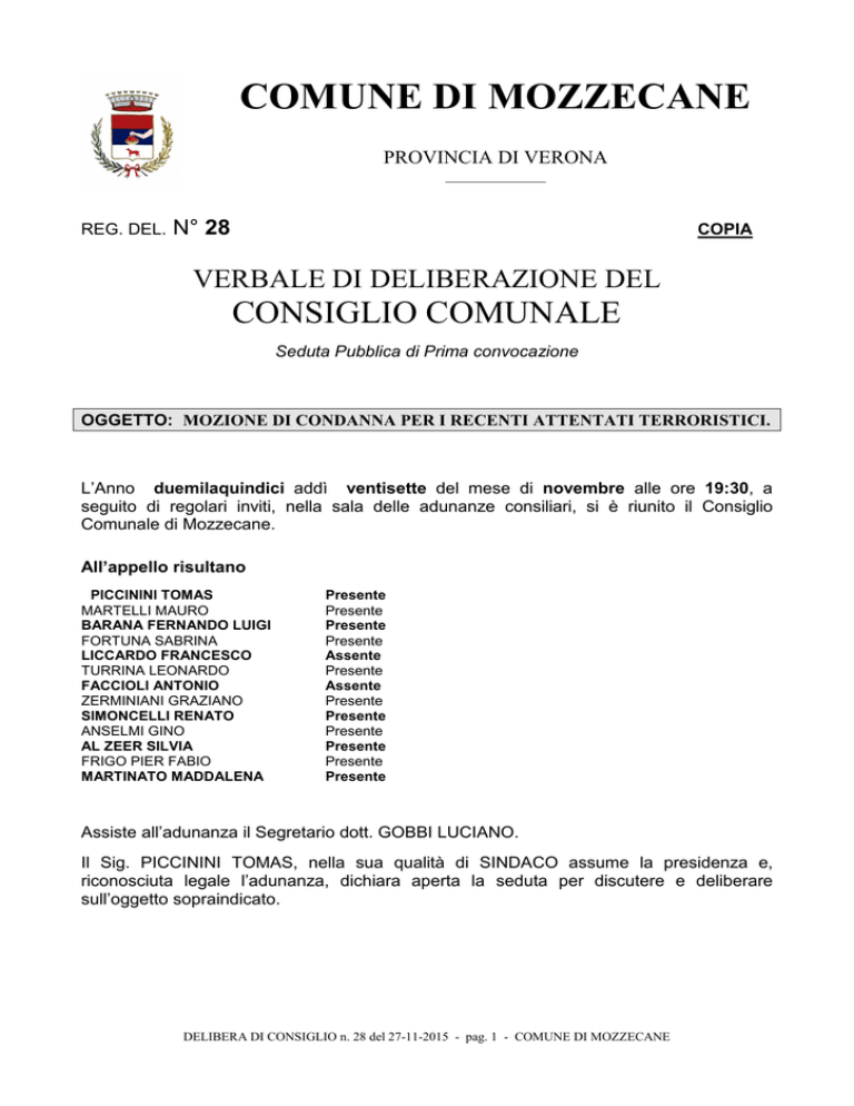 COMUNE DI MOZZECANE PROVINCIA DI VERONA ______________ REG. DEL. N° 28 COPIA VERBALE DI DELIBERAZIONE DEL CONSIGLIO COMUNALE Seduta Pubblica di Prima convocazione OGGETTO: MOZIONE DI CONDANNA PER I RECENTI ATTENTATI TERRORISTICI. L’Anno duemilaquindici addì ventisette del mese di novembre alle ore 19:30, a seguito di regolari inviti, nella sala delle adunanze consiliari, si è riunito il Consiglio Comunale di Mozzecane. All’appello risultano PICCININI TOMAS MARTELLI MAURO BARANA FERNANDO LUIGI FORTUNA SABRINA LICCARDO FRANCESCO TURRINA LEONARDO FACCIOLI ANTONIO ZERMINIANI GRAZIANO SIMONCELLI RENATO ANSELMI GINO AL ZEER SILVIA FRIGO PIER FABIO MARTINATO MADDALENA Presente Presente Presente Presente Assente Presente Assente Presente Presente Presente Presente Presente Presente Assiste all’adunanza il Segretario dott. GOBBI LUCIANO. Il Sig. PICCININI TOMAS, nella sua qualità di SINDACO assume la presidenza e, riconosciuta legale l’adunanza, dichiara aperta la seduta per discutere e deliberare sull’oggetto sopraindicato. DELIBERA DI CONSIGLIO n. 28 del 27-11-2015 - pag. 1 - COMUNE DI MOZZECANE Il Sindaco propone l’adozione della sottoriportata mozione: MOZIONE DI CONDANNA PER I RECENTI ATTENTATI TERRORISTICI Nella notte di venerdi 13 novembre scorso a Parigi ci sono stati sanguinosi e crudeli attentati terroristici che hanno provocato la morte e il ferimento di centinaia di persone. Le recenti notizie di cronaca evidenziano un preoccupante aumento in tutti i Paesi coinvolti da violenze e intimidazione a danno delle persone e delle libertà fondamentali e irrinunciabili su cui fonda la nostra società. Questi atti di terrorismo e di violenza contrastano con lo spirito della nostra Costituzione Italiana in particolare con l’art. 2 che recita: la Repubblica riconosce e garantisce i diritti inviolabili dell'uomo, sia come singolo sia nelle formazioni sociali ove si svolge la sua personalità, e richiede l'adempimento dei doveri inderogabili di solidarietà politica, economica e sociale, e l’art. 3 con il quale si afferma che: tutti i cittadini hanno pari dignità sociale e sono eguali davanti alla legge, senza distinzione di sesso, di razza, di lingua, di religione, di opinioni politiche, di condizioni personali e sociali. La stessa Costituzione non si limita a riconoscere i diritti degli individui, ma impegna le istituzioni ad adoperarsi per combattere violenze, disuguaglianze ed ingiustizie per garantire l’effettivo esercizio dei diritti di libertà contro chiunque cerchi di limitarli o impedirli. Inoltre il nostro Comune attraverso il proprio Statuto ispira la propria azione al principio di solidarietà e del bene comune e riconosce la pace quale diritto fondamentale di tutti gli uomini, promuove la diffusione della cultura di pace e della solidarietà tra i popoli con iniziative di informazione, con il sostegno economico, favorendo l’accoglienza di cittadini di ogni nazionalità, nel rispetto e nella valorizzazione delle differenze. L’educazione al rispetto della diversità di opinione, di religione, di diritto alla critica è fondamentale per l’intera comunità internazionale per la convivenza tra individui di diversi Paesi come arricchimento e crescita dei valori per il rispetto reciproco. Il bersaglio di tale attacco è stato alla libertà e alla democrazia. Non tanto la democrazia delle istituzioni ma la democrazia dei diritti che si traduce nel nostro vivere quotidiano PER QUESTE RAGIONI INVITANO IL CONSIGLIO COMUNALE - - ad esprimere vicinanza e solidarietà a nome di tutti i cittadini di Mozzecane ai cittadini di Parigi ed ai famigliari delle vittime; ad esprimere cordoglio ai famigliari di Valeria Solesin, giovane donna italiana ambasciatrice con il suo esempio dei valori di solidarietà e di pace tra i popoli; sostenere le azioni dei Governi dirette alla tutela e sicurezza che, mantenendo inalterate le libertà fondamentali primarie dei cittadini dell’Unione Europea, consentano che tali episodi non si possano più verificare; condannare qualsiasi forma di violenza; DELIBERA DI CONSIGLIO n. 28 del 27-11-2015 - pag. 2 - COMUNE DI MOZZECANE - - esprimere la volontà di una maggiore vigilanza da parte delle istituzioni italiane affinchè tutelino maggiormente i cittadini da possibili infiltrazioni terroristiche anche nel nostro territorio; a credere nella libertà esortando l’Islam moderato e civile a prendere le distanze dal totalitarismo fanatico che usa la religione ai fini criminali di potenza. DELIBERA DI CONSIGLIO n. 28 del 27-11-2015 - pag. 3 - COMUNE DI MOZZECANE Il Sindaco dichiara aperta la seduta. Designa quali scrutatori i consiglieri Zerminiani e Turrina per la maggioranza e Martinato per la minoranza. Il Sindaco chiede un minuto di silenzio per Valeria Solesin, vittima degli attentati terroristici di Parigi del 13 novembre. Dopo il minuto di silenzio, il Sindaco invita l’assessore Santoro a leggere la mozione (allegato A quale parte integrante e sostanziale del presente atto). Aperta discussione, interviene il consigliere Martinato che chiede di integrare la mozione in alcuni punti, e precisamente: aggiungere al primo paragrafo la solidarietà a tutte le vittime del terrorismo; assumere l’impegno da parte del Comune con i propri mezzi a lavorare su una vera integrazione dei cittadini adottando un atteggiamento di apertura all’altro; sensibilizzare amministrazione e cittadini ad un maggior controllo degli ingressi di clandestini e irregolari nel nostro Paese, accertando la regolarità dei soggiorni. Chiede quindi di integrare in tal senso la mozione. Interviene il Sindaco precisando che la conferenza dei capigruppo di lunedì scorso è stata convocata allo scopo di fare una mozione condivisa, trovando, ora, difficile recepire gli emendamenti proposti. Il Segretario Comunale precisa che l’emendamento deve essere puntuale e preciso, in quanto va a modificare un testo preesistente, va votato separatamente e poi unitamente al testo della p