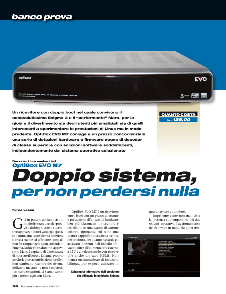banco prova Un ricevitore con doppio boot nel quale convivono il conosciutissimo Enigma 2 e il “performante” Mara, per la gioia e il divertimento sia degli utenti più smaliziati sia di quelli QUANTO COSTA Euro 129,00 interessati a sperimentare le prestazioni di Linux ma in modo prudente. OptiBox EVO M7 coniuga a un prezzo concorrenziale una serie di dotazioni hardware e firmware degne di decoder di classe superiore con soluzioni software soddisfacenti, indipendentemente dal sistema operativo selezionato Decoder Linux-embedded OptiBox EVO M7 Doppio sistema, per non perdersi nulla Fulvio Lesca G ià in passato abbiamo avuto modo di testare decoder provvisti di doppio sistema operativo apprezzandone i vantaggi, specie se l’immagine considerata inferiore si rivela stabile ed efficiente tanto da non far rimpiangere il più collaudato Enigma. Molte volte, durante la prova sotto Mara, è capitato di dimenticare di riportate il boot su Enigma, proprio perché le prestazioni del ricevitore Evo non sembrano risentire del sistema utilizzato ma anzi - e non è un’eresia - in certe situazioni, ci siamo sentiti più a nostro agio con Mara. 38 Eurosat - dicembre 2013/251 OptiBox Evo M7 è un ricevitore entry-level con un prezzo allettante e prestazioni all’altezza di hardware ben più blasonati: il ricevitore è distribuito in una scatola di cartone colorato riportante, sul retro, una pratica e approfondita scheda tecnica del prodotto. Per quanto riguarda gli accessori presenti nell’imballo troviamo oltre all’alimentatore esterno a 12V e al telecomando con relative pile anche un cavo HDMI. Non manca un manualetto di istruzioni bilingue, pur se poco utilizzato in Schermata informativa dell’emulatore più utilizzato in ambiente Enigma questo genere di prodotti. Impellente come non mai, vista la presenza contemporanea dei due sistemi operativi, l’aggiornamento del firmware in modo da poter usu- DA SEGNALARE LE NOSTRE IMPRESSIONI PER INFORMAZIONI 4 Doppio boot 4 Stabilità 4 Potenzialità del firmware Mara 4 Funzioni multimediali 4 Prezzo 3 Sporadici blocchi sul portale (Mara) Un ricevitore davvero divertente, e quando il divertimento diventa prevalente nel giudizio, significa che tutto il resto delle prove sono state brillantemente superate. Buona qualità dell’hardware, architettura di sistema stabile e ampiamente testata anche in altri produttori, doppio firmware con ambienti assolutamente separati affinché un problema su un SO non infici il funzionamento dell’altra partizione. L’apparecchio si è dimostrato veloce e preciso in tutte le funzioni indipendentemente dal sistema utilizzato, un prodotto che unisce la potenza di Enigma2 alla semplicità di Mara immagine che, escludendo la gestione settings, non fa rimpiangere Enigma. Un piccolo capolavoro specialmente se visto dal lato economico: 129 euro non sono molti se rapportati alle prestazioni offerte e alla flessibilità espresse. Doppio boot, quindi doppia modalità di funzionamento, ma univocità di giudizio finale: OptiBox Evo M7 è un ricevitore che nella sua categoria d’appartenenza, potrà ritagliarsi uno spazio molto importante tra i ricevitori Linux-based. www.plugandplay.it/ Dati apparecchio in prova Firmware: OpenPli 3.0 + Mara 04.19.1813 fruire delle ultime versioni di Enigma e Mara. Il doppio boot è realizzato, al pari di altri ricevitori, via hardware. La memoria contenente le immagini caricate sono separate: questa scelta progettuale, contrapposta all’emulazione software del boot realizzata in Enigma con alcuni plugin, offre una completa indipendenza ai due ambienti, peculiarità indispensabile per poter liberamente sperimentare senza il timore di blocchi. Dopo aver aggiornato i sistemi (vedi box Dual Boot e aggiornamento firmware), abbiamo proceduto come se stessimo testando due ricevitori distinti, proprio per evidenziare i punti deboli e i fiori all’occhiello dei due sistemi operativi presenti. Enigma, ambiente rassicurante La scelta delle immagini per il ricevitore in prova è piuttosto ampia perché basata sul progetto Open: OpenPli, Open ATV, Open SIF, Open HDF e Persian Empire sono solo alcune delle immagini disponibili, tra queste la nostra scelta è caduta su OpenPli, esclusivamente perché dovrebbe rappresentare la base comune, ossia l’immagine da cui sono derivate le altre. Come consuetudine per tutte le immagini Enigma-based, dopo il caricamento possiamo scegliere se usufruire del wizard, cioè la procedura guidata, oppure procedere manualmente: il risultato finale è lo stesso e comporta l’impostazione dei parametri di base necessari per il buon funzionamento del ricevitore. La scelta dell’uno o dell’altro metodo Nonostante le piccole dimensioni del ricevitore, l’interno è sostanzialmente vuoto a conferma dell’ottimo livello di miniaturizzazione raggiunto dalle motherboard sui ricevitori digitali. La parte destra, occupata dalla scheda di alimentazione, è lasciata libera grazie all’utilizzo di un alimentatore esterno e presenta sulla parte posteriore la SCART, derivata da un connettore saldato sulla scheda madre. Ottima costruzione ed eccellente cablaggio, segno di un progetto ormai maturo Eurosat - dicembre 2013/251 39 banco prova Decoder Linux-embedded OptiBox EVO M7 Il frontale del ricevitore è completamente occupato da uno sportellino ad apertura verticale che dona un ottimo impatto estetico nascondendo i comandi manuali. A sportellino aperto troviamo, dalla sinistra, il tasto di Stand-by, due tasti volume e altri due per la navigazione tra i canali, indispensabili nelle operazioni di boot e di aggiornamento del firmware. Al centro del frontale un piccolo display a 7 segmenti, una USB di comodo accesso e lo smart card reader programmabile. Lo sportellino sia apre e chiude con una leggera pressione ed è tenuto chiuso grazie a un aggancio molto preciso che lo mantiene perfettamente in posizione operativo dipende dall’esperienza dell’utente. Se siete alle prime armi las