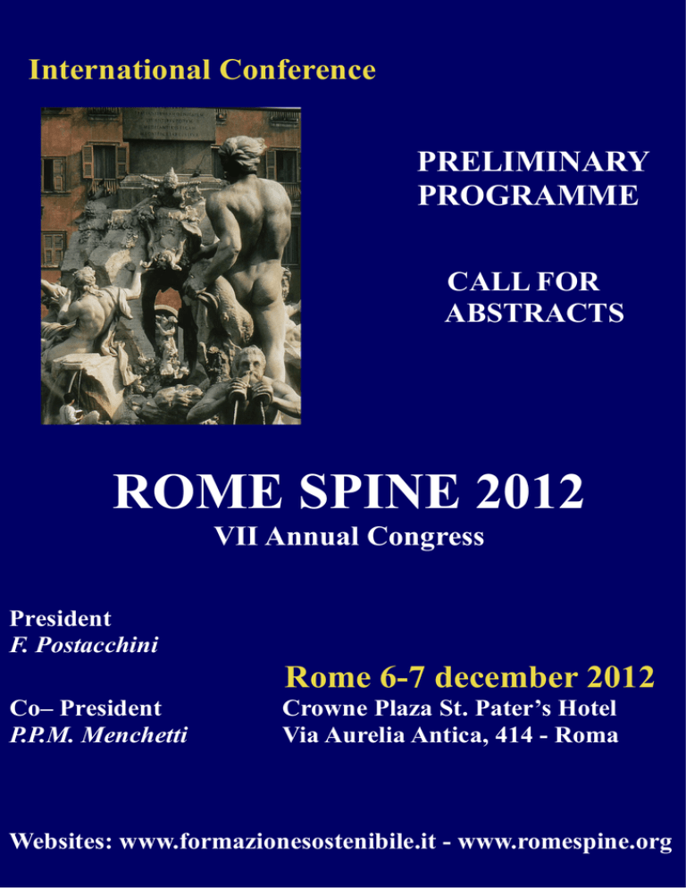 International Conference PRELIMINARY PROGRAMME CALL FOR ABSTRACTS ROME SPINE 2012 VII Annual Congress President F. Postacchini Rome 6-7 december 2012 Co– President P.P.M. Menchetti Crowne Plaza St. Pater’s Hotel Via Aurelia Antica, 414 - Roma Websites: www.formazionesostenibile.it - www.romespine.org 6 DECEMBER 8.15 INSTRUCTIONAL COURSE LECTURE 9.10-9.20 Management of scoliosis in the adult D. Fabris Monterumici (Padova) Discussion CERVICAL DISC HERNIATION AND FORAMINAL STENOSIS 9.20 9.30 9.40 9.50- 10.05 10.05 10.15 10.25 10.35-10.50 DISC HERNIATION Clinical features and diagnosis G. Gargiulo (Torino) Conservative treatments J-YMaigne (Paris, France) Nucleoplasty: indications, results and limitations A. Cesaroni ( Roma) Discussion Discectomy without arthrodesis R. Bartels (Nijmegen, Netherland) Discectomy and fusion with autologous bone: obsolete ? N. Di Lorenzo (Firenze) Discectomy and fusion with cages: advantages and disadvantages A. Zagra (Milano) Discussion FORAMINAL STENOSIS 10.50 Clinical features and imaging studies J.P.Elsig (Zurich, Switzerland) 11.02 EMG: necessary, useful, superfluous? R. Bartels (Nijmegen, Netherland) 11.12-11.20 Discussion 11.20 Dtrax: indications, clinical results, complications …….. 11.30 Discectomy and fusion P. Cervellini ( Vicenza) 11.40-11.50 Discussion DISC ARTHROPLASTY IN DISC HERNIATION AND FORAMINAL STENOSIS 11.50 Surgical technique: re-live surgery A. Raco (Roma) 12.02 Indications and contraindications C. Logroscino (Roma) 12.12 Results at medium- and long-term F. Tamburrelli (Roma) 12.22-12.35 Discussion 12.35-13.10 CONSENSUS CONFERENCE Chairman: F. Postacchini (Roma) Does disc arthroplasty represent a real progress, today? R. Bartels (Nijmegen, Netherland), N. Di Lorenzo (Firenze), C.Logroscino (Roma), A. Raco (Roma), A. Zagra (Milano), G. Maestretti (Friburg, Switzerland) 13.10-14.30 LUNCH AND WORKSHOPS NEW THERAPEUTIC TECHNOLOGIES 14.30 14.40 14.50 15.00 15.10 15.20-15.45 Bipolar radiofrequency thermoryzotomy C. Gauci (London, UK) Vertebral navigation using O-Arm P. Roccucci (Legnano, Mi) Interfuse ………… Percutaneous anterior and posterior lumbar fusion using PerX 360 system. Results at 1 year R. Morgenstern (Barcelona, Spain) ………… Discussion BASIC SCIENCE NEW CONCEPTS FOR THERAPY OF DISC DEGENERATION 15.35 16.05-16.20 Intervertebral disc degeneration: new concepts and current therapeutic challanges and opportunities Nam VO ( Pittsburg,USA) Treating intervertebral disc degeneration in an accelerated aging model with novel therapeutics L.A.Nasto (Roma) Discussion 16.20 LECTURE 16.35-16.40 Presentation: P.P.M. Menchetti (Firenze) Extension of indications for dynamic stabilisations based on selectable stiffnesses S. Freudiger, M. Lorrain, G. Dubois (Zurich, Switzerland; Toulouse, France) Discussion 15.50 SACRO-ILIAC JOINT AND POSTERIOR PELVIC PAIN 16.40 16.50 Anatomy and biomechanics of sacro-iliac joint B. Struesson (Angelholm, Sweden) Non-specific disorders of sacro-iliac joint: what prevalence? Meta-analysis of the literature F. Postacchini,M. Paolino (Roma) 17.00 17.40-18.00 Clinical features and diagnosis B. Struesson (Angelholm, Sweden) Physiscal therapy and rehabilitation J-Y Maigne (Paris, France) Thermoryzotomy C. Gauci (London, UK) Percutaneous stabilization using the iFuse system G. Maestretti (Friburg, Switzerland) Discussion 18.00 CONTROVERSIAL ISSUE 17.10 17.20 17.30 Moderator: F. Postacchini Surgical treatment of lumbar stenosis: interspinous spacers or open surgery? G. Calvosa (Volterra,Pi), R. Delfini (Roma), C. Lamartina (Milano) , E. Ramundo Orlando (Roma) 18.40 END OF THE DAY 7 DECEMBER 8.20 INSTRUCTIONAL COURSE LECTURE 9.10-9.20 Presentation: P.P.M. Menchetti (Firenze) Isthmic spondylolisthesis C. Bunger (Aahrus, Denmark) Discussion INSTABILITY OF THE LUMBAR SPINE 9.20 9.30 9.40 9.50-10.00 10.00 Generalities What is for me J.C. Le Huec (Bordeaux, France) N. Specchia( Ancona) C. Bunger (Aahrus, Denmark) Discussion Imaging studies A. Zerbi (Milano) 10.10 The multiplicity of types and clinical features F. Postacchini (Roma) 10.20 Conservative treatments: evidence-based medecine V. Santilli (Roma) 10.30-10.40 Discussion Degenerative spondylolisthesis 10.40 Clinical and imaging evolution J. Fairbank (Oxford,UK) Surgical management 10.50 Only low back pain C. Lamartina (Milano) 11.00 Only radicular symptoms: is fusion necessary ? F. Postacchini (Roma) 11.10 Low back pain and radicular symptoms: what decompression, what fusion F. Guida (Mestre,Ve) 11.20-11.30 Discussion Instability without spondylolisthesis Surgical treatments 11.30 LECTURE How I treat it M. Balsano (Schio-Thiene,Vi) 11.45 LECTURE How I treat it J. C. LeHuec (Bordeaux, France) 12.00-12.10 Discussion 12.10 12.20 12. 30 12.40-12.50 12.50 13.05 13.20.-13.30 Postoperative instability Clinical features C. Doria (Sassari) Imaging studies G. Trasimeni (Roma) Management R. Morgenstern (Barcelona, Spain) Discussion LECTURES Acute traumatic instability of the thoracic and lumbar spine: how to recognize it N. Specchia (Ancona) Chronic traumatic instability of the thoracic and lumbar spine: diagnosis and management C. Logroscino Discussion 13.30-14.45 LUNCH AND WORKSHOPS 14.45 15.00-15.10 LECTURE The ODI (Oswestry Disability Index): perceptions of the inventor J. Fairbank (Oxford, UK) Discussion INTERSPINOUS AND INTERLAMINAR STABILIZATIONS: STATE OF THE ART 15.10 15.16 15.22 15.28 15.40 15.50 Characteristics of the implants Romeo 2 PAD ………… Octave Eng. D. Bergadano OK ILIF Eng. F. Orsatti OK Clinical fearures Indications and limitations G. Maestretti (Friburg, Switzerland) Results at short- and medium -term PPM. Menchetti(Firenze) May they replace pedicle-.screw instrumentation? W.Taylor (San Diego, USA) 16.05-16.20 Discussion 16.20-17.15 FREE PAPERS 6 Papers (preferably Case Reports of complications or “disasters”) 6 m. each one 17.15-18.20 HANDS-ON WORKSHOPS MEDICO-LEGAL CORNER 18.20 18.35-18.50 What new initiatives to protect the surgeon?