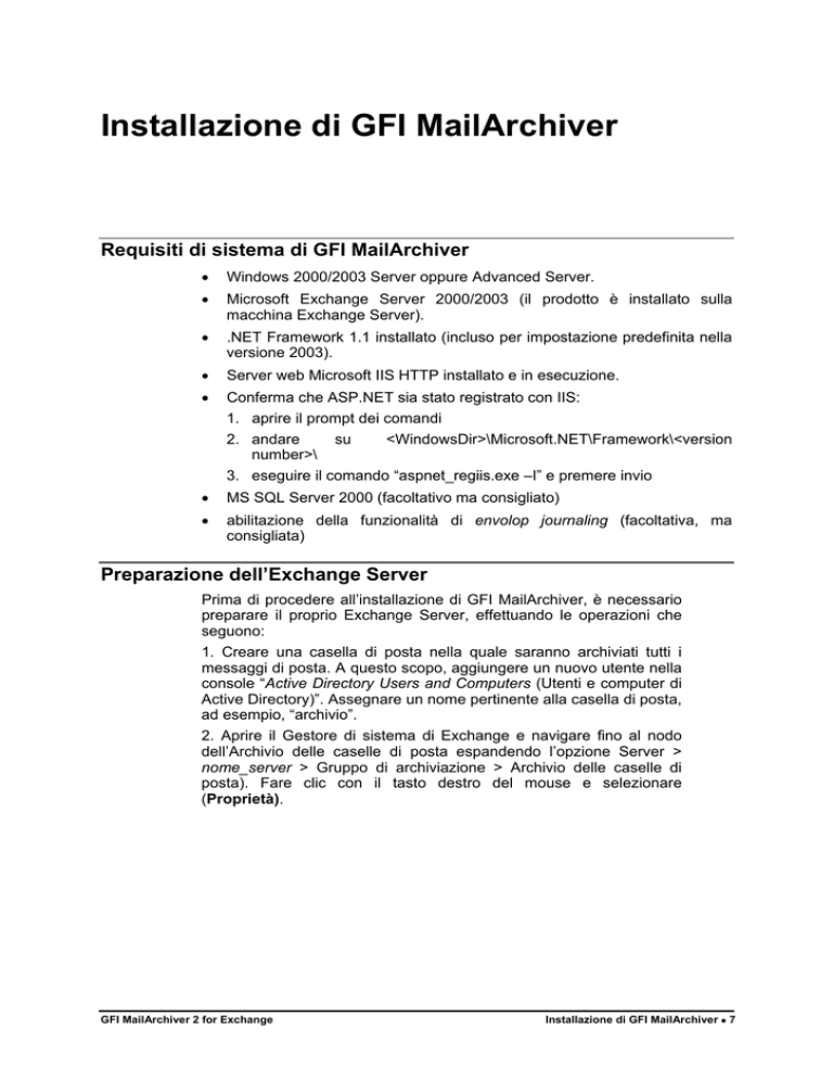 Installazione di GFI MailArchiver Requisiti di sistema di GFI MailArchiver • Windows 2000/2003 Server oppure Advanced Server. • Microsoft Exchange Server 2000/2003 (il prodotto è installato sulla macchina Exchange Server). • .NET Framework 1.1 installato (incluso per impostazione predefinita nella versione 2003). • Server web Microsoft IIS HTTP installato e in esecuzione. • Conferma che ASP.NET sia stato registrato con IIS: 1. aprire il prompt dei comandi 2. andare su <WindowsDir>\Microsoft.NET\Framework\<version number>\ 3. eseguire il comando “aspnet_regiis.exe –I” e premere invio • MS SQL Server 2000 (facoltativo ma consigliato) • abilitazione della funzionalità di envolop journaling (facoltativa, ma consigliata) Preparazione dell’Exchange Server Prima di procedere all’installazione di GFI MailArchiver, è necessario preparare il proprio Exchange Server, effettuando le operazioni che seguono: 1. Creare una casella di posta nella quale saranno archiviati tutti i messaggi di posta. A questo scopo, aggiungere un nuovo utente nella console “Active Directory Users and Computers (Utenti e computer di Active Directory)”. Assegnare un nome pertinente alla casella di posta, ad esempio, “archivio”. 2. Aprire il Gestore di sistema di Exchange e navigare fino al nodo dell’Archivio delle caselle di posta espandendo l’opzione Server > nome_server > Gruppo di archiviazione > Archivio delle caselle di posta). Fare clic con il tasto destro del mouse e selezionare (Proprietà). GFI MailArchiver 2 for Exchange Installazione di GFI MailArchiver • 7 3. Nella finestra di dialogo delle proprietà, accedere alla scheda General (Generale) ed abilitare l’opzione (“Archivia tutti i messaggi inviati e ricevuti dalle caselle di posta in questo archivio”). Schermata 3 – Abilitazione delle caselle di posta di Exchange 4. Fare clic sul pulsante (Sfoglia), situato a destra della casella di controllo (Archivio). In questo modo viene visualizzata la finestra di dialogo Seleziona destinatario). Inserire il nome della casella di posta creata precedentemente. È inoltre possibile archiviare le email in una cartella pubblica. Se si desidera scegliere tale opzione, inserire il nome di una cartella pubblica nella finestra di dialogo Seleziona destinatario). Fare clic su OK. 8 • Installazione di GFI MailArchiver GFI MailArchiver 2 for Exchange Schermata 4 – Selezione del nome della Casella di posta dell’archivio 5. Chiudere le proprietà di Archivio delle caselle di posta) ed (Gestore di sistema di Exchange). La macchina è quindi pronta per essere utilizzata con GFI MailArchiver. Preparazione del server SQL È possibile utilizzare GFI MailArchiver con Microsoft Access (ad esempio, per valutarne il funzionamento); tuttavia, a fini produttivi, si deve utilizzare Microsoft SQL Server 2000. Prima di installare il software, sul server SQL va creato un database per consentire il funzionamento di GFI MailArchiver e l’indicizzazione di ricerca dell’intero testo. Quest’ultima operazione è necessaria se si vuole effettuare una ricerca per parola chiave nel corpo dell’email. NOTA: GFI MailArchiver 2 funziona unicamente con Microsoft SQL Server 2000. Installazione ed abilitazione del componente “Full Text Search” (“Ricerca dell’intero testo”) Per poter effettuare una ricerca testuale nel corpo dell’email, GFI MailArchiver richiede l’installazione del componente “Full-Text Search” (“Ricerca dell’intero testo”). Una volta individuata la presenza del modulo, GFI MailArchiver indicizzerà le email. La ricerca nel corpo dell’email è supportata UNICAMENTE se si utilizza Microsoft SQL Server. 1. Eseguire il setup di SQL Server, scegliere l’opzione d’installazione “Upgrade, remove, or add components to an existing instance of SQL Server” (“Aggiorna, rimuovi o aggiungi componenti ad un’istanza esistente di SQL Server”) nella schermata delle opzioni e fare clic su Next (Avanti). Schermata 5 – Aggiunta di componenti all’installazione GFI MailArchiver 2 for Exchange Installazione di GFI MailArchiver • 9 2. Nella finestra di dialogo “Add components to your existing installation” (“Aggiungi componenti all’installazione esistente”), selezionare l’opzione “Add components...” (“Aggiungi componenti…”) e premere Next (Avanti). Schermata 6 – Installazione della ricerca dell’intero testo 3. Nella successiva finestra di dialogo fare clic su “Server Component” (“Componente del server”) nell’elenco “Components:” (“Componenti:”) e selezionare l’elemento “Full-Text Search” (“Ricerca dell’intero testo”) dell’elenco “Sub-Components:” (“Sub-componenti:”). Fare clic su “Next (Avanti)” per procedere all’installazione. Creazione del database 1. Aprire la console amministrativa “Enterprise Manager” del server SQL (Start > Programs > Microsoft SQL Server > Enterprise Manager, Start > Programmi > Microsoft SQL Server > Enterprise Manager) e andare sul server SQL sul quale verrà creato il database. Schermata 7 – Creazione di un nuovo database 10 • Installazione di GFI MailArchiver GFI MailArchiver 2 for Exchange 2. Fare clic con il tasto destro del mouse sul nodo “Databases” (“Database”) e selezionare l’opzione “New Database...” (“Nuovo database”). 3. Specificare il nome del database nella finestra di dialogo visualizzata (ad esempio, “MailArchive – Archivio Posta”) e quindi fare clic su OK. 4. Espandere il nodo del nuovo database, fare clic sul sub-nodo “Users” (“Utenti”) e selezionare l’opzione “New Database User...” (“Nuovo utente database…”). Schermata 8 – Creazione di un accesso (login) 5. Nella finestra di dialogo fare clic sull’elenco a discesa “Login name:” (“Nome di accesso:”) e selezionare l’elemento “<new>” (“<nuovo>”). GFI MailArchiver 2 for Exchange Installazione di GFI MailArchiver • 11 Schermata 9 – I