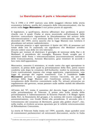 La liberalizzazione di poste e telecomunicazioni Tra il 1996 e il 1997 matura una delle maggiori riforme della storia economica italiana, quella del comparto delle telecomunicazioni, che ha avuto nella legge Maccanico il suo primo punto di approdo. Il legislatore, a quell'epoca, doveva affrontare due problemi, il grave ritardo con il quale l'Italia si stava muovendo nell'attuazione delle direttive comunitarie riguardanti la liberalizzazione del settore delle telecomunicazioni e una sentenza della Corte costituzionale, che, nel dicembre del 1994, aveva sancito che la legge Mammì non tutelava il pluralismo nel settore radiotelevisivo. La sentenza poneva a ogni operatore il limite del 20% di possesso sul totale delle reti Tv nazionali; ciò significava che Mediaset avrebbe dovuto cedere una delle tre reti televisive. Proprio per tentare di districare il groviglio di interessi della Rai e di Mediaset, il presidente del consiglio, Romano Prodi, sceglie per il ministero delle Poste e telecomunicazioni (successivamente ministero delle Comunicazioni), Antonio Maccanico, gran tessitore di accordi e ben visto dall'opposizione. Maccanico, assunto il ministero, si rende conto che ogni operazione in cantiere, la prima delle quali la privatizzazione della Stet, potrà essere condotta solo dopo la creazione dell'Authority; inoltre la sentenza della Corte costituzionale impone che venga approvata, urgentemente, una legge di proroga del regime transitorio. Con il cosiddetto Lodo Maccanico governo e opposizione trovano l'accordo, sia per una proroga della legge Mammì per l'emittenza privata, che per il recepimento delle direttive comunitarie sulle Tlc, attuati attraverso un regolamento del governo, senza passare sulle sabbie mobili del dibattito parlamentare. All'inizio del '97, inizia il cammino del decreto legge sull'Authority e sulla privatizzazione di Telecom. Il primo atto sulla strada della privatizzazione è l'allontanamento di Ernesto Pascale e di Biagio Agnes dalla Stet, la finanziaria del gruppo, e la nomina del nuovo consiglio di amministrazione, con Guido Rossi alla presidenza. Il secondo atto è l'ottenimento del consenso di Bertinotti, grazie alla golden share1, che, nella realtà, si rivelerà un'arma spuntata per le velleità veterocomuniste di Rifondazione Comunista. La storia di Telecom Italia inizia nel 1994, quando, dopo quindici anni di commissioni parlamentari ed estenuanti discussioni, anche in Italia 1 Conferisce alla stato potere di veto nei consigli di amministrazione delle società privatizzate. 1 viene creato un unico gestore telefonico pubblico; dai cinque che erano in precedenza nasce Telecom Italia e, un anno dopo, Telecom Italia Mobile. Nel 1997, come già visto, viene creata l'Authority delle telecomunicazioni ed è varata la "legge Maccanico" che definisce le regole della competizione. Il primo gennaio 1998 è il D-day per la telefonia europea; la deregulation, a lungo discussa, fa il suo debutto in dieci paesi dell'Ue. L'ultimatum di Bruxelles prevede la completa liberalizzazione di infrastrutture e servizi e il risultato, nel giro di due anni, è una riduzione media delle tariffe residenziali del 40% e di quelle affari del 25%. Nel 2000, in Italia, oltre cento aziende offriranno servizi alternativi a Telecom. Le modalità della privatizzazione erano state decise dal governo Ciampi; il controllo della Telecom, nella quale sarebbe confluita la Stet, sarebbe dovuto passare a un nucleo stabile, a maggioranza italiana, prevalentemente finanziario. Prodi, presidente dell'Iri, «Aveva timore soprattutto della Pirelli, mi pare», afferma Maccanico. Il timore dei precedenti Comit e Credit, banche per le quali i nuclei stabili di controllo erano nati contro le intenzioni di Prodi, consiglia, questa volta, di partire con un nucleo stabile di riferimento già dall'inizio, ma non si ha il coraggio pieno e salta fuori quel "prevalentemente finanziario", che significa banche ex pubbliche, cioè i soggetti meno adatti per una politica industriale innovativa nel campo delle telecomunicazioni. Nel collocamento sul mercato della Telecom fu molto difficile raccogliere il nocciolo stabile, costituito dalla Ifil degli Agnelli e da banche, mentre ci fu un grande entusiasmo tra i piccoli investitori. Il nucleo stabile (successivamente soprannominato nocciolo) dimostra subito una forte inconsistenza dovuta dalla mancanza di competenze nel settore. Rossi si dimette e al suo posto viene nominato Rossignolo; vengono fatte cadere tutte le opzioni per far entrare nel nucleo di controllo un partner straniero di grosso spessore (AT&T, British Telecom, Cable&Wireless). Ammette Maccanico: «Il nucleo stabile prese questa società complicata, concessionaria pubblica, di dimensione mastodontica, facendola fibrillare per diversi mesi in modo non sostenibile: manager che andavano e venivano, Vito Gamberale che passava e ripassava, la telefonia mobile che fu incorporata in Telecom e poi scorporata di nuovo». L'altro fronte di attività, per Maccanico, è quello della costituzione di un'Authority unica per Tlc e Tv, contro il parere di gran parte del Parlamento, che preferisce due Authority indipendenti. Nello scontro 2 per la presidenza, prevale il nome di Enzo Cheli, magistrato della Corte costituzionale, che si impone, come soluzione di mediazione tra i candidati delle varie correnti del governo. In quel biennio, le resistenze all'interno della Rai e di Mediaset, fanno cadere due possibilità di regolamentazione del settore. La costituzione di una piattaforma unica per la Tv digitale a pagamento, prima, tra Rai e Stet (il 5 maggio '97 viene firmato un memorandum d'intesa) e poi tra Canal Plus, Rai, Telecom, Fininvest, Cecchi Gori Group (memorandum d'intesa del 30 dicembre '97). Il "disarmo bilanciato" tra Rai e Mediaset, o con la dismissione di una rete per parte, oppure con la terza rete Rai senza pubblicità e una Tv Mediaset su satellite. Rompere il duopolio televisivo è un compito arduo per tutti. 