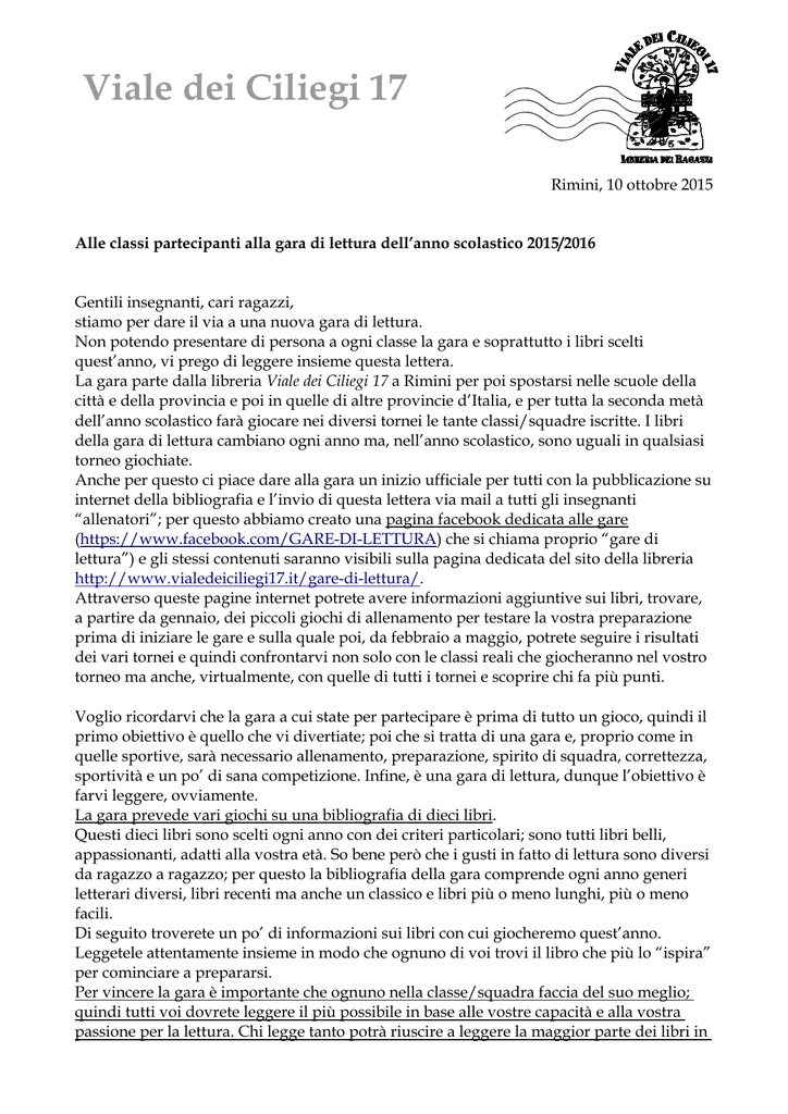 Viale dei Ciliegi 17 Rimini, 10 ottobre 2015 Alle classi partecipanti alla gara di lettura dell’anno scolastico 2015/2016 Gentili insegnanti, cari ragazzi, stiamo per dare il via a una nuova gara di lettura. Non potendo presentare di persona a ogni classe la gara e soprattutto i libri scelti quest’anno, vi prego di leggere insieme questa lettera. La gara parte dalla libreria Viale dei Ciliegi 17 a Rimini per poi spostarsi nelle scuole della città e della provincia e poi in quelle di altre provincie d’Italia, e per tutta la seconda metà dell’anno scolastico farà giocare nei diversi tornei le tante classi/squadre iscritte. I libri della gara di lettura cambiano ogni anno ma, nell’anno scolastico, sono uguali in qualsiasi torneo giochiate. Anche per questo ci piace dare alla gara un inizio ufficiale per tutti con la pubblicazione su internet della bibliografia e l’invio di questa lettera via mail a tutti gli insegnanti “allenatori”; per questo abbiamo creato una pagina facebook dedicata alle gare (https://www.facebook.com/GARE-DI-LETTURA) che si chiama proprio “gare di lettura”) e gli stessi contenuti saranno visibili sulla pagina dedicata del sito della libreria http://www.vialedeiciliegi17.it/gare-di-lettura/. Attraverso queste pagine internet potrete avere informazioni aggiuntive sui libri, trovare, a partire da gennaio, dei piccoli giochi di allenamento per testare la vostra preparazione prima di iniziare le gare e sulla quale poi, da febbraio a maggio, potrete seguire i risultati dei vari tornei e quindi confrontarvi non solo con le classi reali che giocheranno nel vostro torneo ma anche, virtualmente, con quelle di tutti i tornei e scoprire chi fa più punti. Voglio ricordarvi che la gara a cui state per partecipare è prima di tutto un gioco, quindi il primo obiettivo è quello che vi divertiate; poi che si tratta di una gara e, proprio come in quelle sportive, sarà necessario allenamento, preparazione, spirito di squadra, correttezza, sportività e un po’ di sana competizione. Infine, è una gara di lettura, dunque l’obiettivo è farvi leggere, ovviamente. La gara prevede vari giochi su una bibliografia di dieci libri. Questi dieci libri sono scelti ogni anno con dei criteri particolari; sono tutti libri belli, appassionanti, adatti alla vostra età. So bene però che i gusti in fatto di lettura sono diversi da ragazzo a ragazzo; per questo la bibliografia della gara comprende ogni anno generi letterari diversi, libri recenti ma anche un classico e libri più o meno lunghi, più o meno facili. Di seguito troverete un po’ di informazioni sui libri con cui giocheremo quest’anno. Leggetele attentamente insieme in modo che ognuno di voi trovi il libro che più lo “ispira” per cominciare a prepararsi. Per vincere la gara è importante che ognuno nella classe/squadra faccia del suo meglio; quindi tutti voi dovrete leggere il più possibile in base alle vostre capacità e alla vostra passione per la lettura. Chi legge tanto potrà riuscire a leggere la maggior parte dei libri in bibliografia, chi non legge molto potrà dare un importante aiuto alla sua squadra anche leggendo uno o due libri. L’importante è che ogni libro sia letto da qualcuno nella classe, vi consiglio almeno da due persone, in modo che ci sia sempre qualcuno preparato a rispondere alle domande su quel titolo (ricordatevi che a una partita qualcuno potrebbe essere assente!). Leggete la descrizione dei libri e cercate di individuare quello più adatto a voi, tenendo però conto anche delle scelte dei vostri compagni. Quando avrete terminato di leggere il vostro libro, anche se è di vostra proprietà, fatelo girare il più possibile tra i compagni; è importante che vi prestiate i libri a vicenda almeno fino alla fine della gara di lettura. Ricordate che dovete leggere il più possibile! In ogni sfida della gara sono previsti più giochi; alcuni saranno su tutti i libri, altri su uno in particolare estratto a sorte di volta in volta. Nella maggior parte dei giochi tutta la classe giocherà insieme, ma ci saranno momenti in cui dovrete decidere quale compagno dovrà affrontare domande su un libro. Tutti i giochi riguardano i dieci libri in bibliografia. Cercate di memorizzare la storia, i suoi personaggi, i luoghi, i passaggi fondamentali della trama, cosa accade prima e cosa dopo nella storia e sarà utile memorizzare bene anche nomi e dettagli, per quanto possibile. Ci saranno semplici domande ma anche giochi strutturati in vario modo e alcuni giochi cambieranno ad ogni partita; dunque non è importante prepararsi per un gioco specifico, ma semplicemente memorizzare il più possibile di uno o più libri. Visto che dovrete ricordarli bene tenete conto anche di questo per chi legge tanto: è un’ottima cosa se riuscite a leggere buona parte di questi dieci libri ma potrebbe essere utile “specializzarsi” soprattutto su uno o due da ricordare meglio, o perché saranno gli ultimi che avrete letto prima della gara o perché li avrete letti e magari riletti con maggiore attenzione rispetto agli altri. Un altro consiglio che vi sarà utile per formare una squadra molto forte è scegliere un capitano o portavoce che sia approvato da tutta la squadra e che riporterà le vostre risposte durante la partita, ma avrà anche il compito di verificare come sta andando la preparazione nei mesi precedenti, controllando che tutti i libri siano stati letti e rafforzando la preparazione della squadra facendo leggere a più compagni i libri che vi sembrano più difficili da memorizzare. Oltre ai giochi sui libri vi faremo alcune semplici domande sugli autori; sul sito www.maredilibri.it, a partire dal 2 novembre, troverete delle schede preparate da noi con tutte le informazioni utili per rispondere alle domande; in alcuni casi si tratterà di semplici schede piuttosto brevi, in altri casi troverete (sempre ben segnalati e collegate alla pagina) contributi speciali come interviste all’autore o video. 