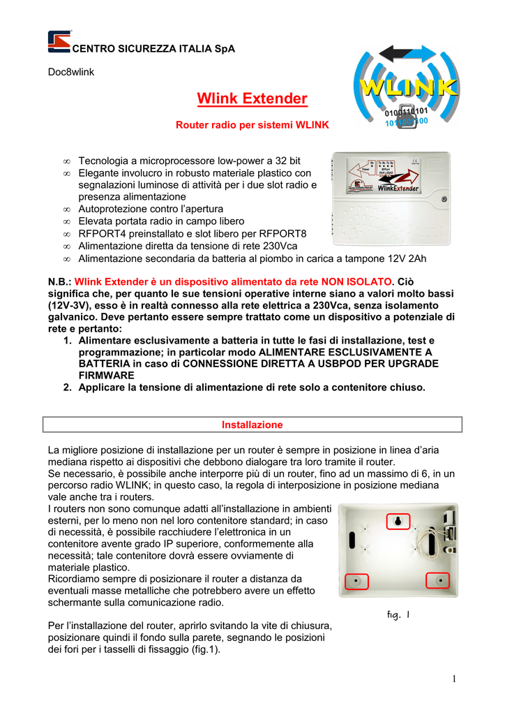 CENTRO SICUREZZA ITALIA SpA Doc8wlink Wlink Extender Router radio per sistemi WLINK • • • • • • • Tecnologia a microprocessore low-power a 32 bit Elegante involucro in robusto materiale plastico con segnalazioni luminose di attività per i due slot radio e presenza alimentazione Autoprotezione contro l’apertura Elevata portata radio in campo libero RFPORT4 preinstallato e slot libero per RFPORT8 Alimentazione diretta da tensione di rete 230Vca Alimentazione secondaria da batteria al piombo in carica a tampone 12V 2Ah N.B.: Wlink Extender è un dispositivo alimentato da rete NON ISOLATO. Ciò significa che, per quanto le sue tensioni operative interne siano a valori molto bassi (12V-3V), esso è in realtà connesso alla rete elettrica a 230Vca, senza isolamento galvanico. Deve pertanto essere sempre trattato come un dispositivo a potenziale di rete e pertanto: 1. Alimentare esclusivamente a batteria in tutte le fasi di installazione, test e programmazione; in particolar modo ALIMENTARE ESCLUSIVAMENTE A BATTERIA in caso di CONNESSIONE DIRETTA A USBPOD PER UPGRADE FIRMWARE 2. Applicare la tensione di alimentazione di rete solo a contenitore chiuso. Installazione La migliore posizione di installazione per un router è sempre in posizione in linea d’aria mediana rispetto ai dispositivi che debbono dialogare tra loro tramite il router. Se necessario, è possibile anche interporre più di un router, fino ad un massimo di 6, in un percorso radio WLINK; in questo caso, la regola di interposizione in posizione mediana vale anche tra i routers. I routers non sono comunque adatti all’installazione in ambienti esterni, per lo meno non nel loro contenitore standard; in caso di necessità, è possibile racchiudere l’elettronica in un contenitore avente grado IP superiore, conformemente alla necessità; tale contenitore dovrà essere ovviamente di materiale plastico. Ricordiamo sempre di posizionare il router a distanza da eventuali masse metalliche che potrebbero avere un effetto schermante sulla comunicazione radio. fig. 1 Per l’installazione del router, aprirlo svitando la vite di chiusura, posizionare quindi il fondo sulla parete, segnando le posizioni dei fori per i tasselli di fissaggio (fig.1). 1 CENTRO SICUREZZA ITALIA SpA Praticare quindi i fori, inserire i tasselli e successivamente fissare il router sulla parete. Inserire quindi la batteria nell’apposito alloggiamento (fig.2) e connettere i relativi faston avendo cura di rispettare le polarità rosso per il positivo, nero per il negativo (fig.3). Collegare il cavo di rete 230Vca, in assenza di tensione applicata, ai morsetti F (fase) e N (neutro), come da fig.4, SENZA APPLICARE ALIMENTAZIONE. La tensione di alimentazione di rete 230Vca dovrà essere fornita a valle di un dispositivo di protezione a norma contro i cortocircuiti e le dispersioni verso terra. fig. 2 Se ancora non eseguita, eseguire quindi la programmazione del router (vedere sotto il capitolo Programmazione). Ultimata la programmazione, chiudere il router riavvitando fino in fondo la vite di chiusura. Applicare l’alimentazione di rete a 230Vca. fig. 3 fig. 4 2 CENTRO SICUREZZA ITALIA SpA Programmazione La programmazione del router si esegue esclusivamente tramite il software easyWLINK, selezionando WLINK Extender sotto il comando Programmazione periferiche; a monitor compare il box di dialogo sotto rappresentato, per il quale andiamo di seguito a trattare significato e funzionamento delle varie programmazioni. Per mettere il router in attesa connessione da easyWLINK, premere il tasto PROG. Lo stato di attesa connessione viene evidenziato dal lampeggio intermittente dei led RX degli slot usati. Per leggere la programmazione, premere il tasto Leggi del box di dialogo; per riscriverla, premere il tasto Scrivi e per far uscire il router dall’attesa premere il tasto Disconnetti oppure premere nuovamente il tasto PROG sulla scheda. Identificativi Area destinata all’impostazione degli ID di sistema e di periferica. Mentre l’ID di sistema deve essere, come da standard WLINK, identico alle altre periferiche del sistema, l’ID di periferica nel caso dei routers deve seguire la regola di essere compreso tra 16 e 79 compreso. Non è necessario che gli ID di periferica siano contigui, è sufficiente che siano diversi tra loro. Questi ID di periferica dovranno essere poi programmati nei vari Percorsi di inoltro pacchetti (in centrale) e nel Routing delle comunicazioni (nelle periferiche) per identificare il percorso che un pacchetto dovrà percorrere per arrivare a destinazione. Varie Tamper attivo Abilitazione del tamper di protezione contro l’apertura dell’armadietto. Il tamper deve essere connesso ai morsetti TAMPER della scheda del router. Modalità compatibile SOLO stand-alone Attivare in caso di connessione diretta del router ad una centrale SOLO Lite. Lasciare il campo inattivo in tutti gli altri casi. Routing delle comunicazioni Questi campi, da 1 a 6, consentono di inserire degli ulteriori routers-ripetitori nella comunicazione tra il router stesso e la centrale. Questa programmazione stabilisce il 3 CENTRO SICUREZZA ITALIA SpA percorso di inoltro per le comunicazioni proprie del router in oggetto, perché il percorso delle comunicazioni delle altre periferiche sono già programmate nelle periferiche stesse e non devono in alcuna maniera essere ripetute nei routers. Possono essere inseriti fino a 6 routers programmandone l’indirizzo nei campi appositi, iniziando dal campo 1 e senza eseguire salti di campo. Il primo campo a zero indica fine del routing. A titolo di esempio, se si desidera che il router invii le sue comunicazioni al router 17, il quale a sua volta le inoltrerà in centrale, la programmazione da eseguire sarà: Campo1: 17 Campo 2 e successivi: 0 Se non si utilizza la funzione di routing, lasciare tutti i campi a zero. Notare che la medesima programmazione (ma con sequenza di routing invertita) dovrà essere programmata nella cent