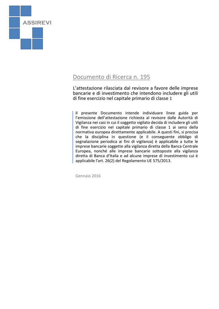 ASSIREVI BO Documento di Ricerca n. 195 L’attestazione rilasciata dal revisore a favore delle imprese bancarie e di investimento che intendono includere gli utili di fine esercizio nel capitale primario di classe 1 Il presente Documento intende individuare linee guida per l’emissione dell’attestazione richiesta al revisore dalle Autorità di Vigilanza nei casi in cui il soggetto vigilato decida di includere gli utili di fine esercizio nel capitale primario di classe 1 ai sensi della normativa europea direttamente applicabile. A questi fini, si precisa che la disciplina in questione (e il conseguente obbligo di segnalazione periodica ai fini di vigilanza) è applicabile a tutte le imprese bancarie soggette alla vigilanza diretta della Banca Centrale Europea, nonché alle imprese bancarie sottoposte alla vigilanza diretta di Banca d’Italia e ad alcune imprese di investimento cui è applicabile l'art. 26(2) del Regolamento UE 575/2013. Gennaio 2016 Documento di Ricerca n. 195 Gennaio 2016 L’ATTESTAZIONE RILASCIATA DAL REVISORE A FAVORE DELLE IMPRESE BANCARIE E DI INVESTIMENTO CHE INTENDONO INCLUDERE GLI UTILI DI FINE ESERCIZIO NEL CAPITALE PRIMARIO DI CLASSE 1 1. SCOPO DEL DOCUMENTO Il presente Documento intende individuare linee guida per l’emissione dell’attestazione richiesta al revisore dalle Autorità di Vigilanza nei casi in cui il soggetto vigilato decida di includere gli utili di fine esercizio nel capitale primario di classe 1 ai sensi della normativa europea direttamente applicabile (cfr. infra). A questi fini, si precisa che la disciplina in questione (e il conseguente obbligo di segnalazione periodica ai fini di vigilanza) è applicabile a tutte le imprese bancarie soggette alla vigilanza diretta della Banca Centrale Europea (di seguito, “BCE”), nonché alle imprese bancarie sottoposte alla vigilanza diretta di Banca d’Italia e ad alcune imprese di investimento cui è applicabile l'art. 26(2) del Regolamento UE 575/2013 1. 2. LE NORME DI RIFERIMENTO: IL REGOLAMENTO UE 575/2013, LA DECISIONE (UE) 2015/656 DI BCE 2 E LA COMUNICAZIONE DI BANCA D’ITALIA DEL 22 GENNAIO 2016 3 L’art. 26, par. 2, del Regolamento UE 575/2013 prevede che: “Ai fini del paragrafo 1, lettera c), gli enti possono includere nel capitale primario di classe 1 gli utili intermedi o di fine esercizio prima di adottare una decisione formale di conferma del risultato finale d'esercizio dell'ente per l'anno di riferimento soltanto con l'autorizzazione preliminare dell'autorità competente. L'autorità competente concede l'autorizzazione se sono soddisfatte le seguenti condizioni: a) gli utili sono stati verificati da persone indipendenti dall'ente che sono responsabili della revisione dei conti dell'ente stesso; 1 2 3 Le disposizioni della Parte Seconda – Applicazione in Italia del CRR - della Circolare n. 285 del 17 dicembre 2013 “Disposizioni di vigilanza prudenziale per le banche” che riconosce che le banche e i gruppi bancari possono computare gli utili di periodo o di fine esercizio nel CET1 al ricorrere delle condizioni previste dall’art. 26(2) del Regolamento UE 575/2013 (CRR) sono applicabili alle SIM e ai gruppi di SIM secondo quanto previsto dalla Comunicazione della Banca d’Italia del 31 marzo 2014 (SIM e gruppi di SIM: applicazione della nuova normativa prudenziale europea). Decisione (UE) 2015/656 di BCE del 4 febbraio 2015 sulle condizioni in presenza delle quali è consentito agli enti creditizi di includere nel capitale primario di classe 1 gli utili di periodo o di fine esercizio in conformità all'articolo 26, paragrafo 2, del Regolamento (UE) n. 575/2013 (BCE/2015/4). Comunicazione di Banca d’Italia del 22 gennaio 2016 “Compatibilità degli utili di periodo o di fine esercizio nel capitale primario di classe 1” recante indicazioni operative alle banche sottoposte alla vigilanza diretta della Banca d’Italia e alle SIM per la verifica, da parte dei revisori esterni, degli utili di periodo o di fine esercizio ai fini della loro computabilità nel capitale primario di classe 1. Documento di Ricerca n. 195 Gennaio 2016 b) l'ente ha dimostrato in modo soddisfacente, secondo il parere delle autorità competenti, che gli importi di tali utili sono al netto di tutti gli oneri e i dividendi prevedibili. Una verifica degli utili intermedi o di fine esercizio dell'ente garantisce in maniera soddisfacente che tali utili sono stati valutati conformemente ai principi enunciati nella disciplina contabile applicabile”. La Decisione (UE) 2015/656 di BCE del 4 febbraio 2015, all’art. 4 “Verifica degli utili”, precisa inoltre quanto segue: 1 La BCE considera soddisfatta la condizione relativa alla verifica di cui all'articolo 26, paragrafo 2, lettera a), del Regolamento (UE) n. 575/2013 se l'ente creditizio che effettua la comunicazione fornisce alla BCE un documento, sottoscritto dal suo revisore esterno, che presenti i requisiti indicati nei paragrafi 3 e 4. 2 Gli enti creditizi che comunicano la propria intenzione di includere gli utili di periodo o di fine esercizio nel capitale primario di classe 1, a vari livelli di consolidamento o su base individuale, possono fornire il documento di cui al paragrafo 1 al massimo livello di consolidamento. 3 Per gli utili di fine esercizio, la verifica consiste o in una relazione di revisione o in una lettera di attestazione provvisoria (comfort letter) che attesti che la revisione non è stata completata e che nulla si è posto all'attenzione dei revisori che possa indurli a ritenere che la relazione finale presenterà un giudizio con rilievi. 4 Per gli utili di periodo, la verifica consiste o in una relazione di revisione o in una relazione di revisione contabile limitata (review report, come definita dall'International Standard on Review Engagements 2410, emesso dall'International Auditing and Assurance Standards Board, o uno standard comparabile applicabile a livello nazionale) o, a condizione che la verifica condotta dal