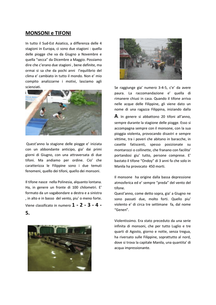 MONSONI e TIFONI In tutto il Sud-Est Asiatico, a differenza delle 4 stagioni in Europa, ci sono due stagioni : quella delle piogge che va da Giugno a Novembre e quella “secca” da Dicembre a Maggio. Possiamo dire che c’erano due stagioni , bene definite, ma ormai si sa che da pochi anni l’equilibrio del clima e’ cambiato in tutto il mondo. Non e’ mio compito analizzarne i motivi, lasciamo agli scienziati. Se raggiunge gia’ numero 3-4-5, c’e’ da avere paura. La raccomandazione e’ quella di rimanere chiusi in casa. Quando il tifone arriva nelle acque delle Filippine, gli viene dato un nome di una ragazza Filippina, iniziando dalla A. Quest’anno la stagione delle piogge e’ iniziata con un abbondante anticipo, gia’ dai primi giorni di Giugno, con una attraversata di due tifoni. Ma andiamo per ordine. Cio’ che caratterizza le Filippine sono i due temuti fenomeni, quello dei tifoni, quello dei monsoni. Il tifone nasce nella Polinesia, alquanto lontana. Ha, in genere un fronte di 100 chilometri. E’ formato da un vagabondare a destra e a sinistra , in alto e in basso del vento, piu’ o meno forte. Viene classificato in numero 5. 1-2-3-4- In genere si abbattono 20 tifoni all’anno, sempre durante la stagione delle piogge. Esso si accompagna sempre con il monsone, con la sua pioggia violenta, provocando disastri e sempre vittime, tra i poveri che abitano in baracche, in casette fatiscenti, spesso posizionate su montarozzi o collinette, che franano con facilita’ portandosi giu’ tutto, persone comprese. E’ bastato il tifone “Ondoy” di 3 anni fa che solo in Manila ha provocato 450 morti. Il monsone ha origine dalla bassa depressione atmosferica ed e’ sempre “preda” del vento del tifone. Quest’anno, come detto sopra, gia’ a Giugno ne sono passati due, molto forti. Quello piu’ violento e’ di circa tre settimane fa, dal nome “Genen”. Violentissimo. Era stato preceduto da una serie infinita di monsoni, che per tutto Luglio e tre quarti di Agosto, giorno e notte, senza tregua, ha riversato sulle Filippine, soprattutto al nord, dove si trova la capitale Manila, una quantita’ di acqua impressionante. Tutte le vie di comunicazione erano allagate. Le strade erano divenute fiumi torrenziali, in certi punti l’acqua superava l’altezza di una persona dalla statura normale. Faceva anche freddo...e siamo ai tropici. Scuole chiuse per diversi giorni. Il livello di un fiume a Manila ha raggiunto i 25 metri. In gran parte della citta’, mancanza di energia elettrica. Un grande problema pure il procacciarsi il cibo. Tuttavia i bambini erano felici ovunque, senza rendersi conto dei pericoli per la salute. Infatti nuotavano liberamente in un’acqua proveniente dai drenaggi otturati dalla plastica e dall’immondizia. Acqua inquinatissima soprattutto a causa dei topi. Dai canali televisivi che funzionavano, si raccomandava da parte dei medici di evitare le nuotate, fonti soprattutto di leptospirosi. Automobili sommersi dall’acqua. Tondo, nella nostra missione Canossiana, ha sofferto parecchio, come sempre, della grande innondazione. Acqua dappertutto, nelle misere cassette, nelle baracche, vestiario abbondantemente zuppo, libri degli studenti irrimedialmente distrutti,...tutto e tanto alla malora. Famiglie intere hanno dovuto lasciare tutto e passare la notte nei vari campi di pallacanestro, risparmiati dall’acqua, in qualche scuola. Le due chiese della parrocchia innondate all’inverosimile, non si e’ potuto celebrare la Messa, i funerali, ecc... In Manila ci sono stati 69 morti !...Pure alcuni bambini, qualche adulto fulminato dai cavi della corrente elettrica caduti nell’acqua. Tuttavia c’e’ da riconoscere, che nonostante queste “tragedie” annuali, (senza contare i vari terremoti essendo le Filippine una terra di vulcani, ben 22 attivi ), il Filippino sa sdrammatizzare...Gia’ durante l’infuriare del tifone e del monsone,quando la sua casetta o baracca, sta andando giu’, martello alla mano e chiodi, e’ li’ che cerca in qualche modo di ripararla. Si aspettano fino a Novembre, ed e’ il caso di dirlo, pure fino a Dicembre altri 9- 10 tifoni,considerate lo squilibrio atmosferico, piu’ o meno forti e distruttivi. E sempre a rimetterci e’ la stragrande maggioranza dei “poveri diavoli” dei poveri. P. Giovanni