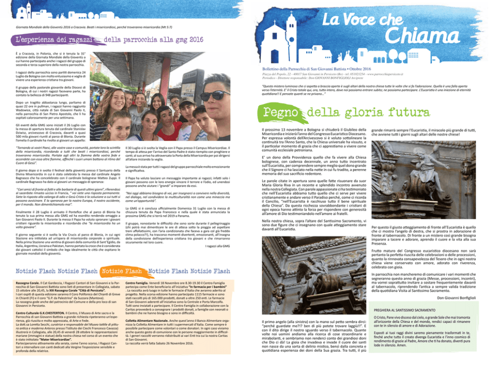 Giornata Mondiale della Gioventù 2016 a Cracovia. Beati i misericordiosi, perché troveranno misericordia (Mt 5:7) L’esperienza dei ragazzi La Voce che Chiama della parrocchia alla gmg 2016 È a Cracovia, in Polonia, che si è tenuta la 31° edizione della Giornata Mondiale della Gioventù a cui hanno partecipato anche i ragazzi del gruppo di seconda e terza superiore della nostra parrocchia. Bollettino della Parrocchia di San Giovanni Battista • Ottobre 2016 I ragazzi della parrocchia sono partiti domenica 24 Luglio da Bologna con molto entusiasmo e voglia di vivere una esperienza cristiana tra giovani. Piazza del Popolo, 22 - 40017 San Giovanni in Persiceto (Bo) - tel. 051821254 - www.parrocchiapersiceto.it Periodico - Direttore responsabile: Don GIOVANNI BONFIGLIOLI Arciprete “Questo mistero luminoso che ci aspetta a braccia aperte è sugli altari della nostra chiesa tutte le volte che si fa l’adorazione. Quella è una falla aperta verso l’eternità. E’ il Cristo totale qui, ora, tutto intero, dove noi possiamo entrare subito; ne possiamo partecipare. L’Eucaristia è una iniezione di eternità quotidiana!! E pensate quanti se ne privano…” Il gruppo della pastorale giovanile della Diocesi di Bologna, di cui i nostri ragazzi facevano parte, ha contato la bellezza di 948 partecipanti. Dopo un tragitto abbastanza lungo, parliamo di quasi 22 ore in pullman, i ragazzi hanno raggiunto Wadowice, città natale di San Giovanni Paolo II, nella parrocchia di San Pietro Apostolo, che li ha ospitati calorosamente per una settimana. Pegno della gloria futura Gli eventi della GMG sono iniziati il 26 Luglio con la messa di apertura tenuta dal cardinale Stanislav Dziwisz, arcivescovo di Cracovia, davanti a quasi 500 mila giovani riuniti al parco di Blonia. Durante l’omelia il cardinale ha rivolto ai giovani un appello: “Tornando ai vostri Paesi, alle vostre case e comunità, portate loro la scintilla della misericordia, ricordando a tutti che beati i misericordiosi, perché troveranno misericordia. Portate agli altri la fiamma della vostra fede e accendete con essa altre fiamme, affinché i cuori umani battano al ritmo del Cuore di Gesù”. Il giorno dopo si è svolto il festival della gioventù presso il Santuario della Divina Misericordia in cui è stata celebrata la messa dal cardinale Angelo Bagnasco che ha concelebrato con il cardinale bolognese Matteo Zuppi. Il cardinale Bagnasco ha dato ai giovani un messaggio di speranza: “Cari amici di fronte ai fatti e alle barbarie di questi ultimi giorni”, riferendosi al sacerdote rimasto ucciso in Francia, “ voi siete una risposta permanente. Siete la risposta alla valanga di odio e Gesù Cristo è la soluzione a cui tutti si possono avvicinare. È la speranza per la nostra Europa, il nostro occidente, per il mondo. Non dimentichiamolo mai”. Finalmente il 28 Luglio è arrivato il Pontefice che al parco di Blonia ha tenuto la sua prima messa alla GMG ed ha esordito rendendo omaggio a San Giovanni Paolo II. Durante la messa il Papa ha voluto spronare i giovani cristiani riguardo la misericordia e ricordando che “la misericordia ha un volto giovane”. Il giorno seguente si è svolta la Via Crucis al parco di Blonia, in cui ogni Stazione era intitolata ad un’opera di misericordia corporale o spirituale. Nella prima Stazione una ventina di giovani della comunità di Sant’Egidio, da Italia, Argentina, Ucraina e Pakistan, hanno portato la croce che è considerata dai giovani cattolici il simbolo che lega idealmente le città che ospitano le giornate mondiali della gioventù. Il 30 Luglio si è svolta la Veglia con il Papa presso il Campus Misericordiae. Il tempo di attesa per l’arrivo del Santo Padre è stato riempito con preghiere e canti; al suo arrivo ha attraversato la Porta della Misericordia per poi dirigersi all’altare iniziando la veglia. La messa è stata per tutti i ragazzi del gruppo parrocchiale molto emozionante e significativa. Il Papa ha voluto lasciare un messaggio importante ai ragazzi; infatti solo i giovani possono con le loro energie vincere il terrore e l’odio, ed unendosi possono anche aiutare i “grandi” a imparare da essi. “Noi oggi abbiamo bisogno di voi, per insegnarci a convivere nella diversità, nel dialogo, nel condividere la multiculturalità non come una minaccia ma come un’opportunità”. La GMG si è conclusa ufficialmente Domenica 31 Luglio con la messa di chiusura tenuta da Papa Francesco e nella quale è stata annunciata la prossima GMG che si terrà nel 2019 a Panama. Il gruppo, nonostante le difficoltà che sono sorte durante il pellegrinaggio (chi potrà mai dimenticare le ore di attesa sotto la pioggia ad aspettare treni affollatissimi, con l’aria condizionata che faceva a gara col già freddo clima polacco?!), ha trascorso momenti divertenti, emozionanti, all’insegna della condivisione dell’esperienza cristiana tra giovani e che rimarranno sicuramente nel loro cuore. I ragazzi alla GMG Notizie Flash Notizie Flash Notizie Flash Rassegna Corale. Il Cat Gardeccia, I Ragazzi Cantori di San Giovanni e la Parrocchia di San Giovanni Battista sono lieti di presentare in Collegiata, sabato 15 ottobre alle 20,45, la XIII Rassegna Corale “Città di Persiceto”. I cori ospiti di questa edizione saranno il Coro Polifonico del Chianti di Greve in Chianti (FI) e il coro “G.P. da Palestrina” da Suzzara (Mantova). La rassegna gode anche del patrocinio del Comune e della pro loco di san Giovanni in Persiceto. Centro Culturale G.K.CHESTERTON. Il Centro, il Museo di Arte sacra e la Parrocchia di san Giovanni Battista a grande richiesta ripeteranno un’esperienza, già riuscita e molto apprezzata, di Arte e Fede. La dott.sa Loretta Secchi, curatrice e responsabile del Museo tattile di pittura antica e moderna Anteros presso l’Istituto dei Ciechi Francesco Cavazza) illustrerà in Collegiata, alle 20,45 di venerdì 28 ottobre le rappresentazioni mariane (immagini e statue) del