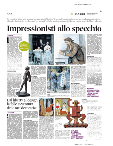 -MSGR - 20 CITTA - 21 - 11/10/15-N:CITTA’ 21 Arte Domenica 11 Ottobre 2015 www.ilmessaggero.it Da giovedì al Vittoriano le opere provenienti dal Musée d’Orsay: dall’esordio del movimento con la sua aspirazione ad uscire dagli atelier per lavorare “en plein air” all’affermazione dei grandi. Ritratti e autoritratti da Manet a Renoir Impressionisti allo specchio pano anche le fotografie, non a caso Nadar amava parecchio proprio questi artisti. Persone immortalate da sole, o con i loro oggetti, come il Ritratto di donna con vaso di porcellana, sempre di Degas. Numerosi i Renoir esposti, accanto a dipinti del suo grande amico Bazille: L’altalena, di certo, è tra i suoi migliori. Tra loro, non sfigura certamente una scultura di Medardo Rosso, di poco successivo all’Impressionismo, un busto del figlio dell’industriale Mond, Alfred; o un dipinto di John Singer Sargent, che fu loro vicino (mentre l’unica donna impressionista non francese è stata Mary Cassat). LA MOSTRA na galleria di ritratti e autoritratti, in cui magari i grandi maestri (a quel tempo non ancora famosi) si eternano a vicenda; altri, di personaggi che erano celeIl balcone bri o stavano per diventarlo; lo studio di qualdipinto da che artista; squarci delManet tra il la vita quotidiana, a ca1868 e il ’69 vallo tra l’Otto e Novecento: questi i temi della nuova mostra degli Impressionisti al Vittoriano, circa 60 dipinti provenienti dalla collezione parigina del museo d’Orsay, il “tempio” di questo periodo dell’arte, che si apre giovedì e durerà fino al 7 febbraio. Curata da Guy Cogeval, il direttore del museo, con alcuni collaboratori (cat. Skira), racconta la vera peculiarità del pittori “en plein air”: quella di annullare la barriera tra l’atelier dell’artista e la vita comune; di «farlo uscire dal proprio guscio», come dice già nel 1876 lo scrittore Edmond Duranty che alcuni pensavano perfino un figlio naturale di Prosper Mérrimée. U LO STUDIO DI NADAR In quel momento, il movimento impressionista era sorto da appena due anni, in virtù di una mostra organizzata a Parigi, Boulevard des Capucines: Edgar Degas, Paul Cézanne, Claude Monet, Pierre-Auguste Renoir, Alfred Sisley, qualche altro, con l’italiano Giuseppe De Nittis, nello studio di Nadar, cioé il fotografo Gaspard-Félix Tourmachon. E’ il battesimo ufficiale di un gruppo di artisti, destinato a «modificare ogni valore sentimentale e poetico» (Pierre Francastel). Le opere che saranno a Roma spaziano dal 1855 fino al 1913. Frédéric Bazille che eterna Renoir; Carolus-Duran, il quale immortala Edouard Manet; LA PERSPICACIA IL QUADRO Il giocatore di carte di Paul Cézanne (1890 - 1892) Renoir che effigia Monet; Degas, Cézanne e Léon Bonnat si dedicano ai propri Autoritratti; i volti di celebri personaggi fissati sulla tela quando non erano, magari, ancora affermati: Victor Hugo (un bronzo di Auguste Rodin), Claude Debussy, Stéphane Mallarmé. I PERSONAGGI In più, Bazille ci regala il suo atelier; Maurice Denis, Degas con la sua modella; Renoir, il volto di William Sisley, padre del pittore Alfred, ricco uomo d’affari; Cézanne la moglie. Né mancano le sculture: uno Studio di nudo per la ballerina vestita di Degas; i bronzi del principe Paolo Troubetzkoy; un marmo con quattro bronzi di Rodin, di cui uno eterna il celebre pittore Pierre Puvis de Chavannes. Ed Émile Zola chiarisce: sono «pittori che amano il loro tempo, cercano di penetrare figure prese dalla vita, con tutto l’amore che provano per i AL PARCO soggetti moderni». L’altalena di Renoir, a sinistra Studio di nudo per Nel novero, alcuni piccoli capo- ballerina di Degas (tutte le immagini © photo Musée d'Orsay/RMN) Dal liberty al design la folle avventura delle arti decorative L’ESPOSIZIONE ono «le basi per il “good design” italiano che fiorirà nel secondo dopoguerra»: «Periodo di creatività straordinaria, mentre il Paese corre verso la catastrofe», «nelle arti decorative italiane, all’inizio del XX secolo, trionfa la gioia di vivere», spiega Guy Cogeval, presidente del Museo d’Orsay, che in questi giorni a Roma la fa da padrone; sua anche la mostra al Vittoriano. Ha iniziato una ricerca sul periodo già nel 2006, quando dirigeva il Museo des Beaux-Arts di Montréal; ora la trasfonde in una mostra, già a Parigi, organizzata con Palazzo delle Esposizioni, in cui le 200 opere di “Una dolce vita? Dal liberty al design italiano, 1900 - 1940” saranno esposte dal 16 ottobre al 17 gennaio (cat. Skira). Un itinerario che spazia dall’Art Nouveau (l’Esposizione a Torino nel 1902) al Divisionismo S (Gaetano Previati e Giuseppe Pelizza da Volpedo), al Futurismo (il manifesto di Giacomo Balla e Fortunato Depero è del 1915), al “ritorno all’ordine”; dall’architettura, ai quadri, ai mobili: è un “come eravamo” di sicuro effetto. IL MUSICAL WESTERN Con gli arredi di Carlo Bugatti, il primo musical western: la Fanciulla del West, di Giacomo Puccini; dai quadri al cinema anche se Mussolini realizzerà solo un film di quelli voluti, Scipione l’Africano. Una spensierata corsa verso l’abisso, quando all’orizzonte già si stagliano due guerre, e un regime. L’Italia borghese «si considerava una grande nazione» in età giolittiana: ma era arretrata e rurale. Ma le arti decorative vivono una straordinaria avventura. Gli arredamenti quelli in soffitta, già di qualche bisnonno?); maioliche, bronzi e dipinti di Cambellotti; l’invenzione di lavori: Il balcone di Manet (del 1890), i ritratti di Mallarmé e di una Angelina; Degas che dipinge tre giovani industriali del tempo; un bozzetto per i Giocatori di carte di Cézanne. Come L’altalena di Renoir, sono autentici specchi di un’epoca: di una inedita sfida, carica di psicologia e introspezione. E’ la “nuova pittura” che, tradotta in mostre, significa anche cassetta sicura. Non è un caso se altre due loro esposizioni sono in corso a Genova, e a Torino. INCONTRI I
