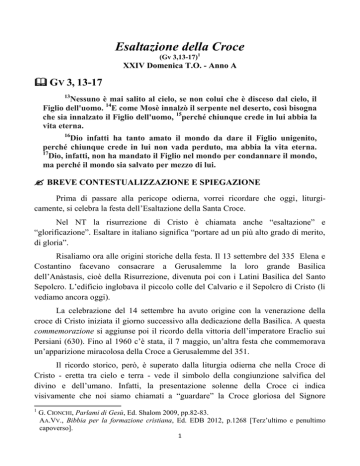Esaltazione della Croce (Gv 3,13-17)1 XXIV Domenica T.O. - Anno A GV 3, 13-17 13 Nessuno è mai salito al cielo, se non colui che è disceso dal cielo, il Figlio dell'uomo. 14E come Mosè innalzò il serpente nel deserto, così bisogna che sia innalzato il Figlio dell'uomo, 15perché chiunque crede in lui abbia la vita eterna. 16 Dio infatti ha tanto amato il mondo da dare il Figlio unigenito, perché chiunque crede in lui non vada perduto, ma abbia la vita eterna. 17 Dio, infatti, non ha mandato il Figlio nel mondo per condannare il mondo, ma perché il mondo sia salvato per mezzo di lui. BREVE CONTESTUALIZZAZIONE E SPIEGAZIONE Prima di passare alla pericope odierna, vorrei ricordare che oggi, liturgicamente, si celebra la festa dell’Esaltazione della Santa Croce. Nel NT la risurrezione di Cristo è chiamata anche “esaltazione” e “glorificazione”. Esaltare in italiano significa “portare ad un più alto grado di merito, di gloria”. Risaliamo ora alle origini storiche della festa. Il 13 settembre del 335 Elena e Costantino facevano consacrare a Gerusalemme la loro grande Basilica dell’Anàstasis, cioè della Risurrezione, divenuta poi con i Latini Basilica del Santo Sepolcro. L’edificio inglobava il piccolo colle del Calvario e il Sepolcro di Cristo (li vediamo ancora oggi). La celebrazione del 14 settembre ha avuto origine con la venerazione della croce di Cristo iniziata il giorno successivo alla dedicazione della Basilica. A questa commemorazione si aggiunse poi il ricordo della vittoria dell’imperatore Eraclio sui Persiani (630). Fino al 1960 c’è stata, il 7 maggio, un’altra festa che commemorava un’apparizione miracolosa della Croce a Gerusalemme del 351. Il ricordo storico, però, è superato dalla liturgia odierna che nella Croce di Cristo - eretta tra cielo e terra - vede il simbolo della congiunzione salvifica del divino e dell’umano. Infatti, la presentazione solenne della Croce ci indica visivamente che noi siamo chiamati a “guardare” la Croce gloriosa del Signore 1 G. CIONCHI, Parlami di Gesù, Ed. Shalom 2009, pp.82-83. AA.VV., Bibbia per la formazione cristiana, Ed. EDB 2012, p.1268 [Terz’ultimo e penultimo capoverso]. 1 sapendo che chi crede in lui ha la vita eterna (v. 15), infondendo speranza ai “crocifissi” di ogni tempo. [Noi diamo al termine “crocifisso” un significato sociale, definendo con questa parola gli uomini infelici, i poveri, i malati, gli anziani soli, gli sfruttati, gli handicappati (i quali oggi rifiutano questa etichetta!). Ma la parola ci viene dalla nostra matrice cristiana perché Cristo è il capo del Corpo Mistico e molte membra del suo Corpo soffrono, in croce come lui]. La pericope odierna è una parte del lungo colloquio notturno fra Gesù e Nicodemo, un maestro della legge, un intellettuale un po’ pauroso. Gesù annuncia la sua prossima morte mediante la crocifissione, uno strumento fra i più crudeli, in uso presso i Romani, e paragona se stesso - chiamandosi Figlio dell’uomo innalzato da terra - al serpente di bronzo che Mosè aveva eretto nel deserto a beneficio del popolo, come viene narrato nel libro dei Numeri (prima lettura). Coloro che erano stati morsi dai serpenti (perché si erano ribellati a Dio) se avessero guardato il serpente di rame sarebbero restati in vita. Ora la salvezza è donata dal Figlio che Dio ha mandato per amore del mondo. SPUNTI PER LA MEDITAZIONE E L’ATTUALIZZAZIONE Prima di passare alla pericope (=brano biblico utilizzato per la liturgia)2 evangelica vorrei raccontare il Salmo responsoriale, il 77 (78 sulla Bibbia)3. Questo salmo sapienziale è una esposizione-lode del salmista sulla storia della salvezza di Israele (ma anche nostra). La misericordia e la fedeltà di Dio trionfano sul peccato e l’infedeltà del popolo. Nella prima strofa il salmista-saggio invita il popolo ad ascoltare l’insegnamento normativo di Dio (Torah), le sue parole impegnative (dabar), i suoi detti interpretativi della storia (masal), le soluzioni degli aforismi-enigmi (hidot) della sapienza antica tramandata (cfr. Mt 13,34-35, Lectio XVI, leggermente modificata). La seconda strofa (vv.34-35) parla di una dura realtà: è il castigo e non l’amore che spesso ha fatto (e fa) rinsavire gli Israeliti (e noi oggi). Solo se prostrati dal peccato (=dal castigo di Dio) si mettono a cercare, si voltano indietro e guardano verso Dio, la rupe della loro vita, il loro salvatore. 2 AA. VV., Piccolo Dizionario Biblico, Supplemento a Famiglia Cristiana 21(2009), Ed. San Paolo, p.162. 3 AA. VV., La Bibbia Nazaret, Ed. Ancora 2013, p.940 [Box utile per la numerazione dei Salmi], p.975 [Rifletti attentamente sulla tua vita con l’aiuto del box]. 2 Ma, (terza strofa, vv. 36-37), questo ritorno forzato non è conversione vera e perciò si mente con le parole e l’esistenza. Alla liberalità dell’amore-alleanza si può (e si deve) rispondere solo con la libertà dell’amore, e non con la paura (causa di insincerità e di infedeltà). Dio allora (quarta strofa, v. 38), rompendo lo schema deuteronomistico «peccato-castigo-conversione-peccato» cambia il paradigma (stupenda teologia pedagogica!), si fa misericordioso, perdona la colpa dell’uomo invece di colpirlo. Solo l’amore misericordioso, gratuito (Es 34,7; Ef 2,4) converte e fa maturare: è la sapienza di Dio4, esempio per l’uomo e il credente. Mi sono soffermata sul salmo perché è in continuità tematica con la progressione delle domeniche precedenti. In Mt 16,21 (Lectio XXII), infatti, c’è stato il primo annuncio della Passione. Nei vv. 13-15 del passo evangelico Gesù afferma lapidariamente che nessun uomo ha mai potuto raggiungere Dio e le cose divine [un po’ polemicamente contro alcuni testi del Primo Testamento (Is 52,13; Dn 4,19; Gen 5,24) e le attese messianiche diffuse (Dn 7,13)] e che soltanto il Figlio dell’uomo (che in Gv è il Figlio di Dio incarnato che si trova in terra ed in cielo) è il vero ed unico rivelatore del Pad