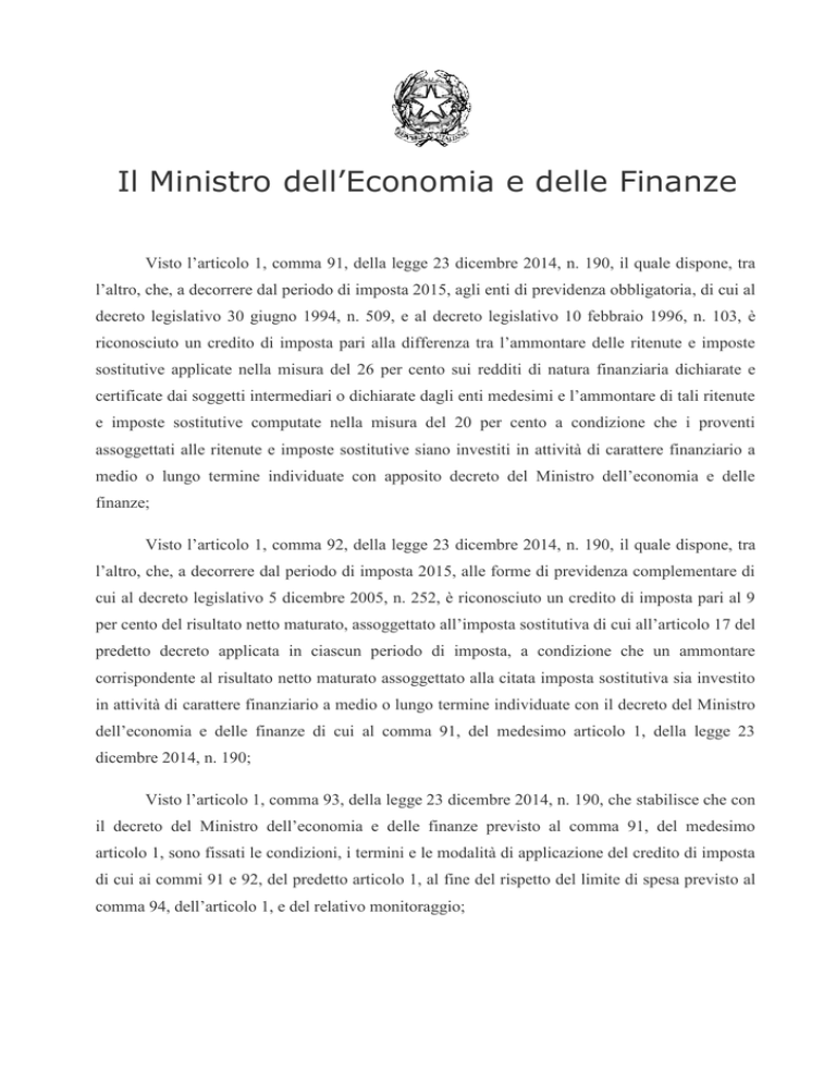 Il Ministro dell’Economia e delle Finanze Visto l’articolo 1, comma 91, della legge 23 dicembre 2014, n. 190, il quale dispone, tra l’altro, che, a decorrere dal periodo di imposta 2015, agli enti di previdenza obbligatoria, di cui al decreto legislativo 30 giugno 1994, n. 509, e al decreto legislativo 10 febbraio 1996, n. 103, è riconosciuto un credito di imposta pari alla differenza tra l’ammontare delle ritenute e imposte sostitutive applicate nella misura del 26 per cento sui redditi di natura finanziaria dichiarate e certificate dai soggetti intermediari o dichiarate dagli enti medesimi e l’ammontare di tali ritenute e imposte sostitutive computate nella misura del 20 per cento a condizione che i proventi assoggettati alle ritenute e imposte sostitutive siano investiti in attività di carattere finanziario a medio o lungo termine individuate con apposito decreto del Ministro dell’economia e delle finanze; Visto l’articolo 1, comma 92, della legge 23 dicembre 2014, n. 190, il quale dispone, tra l’altro, che, a decorrere dal periodo di imposta 2015, alle forme di previdenza complementare di cui al decreto legislativo 5 dicembre 2005, n. 252, è riconosciuto un credito di imposta pari al 9 per cento del risultato netto maturato, assoggettato all’imposta sostitutiva di cui all’articolo 17 del predetto decreto applicata in ciascun periodo di imposta, a condizione che un ammontare corrispondente al risultato netto maturato assoggettato alla citata imposta sostitutiva sia investito in attività di carattere finanziario a medio o lungo termine individuate con il decreto del Ministro dell’economia e delle finanze di cui al comma 91, del medesimo articolo 1, della legge 23 dicembre 2014, n. 190; Visto l’articolo 1, comma 93, della legge 23 dicembre 2014, n. 190, che stabilisce che con il decreto del Ministro dell’economia e delle finanze previsto al comma 91, del medesimo articolo 1, sono fissati le condizioni, i termini e le modalità di applicazione del credito di imposta di cui ai commi 91 e 92, del predetto articolo 1, al fine del rispetto del limite di spesa previsto al comma 94, dell’articolo 1, e del relativo monitoraggio; Visto l’articolo 1, comma 94, della legge 23 dicembre 2014, n. 190, che autorizza la spesa di 80 milioni di euro, a decorrere dall’anno 2016, per l’attuazione dei commi da 91 a 93, del medesimo articolo 1; Visto il decreto legislativo 5 dicembre 2005, n. 252, recante “Disciplina delle forme pensionistiche complementari”, e successive modificazioni; Visto il decreto legislativo 10 febbraio 1996, n. 103, recante “Attuazione della delega conferita all’art. 2, comma 25, della legge 8 agosto 1995, n. 335, in materia di tutela previdenziale obbligatoria dei soggetti che svolgono attività autonoma di libera professione”, e successive modificazioni; Visto il decreto legislativo 30 giugno 1994, n. 509, recante “Attuazione della delega conferita dall’art. 1, comma 32, della legge 24 dicembre 1993, n. 537, in materia di trasformazione in persone giuridiche private di enti gestori di forme obbligatorie di previdenza e assistenza”, e successive modificazioni; Visto l’articolo 1, comma 53, della legge 24 dicembre 2007, n. 244, che prevede, tra l’altro, che, dal 1° gennaio 2008, anche in deroga alle disposizioni previste dalle singole leggi istitutive, i crediti di imposta da indicare nel quadro RU della dichiarazione dei redditi possono essere utilizzati nel limite annuale di 250.000 euro; Visto l’articolo 1, commi da 421 a 423, della legge 30 dicembre 2004, n. 311, che contiene disposizioni relative al recupero dei crediti indebitamente utilizzati in tutto o in parte, anche in compensazione ai sensi dell’articolo 17, del decreto legislativo 9 luglio 1997, n. 241; Visto l’articolo 34, della legge 23 dicembre 2000, n. 388, che prevede, tra l’altro, che, dal 1° gennaio 2001, il limite massimo dei crediti di imposta e dei contributi compensabili ai sensi dell’articolo 17, del decreto legislativo 9 luglio 1997, n. 241, ovvero rimborsabili ai soggetti intestatari di conto fiscale, è fissato in euro 700.000 per ciascun anno solare; Visto il decreto legislativo 9 luglio 1997, n. 241, recante “Norme di semplificazione degli adempimenti dei contribuenti in sede di dichiarazione dei redditi e dell’imposta sul valore aggiunto, nonché di modernizzazione del sistema di gestione delle dichiarazioni”, e successive modificazioni; Visto il testo unico delle imposte sui redditi approvato con decreto del Presidente della Repubblica 22 dicembre 1986, n. 917, e successive modificazioni; Considerata la necessità di individuare le attività di carattere finanziario a medio o lungo termine nelle quali devono essere investiti i proventi, assoggettati alle ritenute e alle imposte sostitutive, al fine del riconoscimento del credito di imposta di cui ai commi 91 e 92 dell’articolo 1, della legge 23 dicembre 2014, n. 190; Considerata, altresì, la necessità di stabilire le condizioni, i termini e le modalità di applicazione riguardo alla fruizione del credito di imposta, al fine del rispetto del limite di spesa fissato in misura pari a 80 milioni di euro dal 2016, e del relativo monitoraggio; DECRETA: Articolo 1 (Ambito di applicazione) 1. Il presente decreto, in attuazione dell’articolo 1, commi da 91 a 94, della legge 23 dicembre 2014, n. 190, stabilisce le condizioni, i termini e le modalità di applicazione del credito di imposta istituito in favore degli enti di previdenza obbligatoria di cui al decreto legislativo 30 giugno 1994, n. 509 e al decreto legislativo 10 febbraio 1996, n. 103, nonché delle forme di previdenza complementare di cui al decreto legislativo 5 dicembre 2005, n. 252, ed individua le attività di carattere finanziario a medio e lungo termine nelle quali i medesimi soggetti devono effettuare i loro investimenti al fine di usufruire del predetto credito. Articolo 2 (Individuazione delle attività di cara