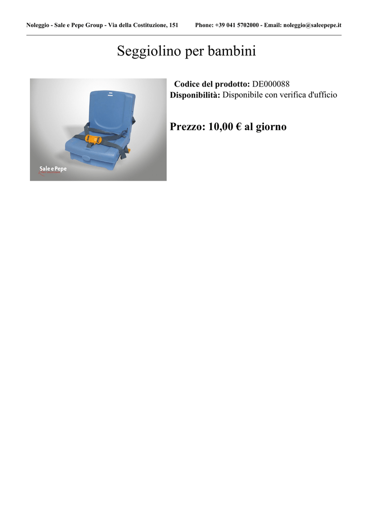 Noleggio - Sale e Pepe Group - Via della Costituzione, 151 Phone: +39 041 5702000 - Email: [email protected] Seggiolino per bambini Codice del prodotto: DE000088 Disponibilità: Disponibile con verifica d'ufficio Prezzo: 10,00 € al giorno Powered by TCPDF (www.tcpdf.org)