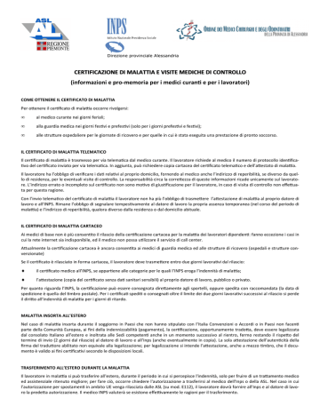 Direzione provinciale Alessandria CERTIFICAZIONE DI MALATTIA E VISITE MEDICHE DI CONTROLLO (informazioni e pro-memoria per i medici curan! e per i lavoratori) COME OTTENERE IL CERTIFICATO DI MALATTIA Per o enere il cer ficato di mala a occorre rivolgersi: • al medico curante nei giorni feriali; • alla guardia medica nei giorni fes vi e prefes vi (solo per i giorni prefes vi e fes vi); • alle stru ure ospedaliere per le giornate di ricovero e per quelle in cui è stata eseguita una prestazione di pronto soccorso. IL CERTIFICATO DI MALATTIA TELEMATICO Il cer ficato di mala a è trasmesso per via telema ca dal medico curante. Il lavoratore richiede al medico il numero di protocollo iden ficavo del cer ficato inviato per via telema ca. In aggiunta, può richiedere copia cartacea del cer ficato telema co e dell’a estato di mala a. Il lavoratore ha l’obbligo di verificare i da rela vi al proprio domicilio, fornendo al medico anche l’indirizzo di reperibilità, se diverso da quello di residenza, per le eventuali visite di controllo. La responsabilità circa la corre ezza di queste informazioni ricade unicamente sul lavoratore. L’indirizzo errato o incompleto sul cer ficato non sono mo vo di gius ficazione per il lavoratore, in caso di visita di controllo non effe uata per questa ragione. Con l’invio telema co del cer ficato di mala a il lavoratore non ha più l’obbligo di trasme ere l’a estazione di mala a al proprio datore di lavoro e all’INPS. Rimane l’obbligo di segnalare tempes vamente al datore di lavoro la propria assenza temporanea (nel corso del periodo di mala a) e l’indirizzo di reperibilità, qualora diverso dalla residenza o dal domicilio abituale. IL CERTIFICATO DI MALATTIA CARTACEO Ai medici di base non è più consen to il rilascio della cer ficazione cartacea per la mala a dei lavoratori dipenden : fanno eccezione i casi in cui la rete internet sia indisponibile, ed il medico non possa u lizzare il servizio di call center. A ualmente la cer ficazione cartacea è ancora consen ta ai medici di guardia medica ed alle stru ure di ricovero (ospedali e stru ure convenzionate) Se il cer ficato è rilasciato in forma cartacea, il lavoratore deve trasme ere entro due giorni lavora vi dal rilascio: ♦ il cer ficato medico all’INPS, se appar ene alle categorie per le quali l’INPS eroga l’indennità di mala a; ♦ l’a estazione (copia del cer ficato senza da sanitari sensibili) al proprio datore di lavoro, pubblico o privato. Per quanto riguarda l’INPS, la cer ficazione può essere consegnata dire amente agli sportelli, oppure spedita con raccomandata (la data di spedizione è quella del mbro postale). Per i cer fica spedi o consegna oltre il limite dei due giorni lavora vi successivi al rilascio si perde il diri o all’indennità di mala a per i giorni di ritardo. MALATTIA INSORTA ALL’ESTERO Nel caso di mala a insorta durante il soggiorno in Paesi che non hanno s pulato con l’Italia Convenzioni o Accordi o in Paesi non facen parte della Comunità Europea, ai fini della indennizzabilità (pagamento), la cer ficazione, opportunamente trado a, deve essere legalizzata dal consolato Italiano all’estero e inoltrata alle Sedi competen anche in un momento successivo al rientro, fermo restando il rispe o del termine di invio (2 giorni dal rilascio) al datore di lavoro e all’Inps (anche eventualmente in copia). La sola a estazione dell’auten cità della firma del tradu ore abilitato non equivale alla legalizzazione; per legalizzazione si intende l’a estazione, anche a mezzo mbro, che il documento è valido ai fini cer fica vi secondo le disposizioni locali. TRASFERIMENTO ALL’ESTERO DURANTE LA MALATTIA Il lavoratore in mala a si può trasferire all'estero, durante il periodo in cui si percepisce l'indennità, solo per fruire di un tra amento medico ed assistenziale ritenuto migliore; per fare ciò, occorre chiedere l'autorizzazione a trasferirsi al medico dell'Inps o della ASL. Nel caso in cui l'autorizzazione per spostamen in ambito UE venga rilasciata dalle ASL (su mod. E112), il lavoratore dovrà fornire all'Inps e al datore di lavoro la prede a autorizzazione. Il medico INPS valuterà se esistono effe vamente le ragioni per il trasferimento. REPERIBILITA’ Il lavoratore, durante la mala a, e' tenuto a rispe are le seguen fasce di reperibilità le eventuali visite mediche di controllo domiciliare richieste dal datore di lavoro o disposte dall’Inps: tu i giorni, compresi i fes vi, dalle ore 10 alle ore 12 e dalle ore 17 alle ore 19 Il lavoratore pubblico è so oposto ad un diverso regime orario di reperibilità: tu ore 15 alle ore 18 i giorni, compresi i fes vi dalle ore 9 alle ore 13 e dalle L'obbligo delle fasce di reperibilità è generale ed inderogabile e pertanto nessuno può rilasciare autorizzazioni preven ve a non rispe are le fasce, e non esistono patologie che esimano dal rispe o di questo obbligo. La preven va comunicazione dell'assicurato all'INPS del proprio allontanamento dal domicilio durante le fasce non garan sce la non effe uazione del controllo d'ufficio o su richiesta del datore di lavoro e non vale di per se a gius ficare l'eventuale assenza rilevata. Il lavoratore, durante le fasce di reperibilità, oltre a rimanere a casa, deve collaborare fa vamente per consen re la regolare effe uazione della visita di controllo (ad esempio, controllare il buon funzionamento del citofono e del campanello, verificare che sul citofono sia indicato il cognome del lavoratore in mala a, etc.). Se, nel corso della mala a, il lavoratore si sposta in un luogo diverso dal domicilio indicato sul cer ficato medico, deve informare preven vamente e tempes vamente l'INPS e il datore di lavoro. LA VISITA MEDICA DI CONTROLLO La visita medica di controllo può essere richiesta dal datore di lavoro, o disposta dall’INPS ed è effe uata dai medici fiscali dell’INPS e delle ASL. Una stessa mala a può essere controllata più volte durante il periodo d