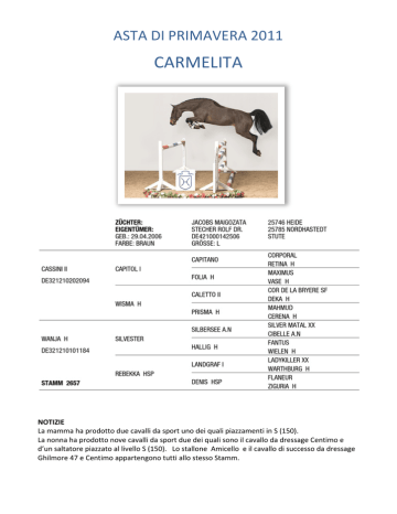 ASTA DI PRIMAVERA 2011 CARMELITA NOTIZIE La mamma ha prodotto due cavalli da sport uno dei quali piazzamenti in S (150). La nonna ha prodotto nove cavalli da sport due dei quali sono il cavallo da dressage Centimo e d’un saltatore piazzato al livello S (150). Lo stallone Amicello e il cavallo di successo da dressage Ghilmore 47 e Centimo appartengono tutti allo stesso Stamm.