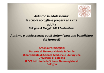 Autismo in adolescenza: la scuola accoglie e prepara alla vita adulta Bologna, 4 Maggio 2013 Teatro Duse Autismo e adolescenza: quali sintomi possono beneficiare dei farmaci? Antonia Parmeggiani Docente di Neuropsichiatria Infantile Dipartimento di Scienze Mediche e Chirurgiche Università di Bologna IRCCS Istituto delle Scienze Neurologiche di Bologna DSM-5 New name for category, autism spectrum disorder, which includes: autistic disorder (autism), Asperger’s disorder, childhood disintegrative disorder, and pervasive developmental disorder not otherwise specified. • Differentiation of autism spectrum disorder from typical development and other "nonspectrum" disorders is done reliably and with validity; while distinctions among disorders have been found to be inconsistent over time… • Because autism is defined by a common set of behaviors, it is best represented as a single diagnostic category… DSM-5 Autism Spectrum Disorders must meet criteria 1, 2, and 3: • 1. Clinically significant, persistent deficits in social communication and interactions, as manifest by all of the following: • a. Marked deficits in nonverbal and verbal communication used for social interaction: • b. Lack of social reciprocity; • c. Failure to develop and maintain peer relationships appropriate to developmental level • 2. Restricted, repetitive patterns of behavior, interests, and activities, as manifested by at least TWO of the following: • a. Stereotyped motor or verbal behaviors, or unusual sensory behaviors • b. Excessive adherence to routines and ritualized patterns of behavior • c. Restricted, fixated interests • 3. Symptoms must be present in early childhood (but may not become fully manifest until social demands exceed limited capacities) Evoluzione • Modificazioni comportamento con l’età (possibile miglioramento) • Adolescenza, età giovane-adulta momento critico • Persistenza del deficit di comunicazione anche se l’isolamento può essere meno importante • Stereotipie ridotte, persistenza di posture e atteggiamenti bizzarri, di tratti ossessivi e compulsivi • Alcuni soggetti con autismo lieve migliorano indipendentemente dal trattamento; altri non migliorano anche se il trattamento è intensivo Trattamenti • Individualizzato, flessibile, continuativo, globale • Coinvolgimento sistematico dei familiari, della scuola • Tiene conto dell’età, della sintomatologia, delle abilità, delle capacità di comunicazione, del contesto ambientale e delle comorbidità • Trattamenti integrati PSICO - EDUCATIVI • Comportamentali • Cognitivo-comportamentali FARMACOLOGICI (sintomatici) Manifestazioni e disturbi associati • Ritardo mentale • Disarmonie nello sviluppo delle capacità cognitive • Anomalie dell’alimentazione • Disturbi gastrointestinali • Disturbi del sonno • Anomalie comportamentali • Disturbi dell’umore e dell’affettività • Epilessia • Disturbi del movimento Il riconoscimento di altre patologie associate è importante: • Patologie mediche associate possono influire negativamente sul comportamento e la qualità di vita del paziente • Spesso sussiste un legame tra patologie come per es. tra i disturbi alimentari e quelli gastrointestinali, ecc. • Individuare sottogruppi con fenotipo/genotipo simile (?) → comprensione cause eziopatogenetiche (?) LA TERAPIA FARMACOLOGICA Non ci sono farmaci in grado di “curare” l’autismo però esistono farmaci che possono agire positivamente su alcuni sintomi I farmaci possono completare e incrementare l’efficacia di un trattamento riabilitativo E’ indispensabile prescrivere una terapia, se necessaria, nell’interesse del paziente e della famiglia seguendo posologia e modalità di somministrazione prescritte Familiari, tutori e operatori devono essere informati su rischi e benefici Può essere necessario il consenso informato LA TERAPIA FARMACOLOGICA Trattamento farmacologico deve essere preceduto da un’analisi funzionale del disturbo Effetto sul sintomo: iperattività, inattenzione, aggressività, compulsioni, rituali, alterazioni dell’umore, irritabilità, disturbi del sonno, epilessia Conoscere effetti collaterali Effetti del farmaco possono essere differenti a seconda del caso: età, livello cognitivo, altri problemi neurologici associati LA TERAPIA FARMACOLOGICA: risultati • Miglioramento qualità della vita • Facilitazione al trattamento riabilitativo • Potenziamento effetti trattamento riabilitativo • Effetto su comorbidità Circa 1/3 dei bambini con disabilità dello sviluppo può presentare un disturbo dell’alimentazione Incapacità di alimentarsi autonomamente Comportamenti inappropriati durante alimentazione Selettività alimentare Dal 46 all’89% dei soggetti con DSA presentano un disturbo dell’alimentazione: Preferenza per il cibo sulla base del tipo, consistenza, colore, confezione Consumo di qualità e quantità ristrette di cibo Comportamenti patologici in occasione del pasto Più frequenti disturbi dell’alimentazione nei DSA • Pochi studi in letteratura sull’argomento • Selettività alimentare (70%): tipo, temperatura, consistenza, marca, colore del cibo • Evitamento liquidi • Mantenere il cibo in bocca per lungo tempo • Voracità • Alimentazione difficoltosa • Rifiuto frequente del cibo Disturbi gastrointestinali • Presenti dal 9% a più del 70% dei casi con DSA • Per alcuni non differenze significative con casi controllo (Ibrahim et al., 2009) • Più frequenti: stipsi cronica, dolori addominali ± diarrea, encopresi, RGE, meteorismo, deficit disaccaridasi, colon irritabile, gastrite, esofagite, celiachia, m. di Crohn, ecc. • Eziopatogenesi non definita • Possibilità di effetti a livello comportamentale ( per es. irritabilità, auto ed etero aggressività, aumento stereotipie), sul sonno, sul comportamento alimentare • Utilizzo di diete prive di glutine e/o caseina con effetto su comportamento (non dati confermati 