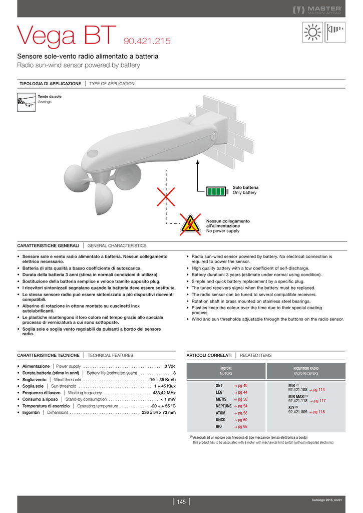 Vega BT 90.421.215 Sensore sole-vento radio alimentato a batteria Radio sun-wind sensor powered by battery | TIPOLOGIA DI APPLICAZIONE TYPE OF APPLICATION Tende da sole Awnings Solo batteria Only battery Nessun collegamento all’alimentazione No power supply CARATTERISTICHE GENERALI | GENERAL CHARACTERISTICS • Sensore sole e vento radio alimentato a batteria. Nessun collegamento elettrico necessario. • Radio sun-wind sensor powered by battery. No electrical connection is required to power the sensor. • Batteria di alta qualità a basso coefficiente di autoscarica. • High quality battery with a low coefficient of self-discharge. • Durata della batteria 3 anni (stima in normali condizioni di utilizzo). • Battery duration: 3 years (estimate under normal using condition). • Sostituzione della batteria semplice e veloce tramite apposito plug. • Simple and quick battery replacement by a specific plug. • I ricevitori sintonizzati segnalano quando la batteria deve essere sostituita. • The tuned receivers signal when the battery must be replaced. • Lo stesso sensore radio può essere sintonizzato a più dispositivi riceventi compatibili. • The radio sensor can be tuned to several compatible receivers. • Alberino di rotazione in ottone montato su cuscinetti inox autolubrificanti. • Plastics keep the colour over the time due to their special coating process. • Le plastiche mantengono il loro colore nel tempo grazie allo speciale processo di verniciatura a cui sono sottoposte. • Wind and sun thresholds adjustable through the buttons on the radio sensor. • Soglia sole e soglia vento regolabili da pulsanti a bordo del sensore radio. CARATTERISTICHE TECNICHE • Alimentazione | • Rotation shaft in brass mounted on stainless steel bearings. TECHNICAL FEATURES ARTICOLI CORRELATI | Power supply . . . . . . . . . . . . . . . . . . . . . . . . . . . . . . . . . . . . 3 Vdc | Battery life (estimated years) . . . . . . . . . . . . . . . 3 | RELATED ITEMS MOTORI MOTORS • Durata batteria (stima in anni) | Wind threshold . . . . . . . . . . . . . . . . . . . . . . . . . . . . . 10 ÷ 35 Km/h | Sun threshold . . . . . . . . . . . . . . . . . . . . . . . . . . . . . . . . . 1 ÷ 45 Klux • Frequenza di lavoro | Working frequency . . . . . . . . . . . . . . . . . . . . . 433,42 MHz • Consumo a riposo | Stand-by consumption . . . . . . . . . . . . . . . . . . . . . . . < 1 mW • Temperatura di esercizio | Operating temperature . . . . . . . . . . . . . -20 ÷ + 55 °C •Ingombri | Dimensions . . . . . . . . . . . . . . . . . . . . . . . . . . . . . . . 236 x 54 x 73 mm RICEVITORI RADIO RADIO RECEIVERS • Soglia vento • Soglia sole SET pg 40 LEG pg 44 METIS pg 50 NEPTUNE pg 54 (1) | 145 | ATOM pg 58 UNCO pg 60 IRO pg 66 MIR (1) 92.421.108 pg 114 MIR MAXI (1) 92.421.118 pg 117 SLY (1) 92.421.809 pg 118 Associati ad un motore con finecorsa di tipo meccanico (senza elettronica a bordo) This product has to be associated with a motor with mechanical limit switch (without integrated electronic) Catalogo 2016_rev01