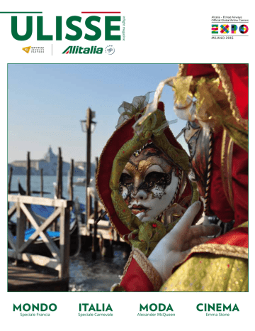 inflight magazine ULISSE MONDO Speciale Francia ITALIA Speciale Carnevale MODA Alexander McQueen CINEMA Emma Stone IMPERIALE LONDON 8-10, Hans Road - SW3 1RX MOSCOW Bolshaya Dmitrovka 20/1 - 107031 NEW YORK th The Plaza - 5 Avenue at Central Park South - NY 10019 MILANO Corso Matteotti 8 - 20121 WHOLESALE [email protected] angelogalasso.com EDITORIALE “DIETRO QUESTA MASCHERA C’È UN UOMO E TU LO SAI! / L’UOMO DI UNA STRADA CHE È LA STESSA CHE TU FAI. / E MI TRUCCO PERCHÉ LA VITA MIA / NON MI RICONOSCA E VADA VIA”. (Renato Zero, “La Favola Mia”) Ho voluto iniziare il mio editoriale con il ritornello di una canzone di Renato Zero che meglio rappresenta lo speciale dedicato su questo numero al Carnevale, una festa che coinvolge buona parte del nostro pianeta, un momento goliardico che ci permette di essere, anche per un solo istante, un’altra persona o un personaggio anche lontano dal nostro modo di essere e di vivere. Sono tanti i carnevali che vengono celebrati nel mondo e Ulisse, in questo numero, vi racconta i più importanti, a partire da quello di Rio de Janeiro che coinvolge un intero popolo e che colora le notti di questo periodo a ritmo di samba, al Carnevale di Venezia, forse il più antico e il più folcloristico, che rivisita questo evento attraverso abiti stupendi della tradizione storica, a quello di Viareggio, caratterizzato da carri a tema che colorano le strade della città. Vengono poi raccontati anche altri carnevali, per ricordarvi di sorridere più spesso e di regalarvi ogni tanto una sana risata affinché il vostro modo di affrontare la vita diventi quanto meno più leggero. Oltre a questo, Ulisse vi offre uno speciale sulla Francia, raccontandovi quanto di meglio possiate vedere e visitare in questo Paese, un’intervista a Emma Stone interprete del film corale “Birdman” e, per chiudere, uno speciale dedicato al fitness, con lo scopo di offrivi una mini guida - anche storica - per darvi la possibilità di allenarvi durante i vostri viaggi. Questo e tanto altro sul numero di febbraio, ma lascio scoprire a voi i nostri contenuti. Buon volo a tutti. “BEHIND THIS MASK THERE IS A MAN, AND YOU KNOW IT! / THE MAN ON THE SAME ROAD AS YOURS. / AND I WEAR MAKE-UP SO THAT MY LIFE / WON’T RECOGNISE ME AND RUN AWAY”. (Renato Zero, La Favola Mia - My Fable). Paolo Gelmi I wanted to begin my editorial with the chorus from a song by Renato Zero that best represents this number’s special feature on Carnival, a festival that involves a large part of our planet, a friendly time that allows us, if just for a moment, to be another person or a character far removed from our way of life. Many carnivals are celebrated across the world, and this issue of Ulisse tells you about the most important ones, from Rio de Janeiro, which involves an entire people and colours the nights to the rhythm of samba, to the Carnival of Venice, perhaps the oldest and most folkloric, which revisits this event through beautiful costumes of historical tradition, to Viareggio, featuring themed floats that bedeck the streets of the city. Other “carnivals” are also shown, a reminder to smile more often and have a good laugh every now and then, to face life with a lighter heart. In addition, Ulisse offers a special on France, with the best the country has to see and do; an interview with Emma Stone, a member of the ensemble cast of “Birdman”; and in closing, a fitness special, a historical mini-guide for training while you travel. The February issue has all this and much more, but I’ll leave you to discover our content. Happy flying to all. UN'ELEGANZA SENZA TEMPO Rayne, il brand che nasce nell’omonimo calzaturificio inglese nel 1885 dalla creatività di Henry e Mary Rayne, si contraddistingue per l’attenzione nella cura dei dettagli e scelta dei tessuti e dei pellami lavorati. Ha conquistato tra gli altri la Casa Reale inglese, vestendo i piedi di generazioni di principesse, tra cui Lady Diana. Oggi la nuova collezione S/S 2015, interamente Made in Italy, si presenta come simbolo di eleganza, ma sempre in linea con le ultime tendenze. Il tema predominante è quello floreale, ricamato sullo stivale, a rilievo sul tacco del sandalo o della décolleté. Ieri come oggi, rappresenta un ‘must have’ per una donna moderna ed elegante, donando un’immagine chic con un orgoglioso richiamo allo splendore della tradizione inglese. TIMELESS ELEGANCE The Rayne brand, begun as a shoemaker’s in England in 1885 under the creativity of Henry and Mary Rayne, is distinguished by detail and the choice of fine fabrics and leathers. It also won over the British royal house, fitting shoes for generations of princesses, including Diana. The 2015 spring-summer collection, entirely Made in Italy, is a symbol of elegance, always in line with new trends. Flowers are the theme, embroidered on boots, or in relief on sandals or heels. Now as then, a “must-have” for the modern, elegant woman, lending an air of chic with proud recollections of Britain’s splendid tradition. 6 ULISSE FEBBRAIO 2015 SOMMARIO ULISSE Rivista mensile di bordo Anno XXXVII n. 363 Febbraio 2015 EDITORE ALITALIA Società Aerea Italiana S.p.A. Via Alberto Nassetti 00054 Fiumicino (RM) Reg. Trib. Roma n.16917/77 del 3/8/77 PARTNER EDITORIALE PRODOTTI EDITORIALI INTERNAZIONALI S.R.L. Via Mecenate, 76 int.32/34 20138 Milano Tel. 02/83.43.79.50 DIREZIONE EDITORIALE Antonella Zivillica DIRETTORE RESPONSABILE Paolo Gelmi [email protected] REDAZIONE Caporedattore Tommaso Toma Coordinamento Agenda Chiara Brollo Fashion Editor Roberto Ciapani Segreteria Francesca Napolitano REDAZIONE MILANO Via Mecenate, 76 int.32/34 20138 Milano Tel. 02/83.43.79.50 REDAZIONE AZ& Rosita Di Bernardo [email protected] PROGETTO GRAFICO KYTORI www.kytori.com ART DIRECTOR Andrea Minoia GRAFICA Laura Pozzoni Michele Magistrini PHOTO EDITOR Carlo Sessa HANNO COLLABORATO/THANK YOU: Claudio e Corinna Agostoni, Stefania Benzo, Francesco Chiappetta, Giorgio Cri