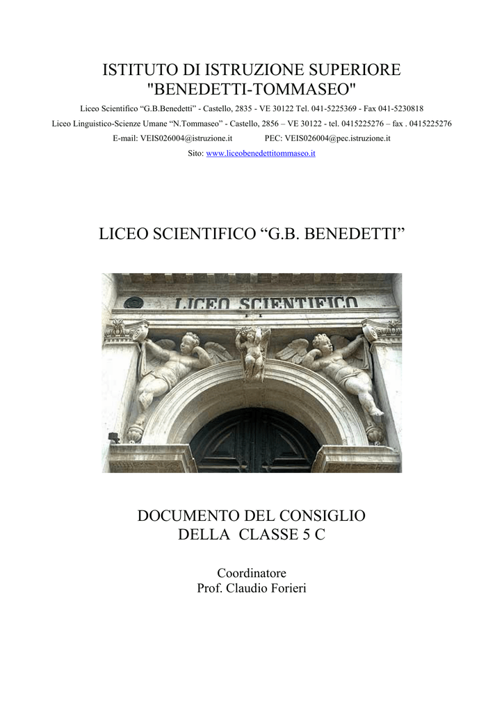 ISTITUTO DI ISTRUZIONE SUPERIORE "BENEDETTI-TOMMASEO" Liceo Scientifico “G.B.Benedetti” - Castello, 2835 - VE 30122 Tel. 041-5225369 - Fax 041-5230818 Liceo Linguistico-Scienze Umane “N.Tommaseo” - Castello, 2856 – VE 30122 - tel. 0415225276 – fax . 0415225276 E-mail: [email protected] PEC: [email protected] Sito: www.liceobenedettitommaseo.it LICEO SCIENTIFICO “G.B. BENEDETTI” DOCUMENTO DEL CONSIGLIO DELLA CLASSE 5 C Coordinatore Prof. Claudio Forieri Liceo Scientifico “G.B Benedetti” DOCUMENTO DEL CONSIGLIO DI CLASSE Classe 5 C Anno scolastico 2014/2015 DIRIGENTE SCOLASTICO : Prof. Roberto Sintini Docenti Disciplina DEGLI ESPOSTI RITA Italiano e Latino CAMPI MATTEO Storia e Filosofia ZERNITZ MICHELA Inglese FORIERI CLAUDIO Matematica e Fisica ROSSI ALESSANDRA Scienze TROILO MARIA GABRIELLA Disegno e Storia dell’Arte CESCO FRARE FRANCESCO Scienze Motorie DARISI MICHELE Religione 1. STORIA DELLA CLASSE La classe è composta alla fine di questo anno scolastico, da 21 studenti (13 maschi e 8 femmine) e appare normalmente eterogenea come livello di conoscenza e competenza acquisito. Nel corso del triennio la classe ha subito, dal punto di vista numerico, poche variazioni, come si può rilevare dalla sotto indicata tabella. Classe Anno Scolastico Numero Alunni Promossi Promossi con sospensione Respinti Ritirati o Trasferiti III C 2012/2013 22 21 2 1 0 IV C 2013/2014 21 21 3 0 0 VC 2014/2015 21 E’ necessario sottolineare che in questo anno scolastico giungono al termine del Liceo le classi che per prime hanno sperimentato la riforma della scuola superiore, che ha comportato un adattamento da parte dei docenti che hanno dovuto rivedere, in qualche caso in modo molto significativo, metodi e contenuti. In alcune discipline è stato necessario effettuare una scelta rispetto alla mole di contenuti disciplinari che dopo la riforma dovrebbero essere proposti. Questo è stato particolarmente vero per Matematica e Fisica, per le quali era richiesto che venissero trattati gli stessi argomenti del Piano Nazionale per l’Informatica, con un monte ore complessivo molto ridotto. Importanti contrazioni ci sono state anche per Storia (riduzione del 33% del monteore) e per Lingua Straniera-Inglese (riduzione del 25%). Con solo due ore settimanali, il docente si è visto costretto a ridurre il periodo storico trattato, mentre la docente d’Inglese ha provveduto per necessità a una scelta degli argomenti svolti. Nonostante tale compressione oraria, il Consiglio di Classe si è attivato per realizzare due moduli di Storia in CLIL (vedi relazioni individuali di Inglese e di Storia). La classe comunque ha risposto bene alle difficoltà che il processo di riforma ha comportato ed è sempre stata disponibile al dialogo educativo e didattico. L’impegno costante e il corretto comportamento hanno favorito lo svolgimento delle lezioni in un’atmosfera serena e proficua. Anche gli allievi che, a causa di un esito negativo dell’anno scolastico, erano inseriti provenendo da classi con il vecchio ordinamento, sono riusciti comunque a raggiungere almeno gli obiettivi minimi. Alcuni studenti hanno dimostrato buone, talora ottime, capacità nel riconoscere e istituire corretti nessi analogici, nei vari ambiti disciplinari, fra tematiche e fenomeni diversi. Ora, giunti a conclusione del percorso scolastico, la classe presenta ancora debolezze nella conoscenza di alcune materie, diverse da studente a studente, come appare indicato nelle relazioni di ciascuna disciplina qui di seguito riportate. In genere le capacità espositive sono migliorate. 2. CONTINUITA’ DIDATTICA NEL TRIENNIO La continuità didattica nel triennio è stata garantita in quasi tutte le discipline, come si evince dalla sotto indicata tabella: Classe III Classe IV Classe V a.s.2012/13 a.s. 2013/14 a.s. 2014/15 Italiano Degli Esposti Rita Degli Esposti Rita Degli Esposti Rita Latino Degli Esposti Rita Degli Esposti Rita Degli Esposti Rita Inglese Zernitz Michela Zernitz Michela Zernitz Michela Matematica e Fisica Forieri Claudio Forieri Claudio Forieri Claudio Disegno e Storia dell’arte Troilo Maria Gabriella Troilo Maria Gabriella Troilo Maria Gabriella Scienze Rossi Alessandra Rossi Alessandra Rossi Alessandra Storia e Filosofia Ferro Cristina Ferro Cristina Campi Matteo Religione Darisi Michele Darisi Michele Darisi Michele Educ. Fisica Cesco Frare Francesco Cesco Frare Francesco Cesco Frare Francesco DISCIPLINE 3. OBIETTIVI GENERALI (EDUCATIVI E FORMATIVI) RAGGIUNTI Il Consiglio di Classe si era prefissato come obiettivo generale quello di favorire la formazione educativa e culturale degli studenti, con l’acquisizione di conoscenze e competenze necessarie al proseguimento degli studi. Obiettivi minimi capacità di esprimersi in modo semplice, comprensibile, sostanzialmente corretto; conoscenza delle linee fondamentali delle tematiche affrontate; capacità di assimilazione e di comprensione globale dei contenuti. Obiettivi intermedi capacità di esprimersi in modo chiaro e corretto; conoscenza sicura dei contenuti; capacità di rielaborare le nozioni e di cogliere in modo abbastanza agile i nessi tematici. Obiettivi massimi capacità di esprimersi con un linguaggio preciso, ordinato e ricco nel lessico; conoscenza accurata dei contenuti, sostenuta anche da apporti personali; capacità di rielaborare in modo efficace i contenuti e di costruire un autonomo percorso critico anche in chiave interdisciplinare. Tutti gli studenti hanno raggiunto almeno gli obiettivi minimi, anche se alcuni studenti hanno avuto bisogno di un tempo maggiore per consolidare le competenze. Un secondo gruppo molto interessato, ma più intuitivo che metodico ha ottenuto livelli molto buoni di competenze che sa usare in modo intelligente e personale. Alcuni studenti hanno raggiunti livelli di eccellenza, dimostrando di aver sviluppato autonomia di giudizio e spirito critico. 4. CONOSCENZE, COMPETENZE E CAPACITÀ RELATIVE AL COMPLESSO DELLE DISCIPLINE 